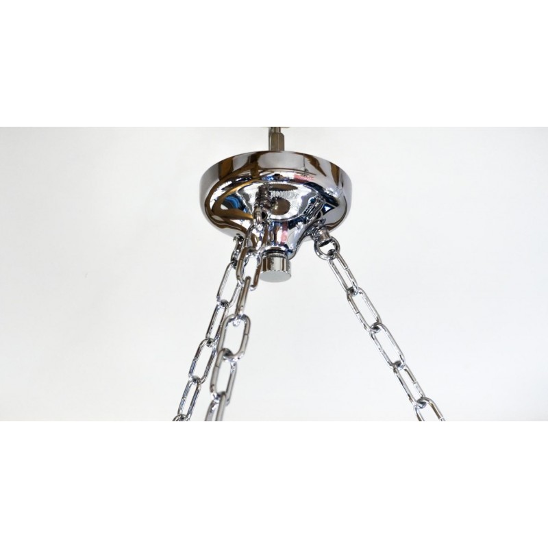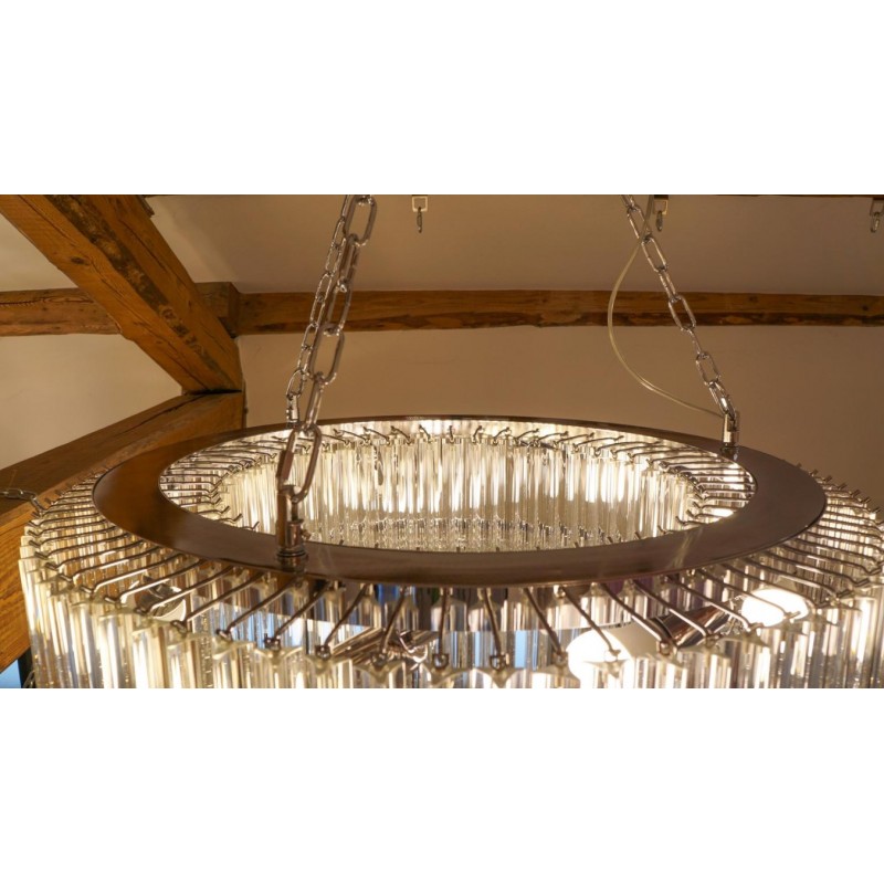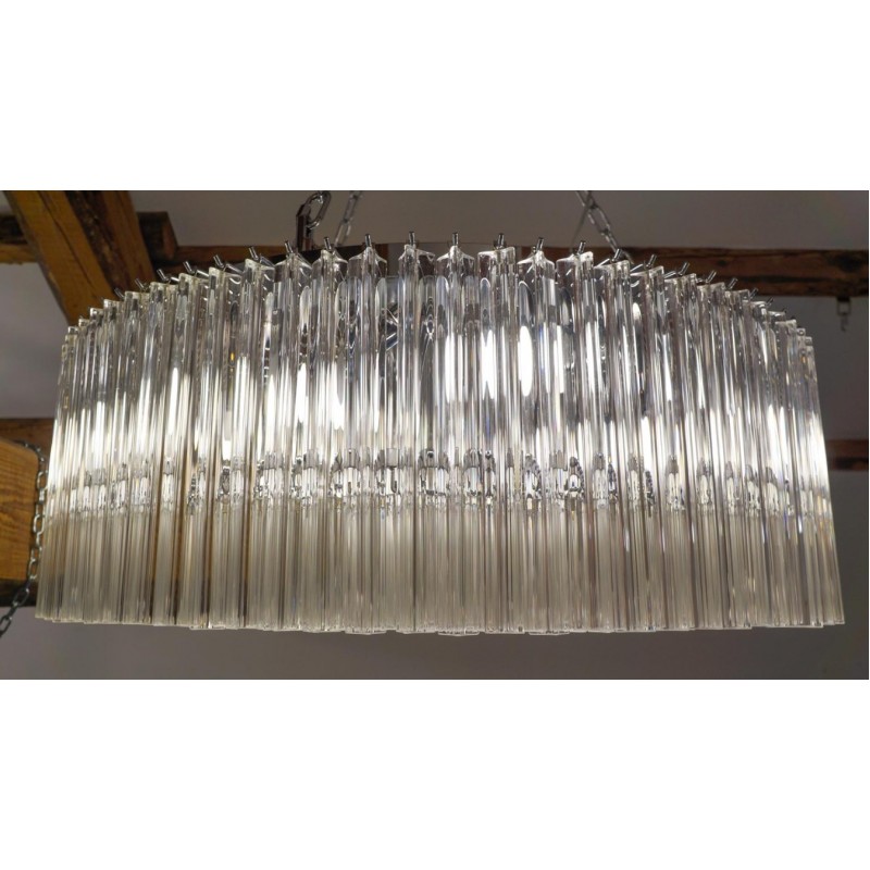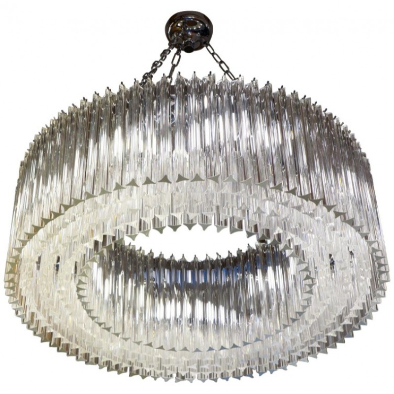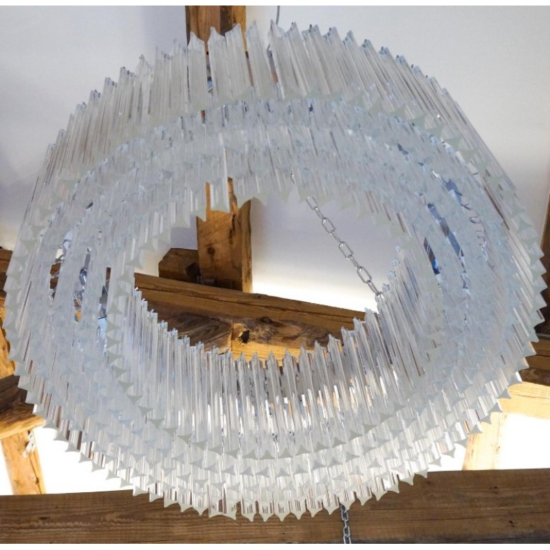 Murano glass chandelier with 370 elements in crystal, nickel finish structure and nine E26 / E27 bulbs. The elements of this typical chandelier are called Triedri, for its triangular shape. The assistants take a small quantity of glass from the oven. Being its consistence like honey it gives the possibility to stretch and shape it. The whole sophisticated design based on the repetition of the glass elements called "Triedri".Attributed to Venini in 1996.This magnificent work will give light to any environment, spreading elegance and warmth. The original design can create fascinating lighting.