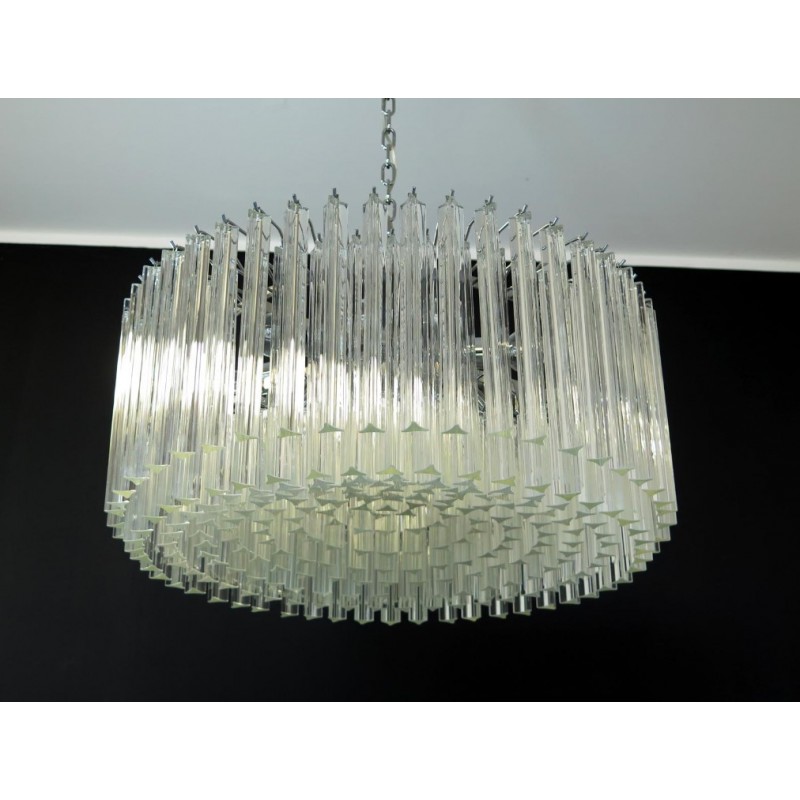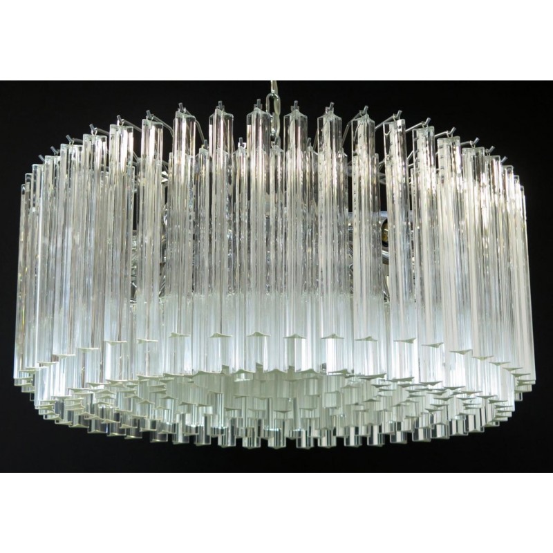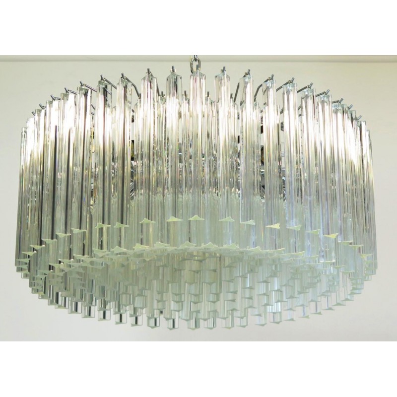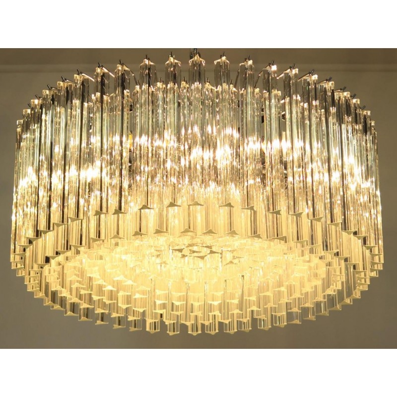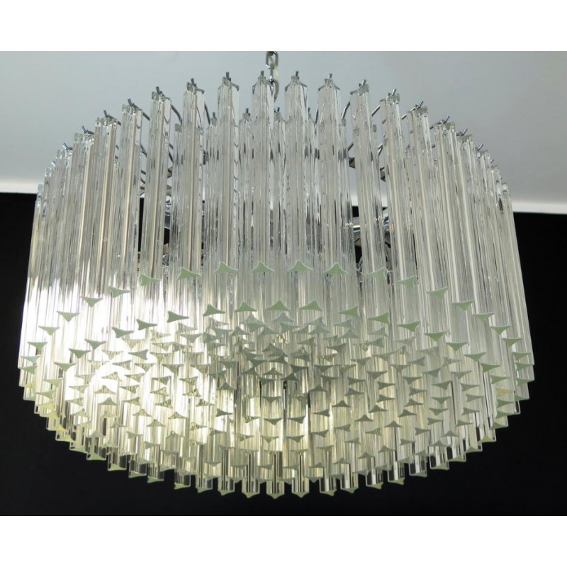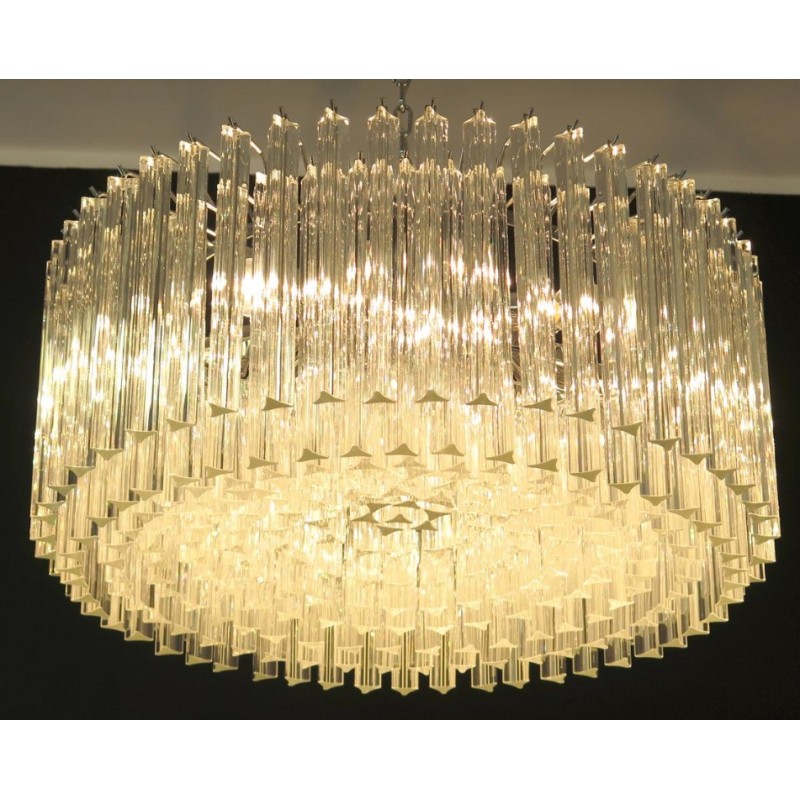 Triedri Murano glass chandelier, 265 trasparent prism. A magnificent Murano glass chandelier, 265 pink triedri on crome frame. This large midcentury Italian chandelier is truly a timeless Classic.An example of glass art in a vertical setting, ideal for huge dining tables that require an overwhelming statement. This chandelier is a unique display of chic design and modern innovation at its finest. The rediscovery of Murano glass as a conductor of magical rare light has pushed designers to define creation within a repertoire of ever-changing materials, making each piece an original work. The natural and precious nature of this glass becomes the first argument of its seductive illumination. Its size, is the second. As broken lines of light streak across every surface, Murano glass brings additional mystery and uniqueness to these creations