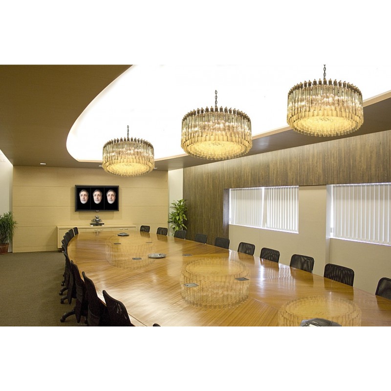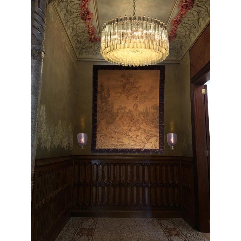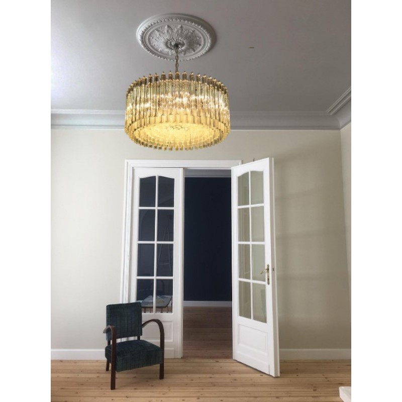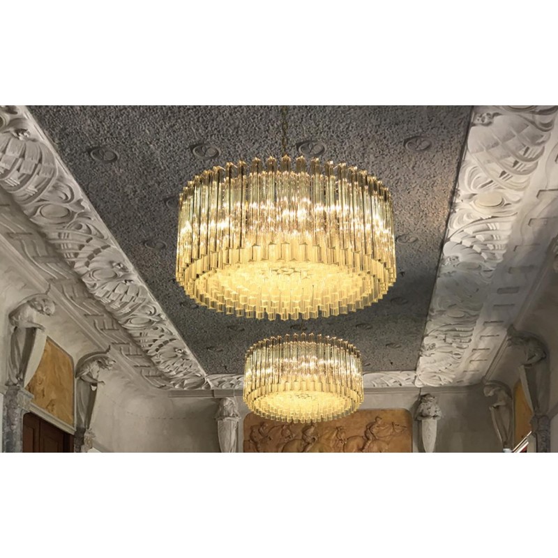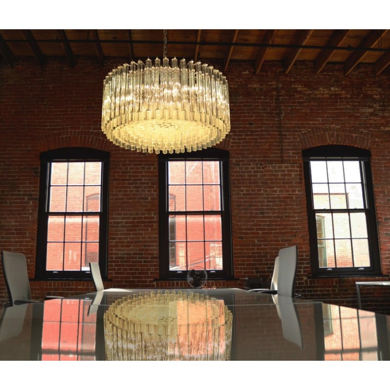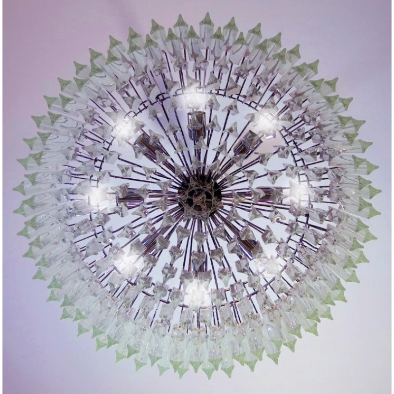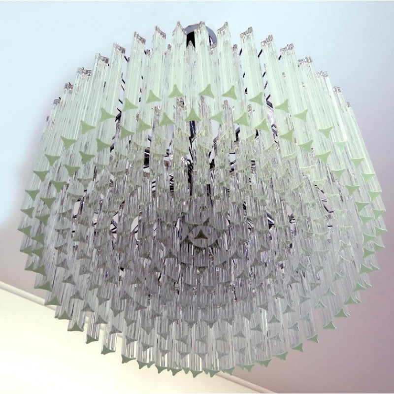 Triedri Murano glass chandelier, 265 trasparent prism. A magnificent Murano glass chandelier, 265 pink triedri on crome frame. This large midcentury Italian chandelier is truly a timeless Classic.An example of glass art in a vertical setting, ideal for huge dining tables that require an overwhelming statement. This chandelier is a unique display of chic design and modern innovation at its finest. The rediscovery of Murano glass as a conductor of magical rare light has pushed designers to define creation within a repertoire of ever-changing materials, making each piece an original work. The natural and precious nature of this glass becomes the first argument of its seductive illumination. Its size, is the second. As broken lines of light streak across every surface, Murano glass brings additional mystery and uniqueness to these creations