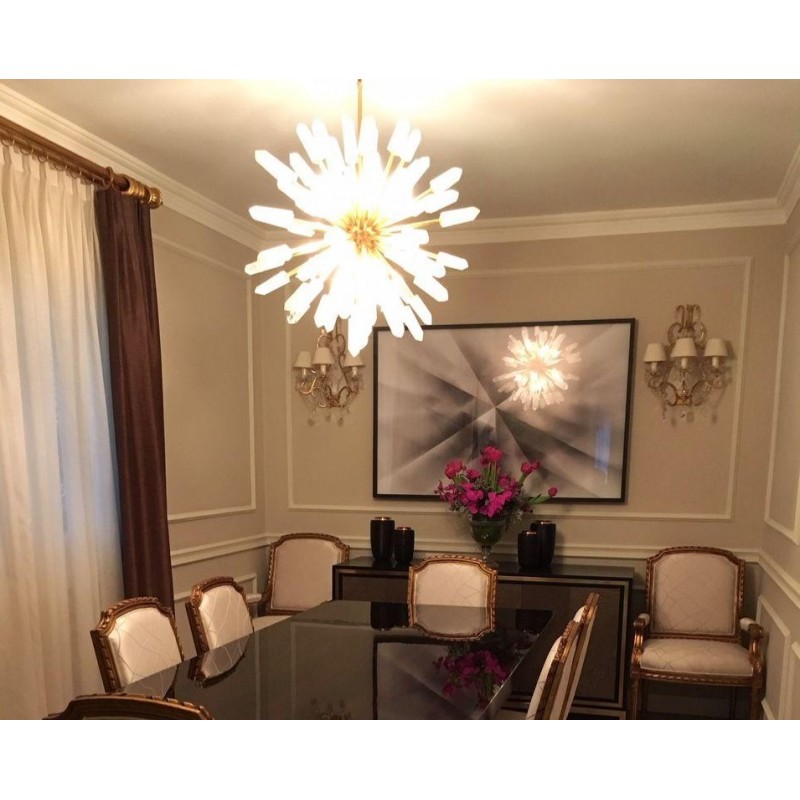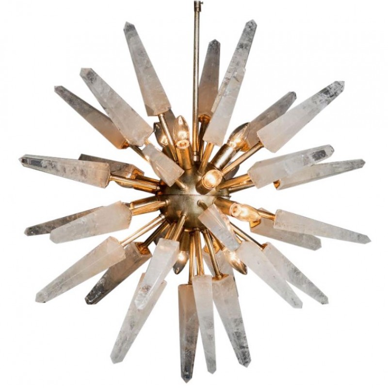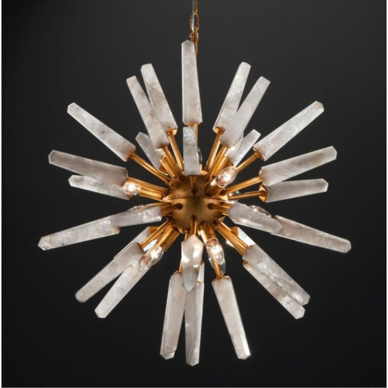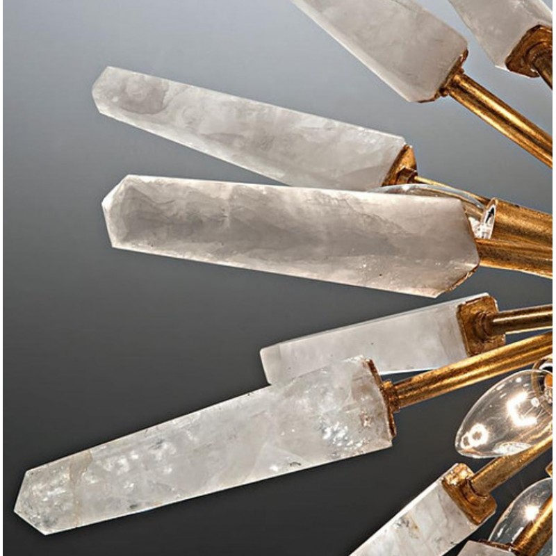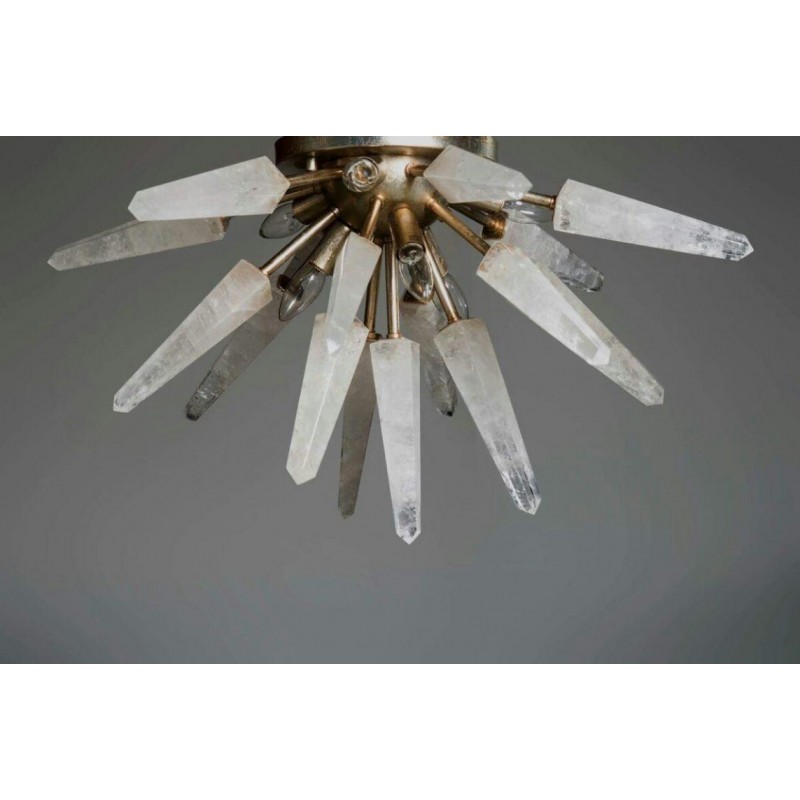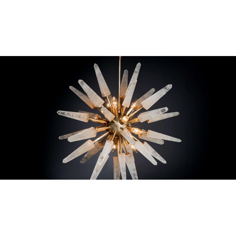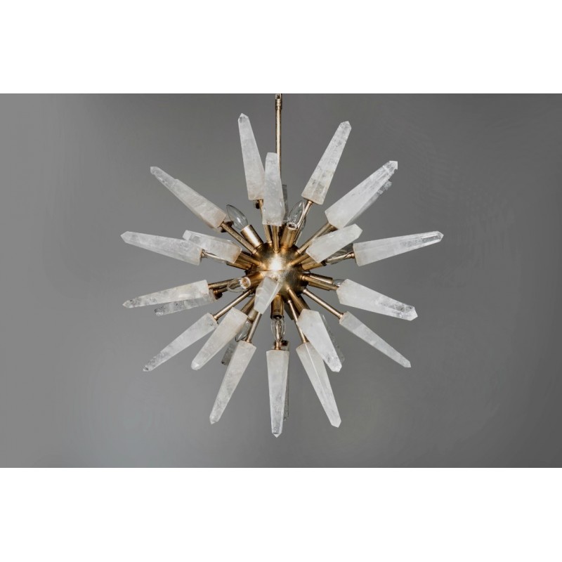 This is our fabulous interpretation of the iconic midcentury Sputnik chandelier, first showcased in Venice in the 1950s. In place of the glass prisms, ours arms are made with natural quartz.Having created custom chandeliers for over three decades, we are specializes in bringing lighting concepts into reality, whether your inspiration comes from a rough sketch, an existing chandelier, our original concepts, or even your own creative imagination. Large or small, our team can meet the challenge, and can even coordinate the production of a private collection, where all finishes are kept consistent. Let us create the perfect lighting fixtures for your individual needs, to your individual specifications, and with attention to detail throughout production.