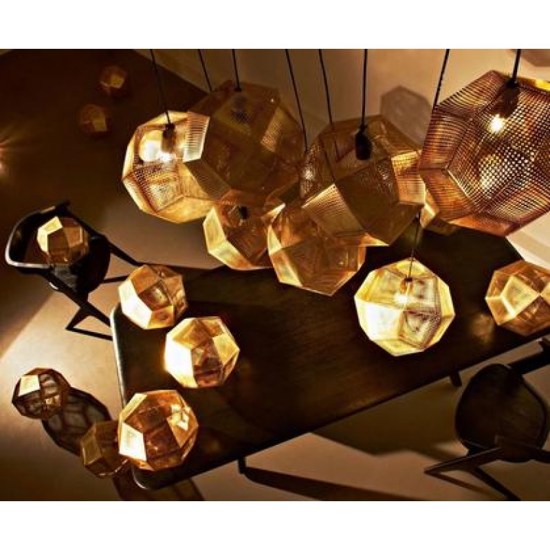 Inspired by the logic of pure mathematics, the Etch range is a series of geodesic structures made of razor-thin digitally etched metal sheets. The pendants and chandelier feature a detailed pattern that casts a mass of intricate shadows when lit.