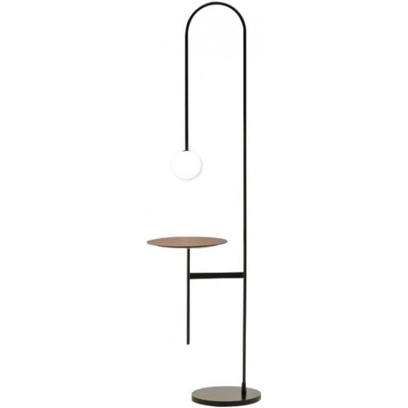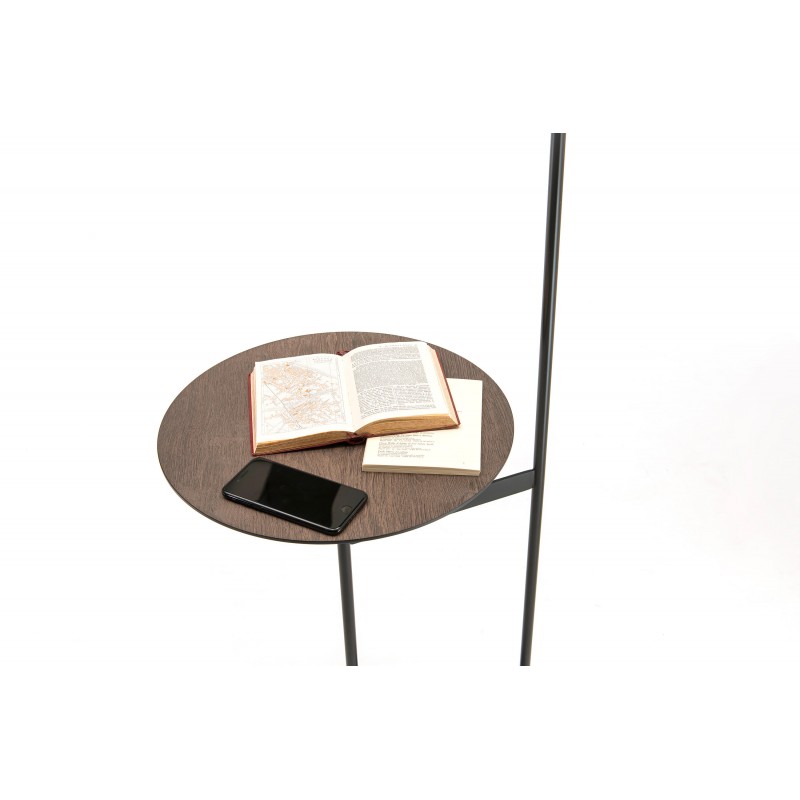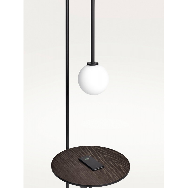 Floor lamp for indoor use with diffused light and integrated small table equipped with wireless charging and touch light switch.