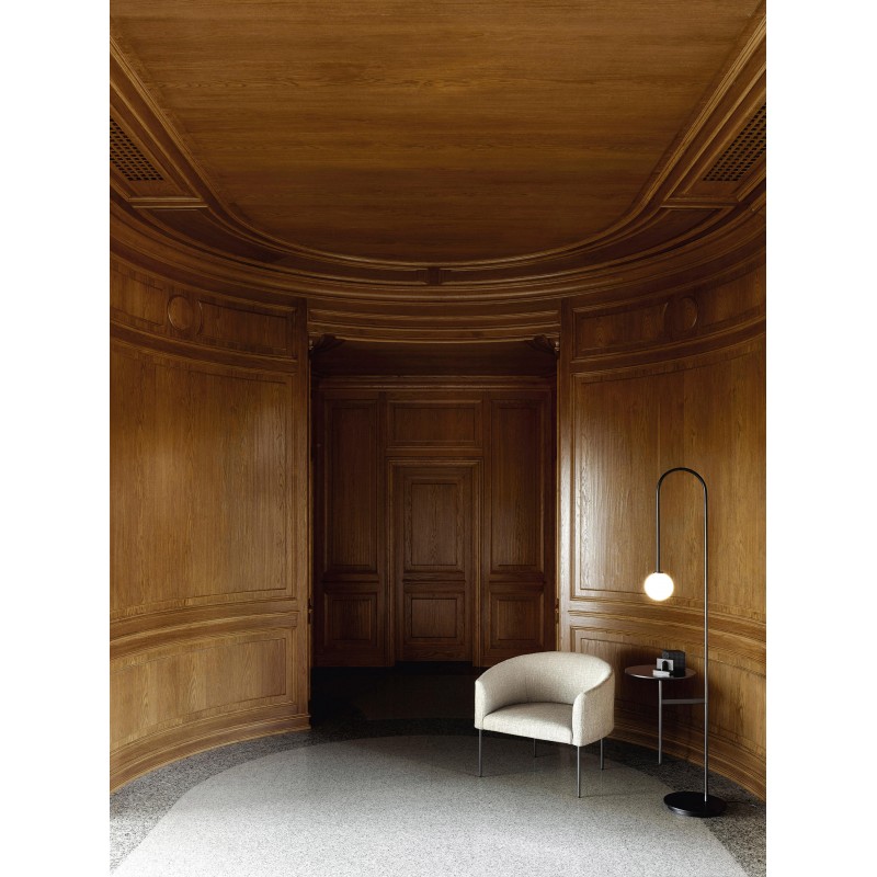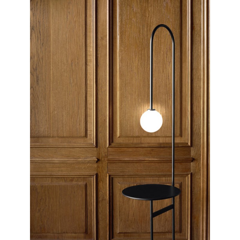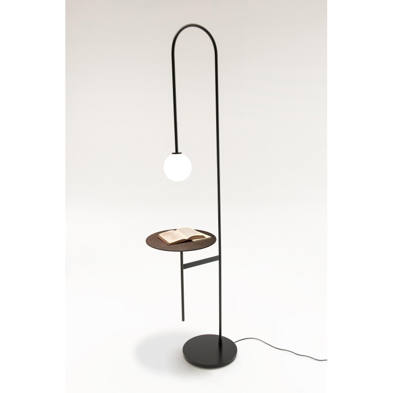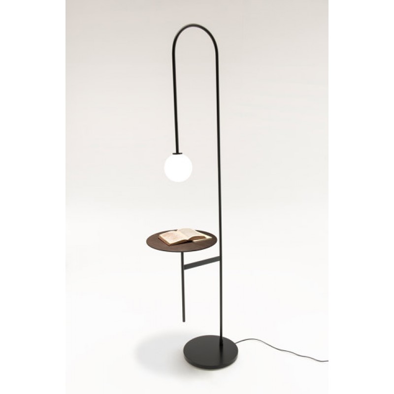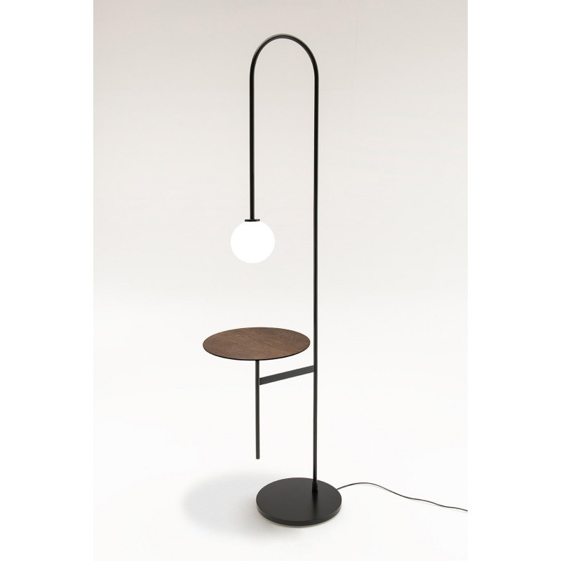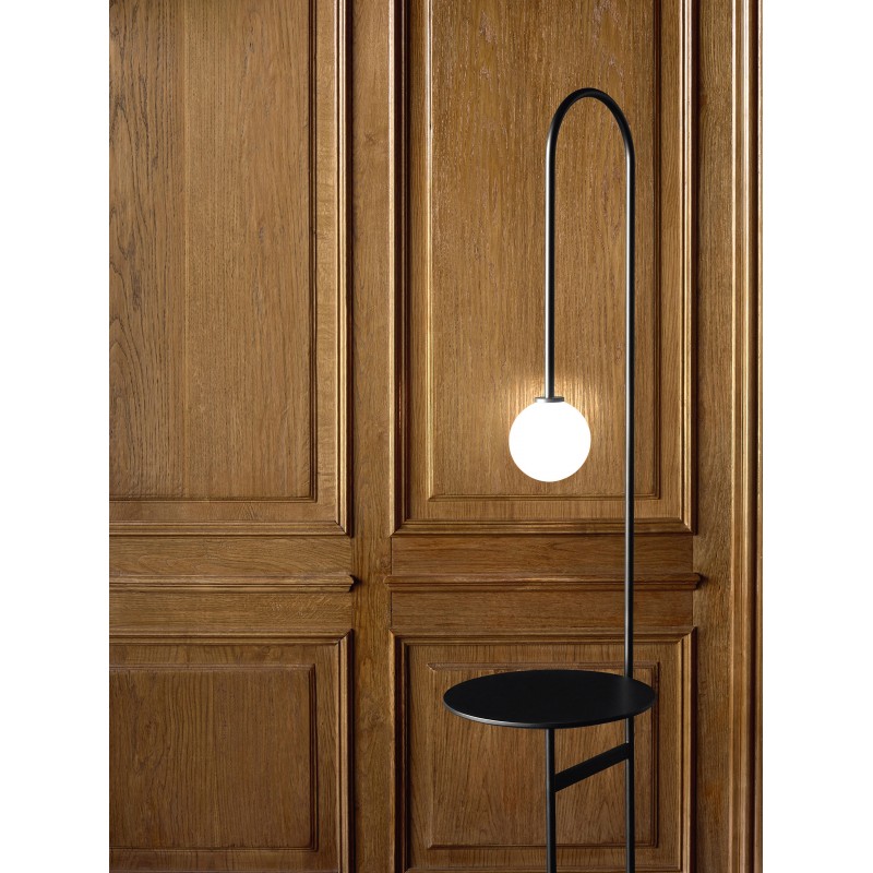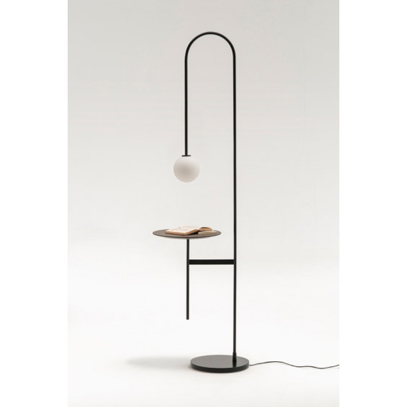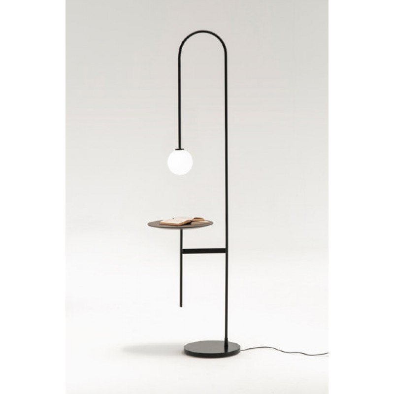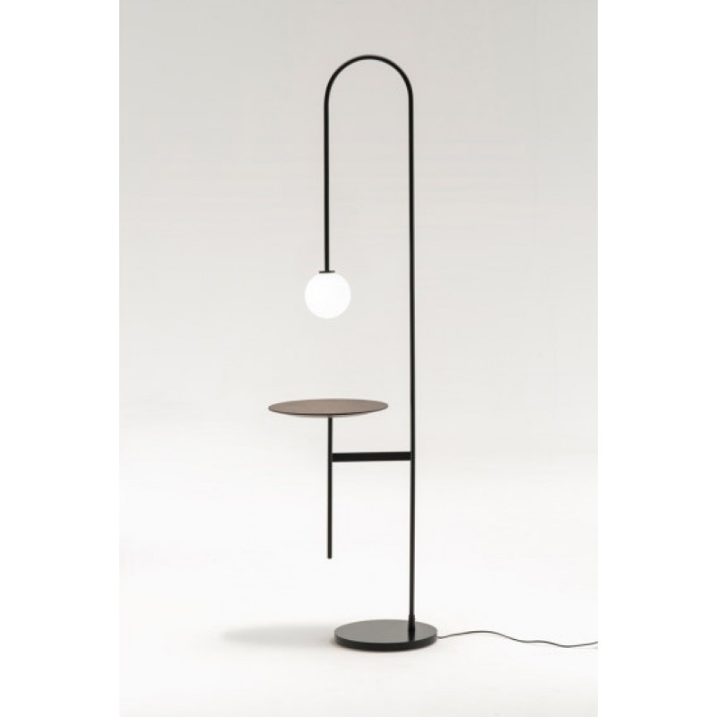 Blown glass opal diffuser Ø15 cm fixed to the lamp by means of a threaded ring.Floor support secured by black PVC feet.