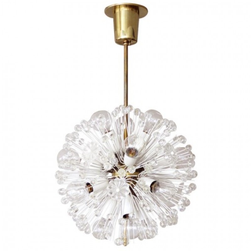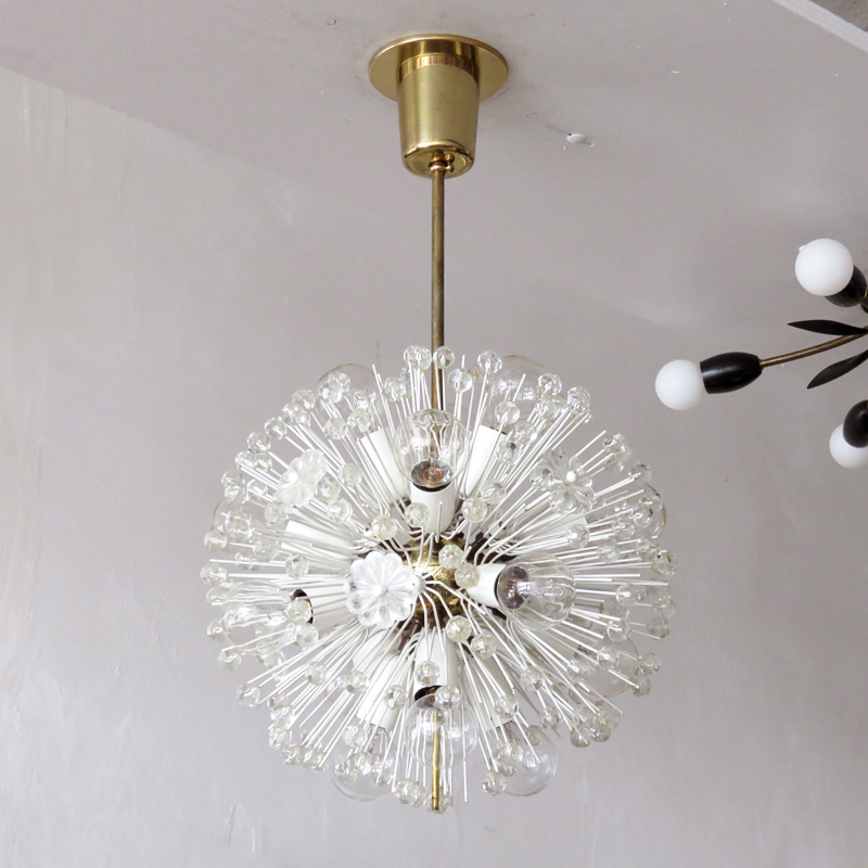 Beautiful and delicate fourteen-light brass fixture by Emil Stejnar for Nikoll with copious amounts of Austrian crystals, overall height can be adjusted, wired for US standards, fourteen E12 sockets, max. wattage 25w per socket, bulbs provided as a onetime courtesy.