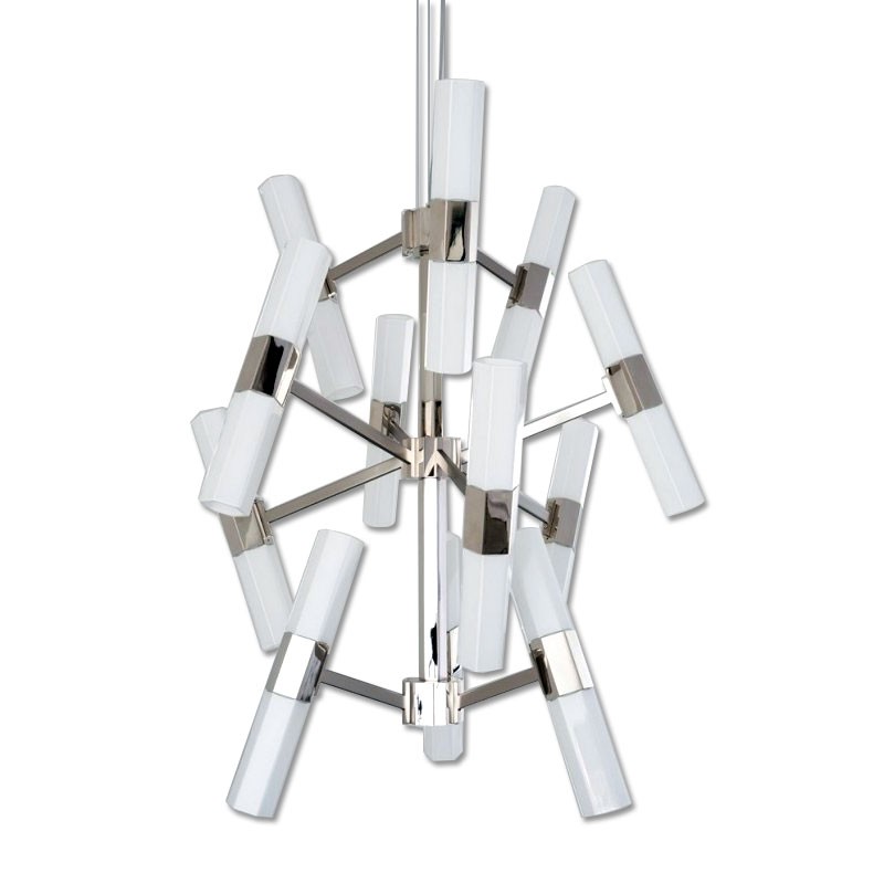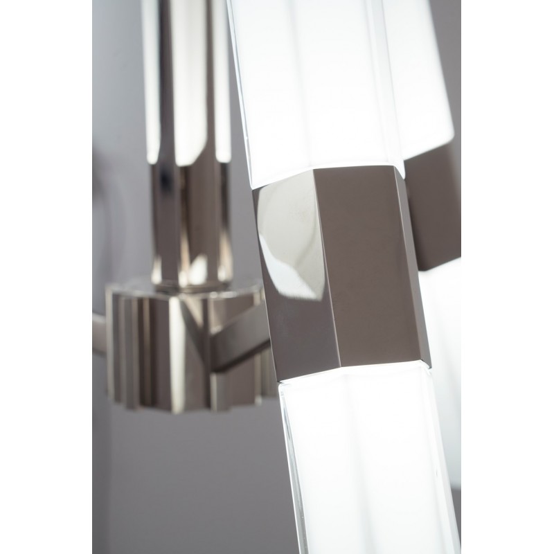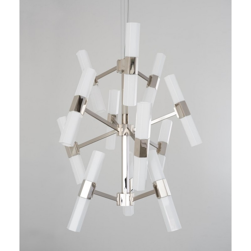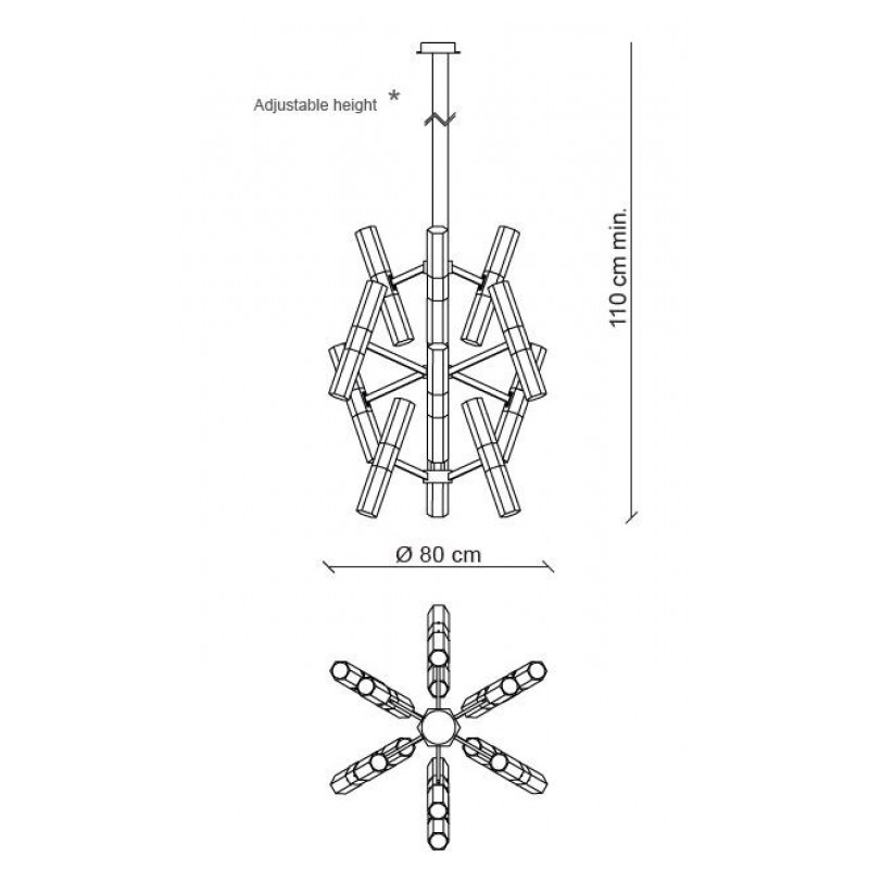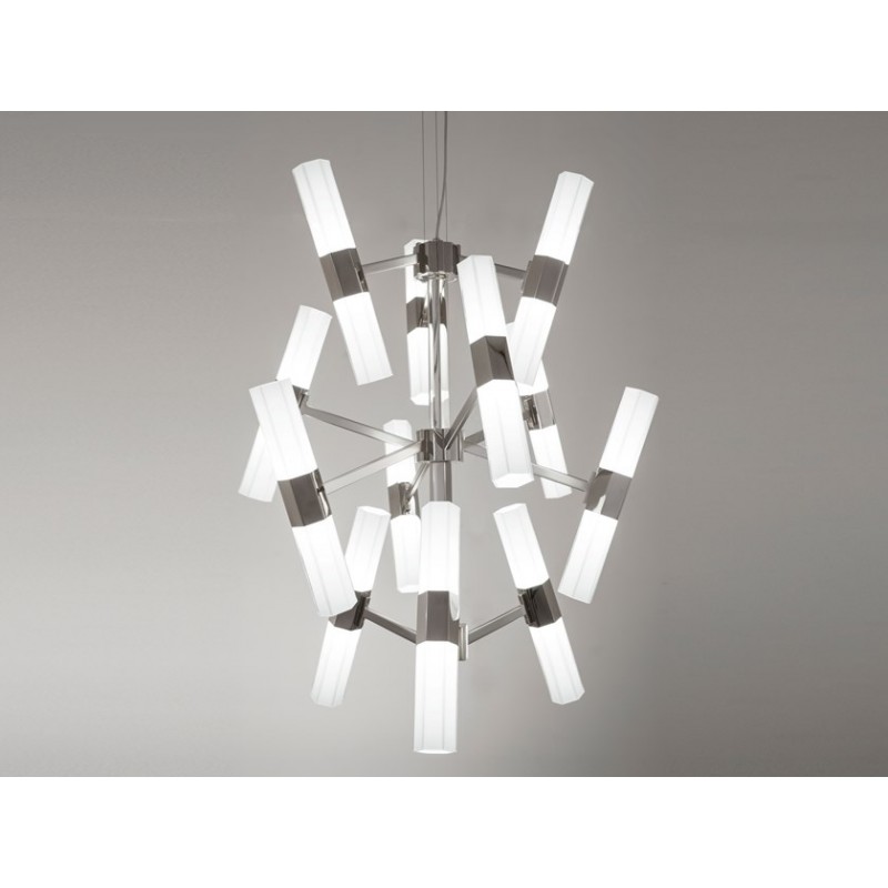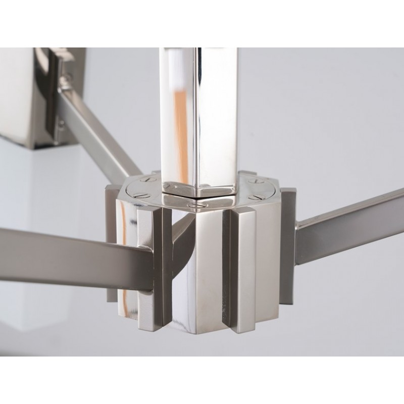 A calm chaos, elegant and orderly, that plays with geometries to make itself contemporary. A stylistic system with structured tones where the real star is the hexagonal module. Its squared lines recount a functional, aesthetic and geometric storytelling with a vaguely masculine taste. The name itself imply its most intimate essence: from a starting module it is possible to replicate a myriad of infinite forms, hence Chaos. A suspension chandelier, available in polished nickel, gunmetal, gold plated or copper finish, characterized by hexagonal lampshades created in clear or incamiciato white blown glass. The hexagonal lampshades is also available in clear cutted crystals. Replicable, modular and with the possibility to be aggregated, the chandelier is directable both vertically and horizontally, according to the functional needs. A chaos where the support's sturdiness and the voluptuousness of the transparent bodies live together, in an harmonic set of multifaceted expressive possibilities.