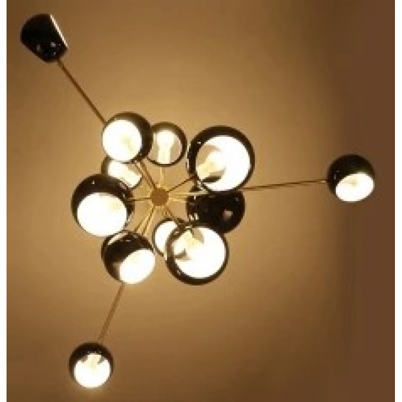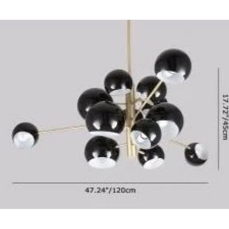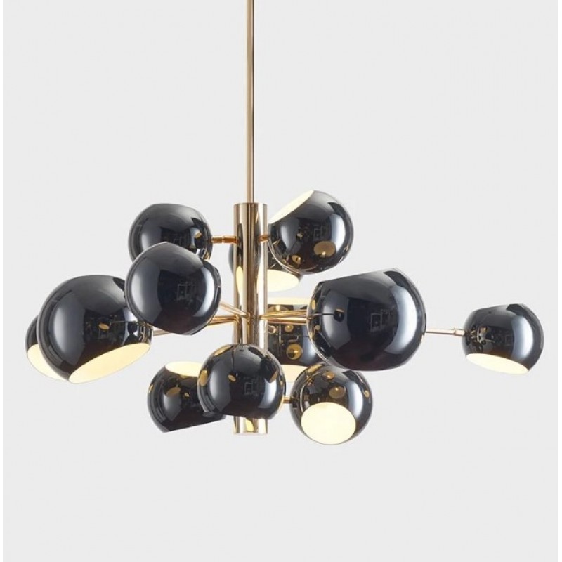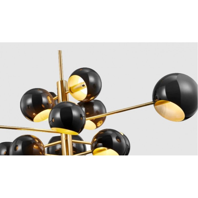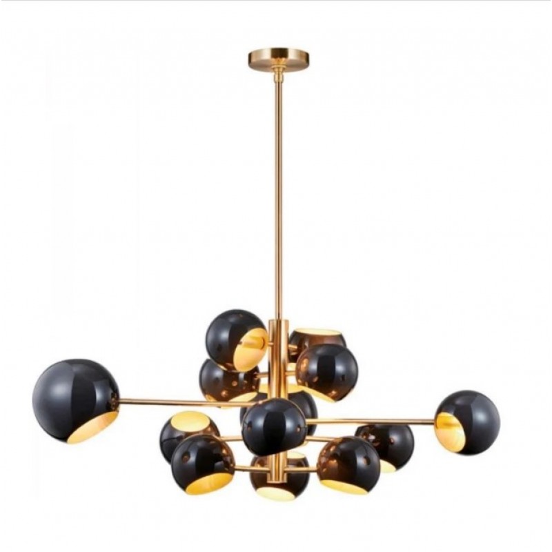 This chandelier is the perfect centerpiece for any space. Balancing fun and sophistication this piece is composed of thirteen spherical shades that radiate out from a central focal point. With adjustable shades and an adjustable height this chandelier lets you customize where the illumination goes. The light from fourteen standard 60 watt bulbs will provide plenty of ambient lighting. The glossy finish on the shades help this sleek chandelier stand out in any decor. Here, the balanced form expands from its central column with longer arms of varying lengths and a wider diameter. The column of powder coated steel shades is suspended from a steel drop, each shade rotating 320 degrees to direct light as desired. Designed in steel, with black and gold finishes, ideal for your living room, lobby or dining room with a modern atmosphere.