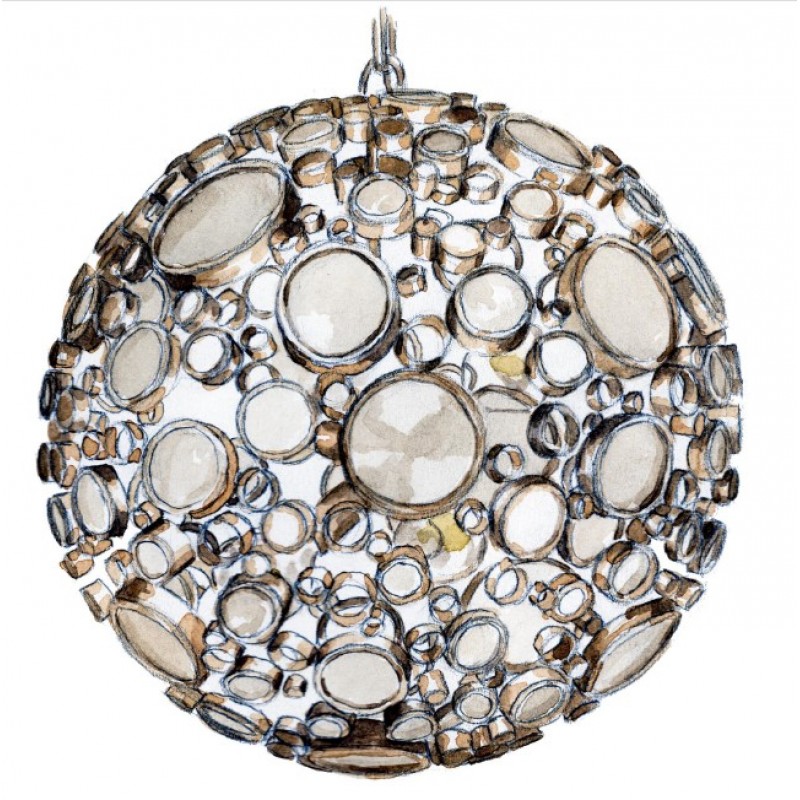 Breathtakingthat's what came to mind when we saw the ruins of an old Nevada mine at sunset. The walls had been constructed of wine bottles and mud. All those old bottles arranged so perfectly and capturing the sunlight, what better inspiration for a lighting family? We mimicked the bottle ends with recycled steel circles of varying sizes filled with recycled glass discs. Rarely before has a design based in "old" seemed so powerfully new.