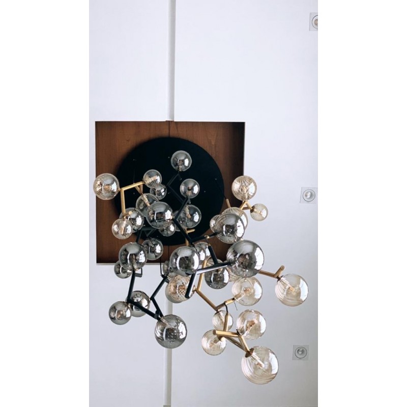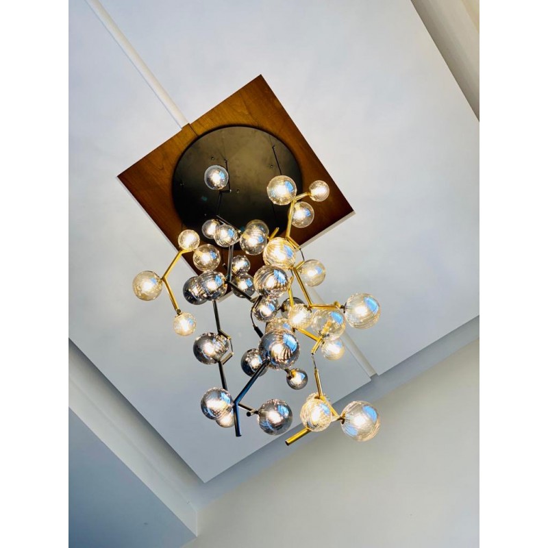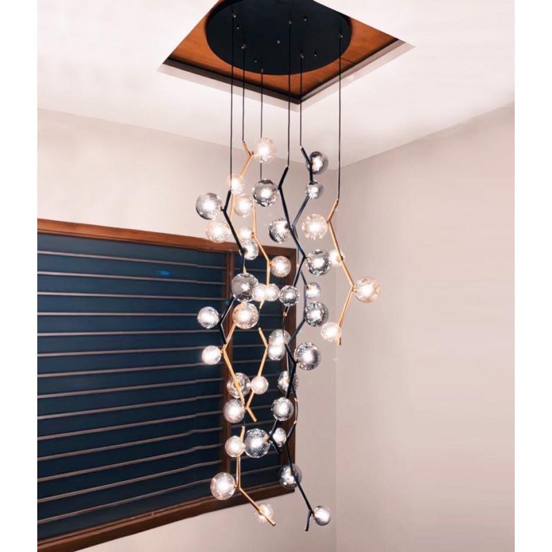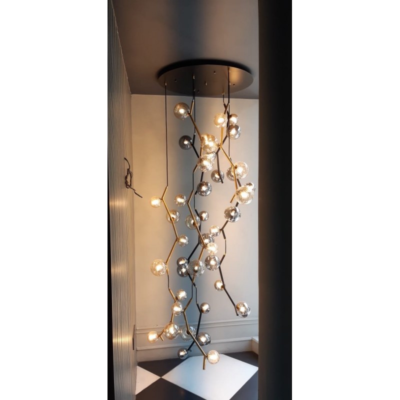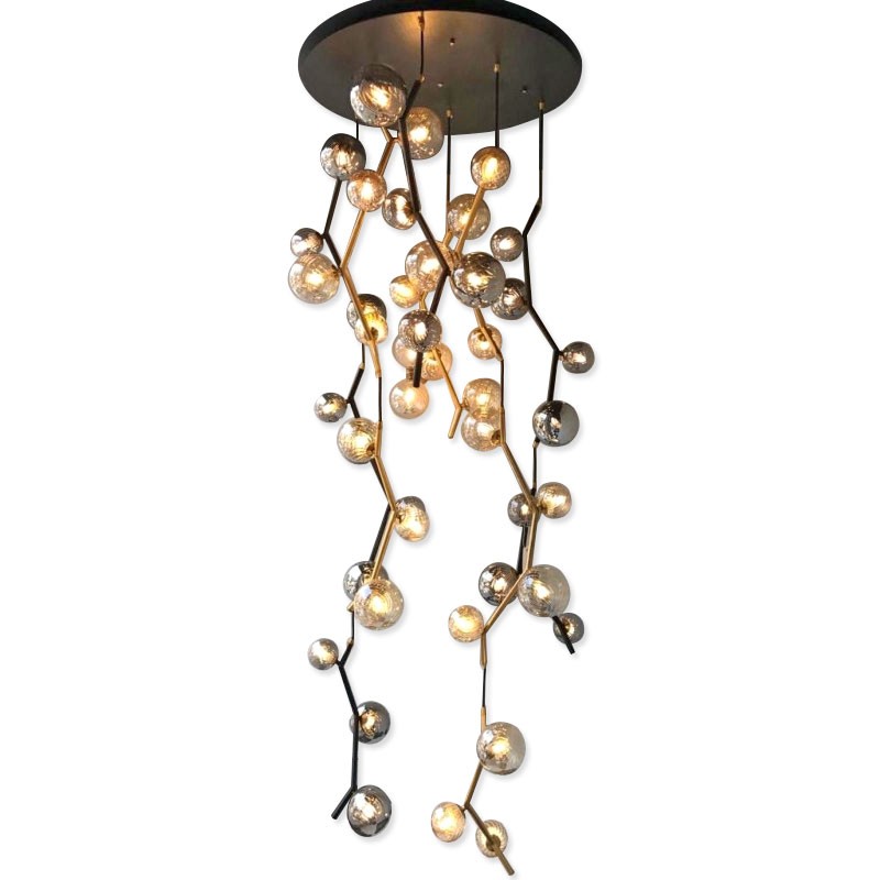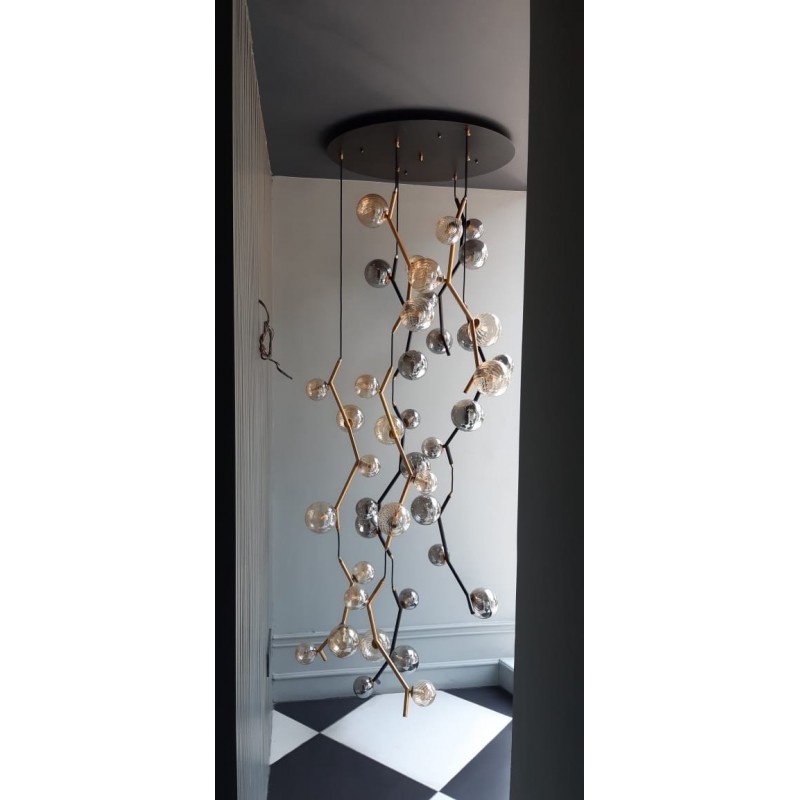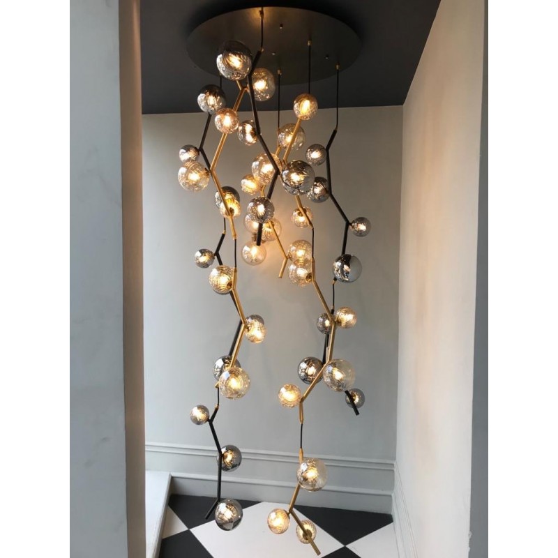 The illuminated Vertical pendant sculpture in brass with hand-blown suspended bubbles of glass shades are constructed with slight bends and smashed sides that reflect light with interesting detail. Just as the plant grows and climbs up the walls of a house, creating multiple images, this offers a special system of modular components. A beautiful addition to modern and contemporary home. This is an exclusive product that must be seen and touched before buying for its luxurious extravagance.