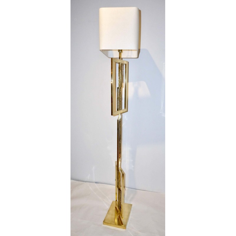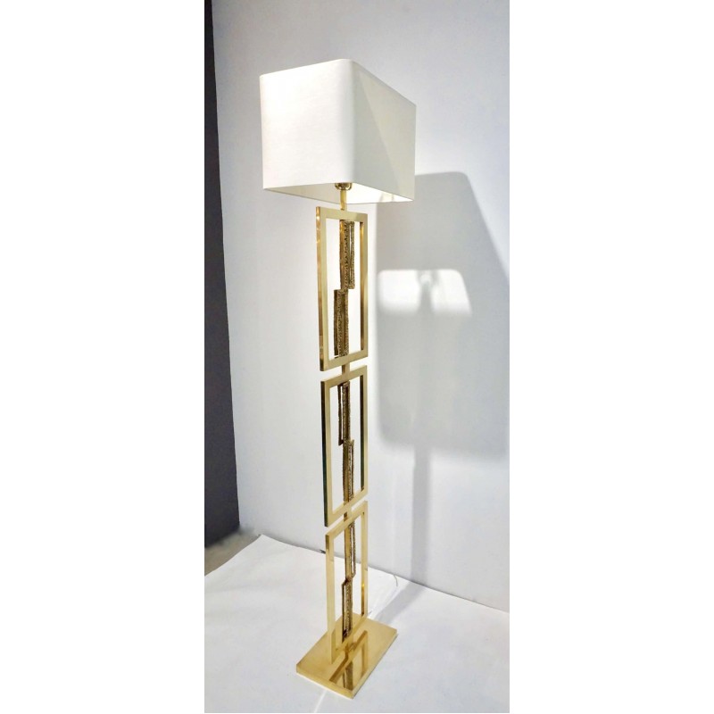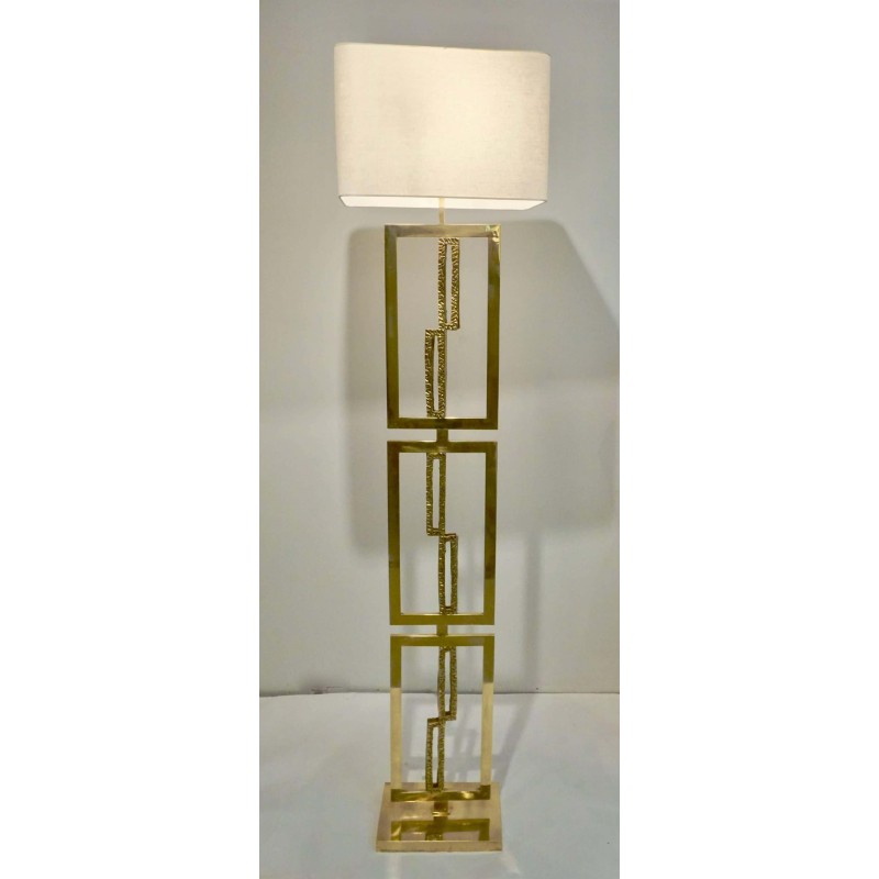 This Italian pierced sculpture floor lamp is entirely handmade, with an enticing modern geometric design. The three gold brass rectangular open frames swivel to create a dynamic personalized design and each enclose two rotating geometrical perforated elements in cast bronze decorated with a hand-hammered pattern, raised on a brass rectangular base. High quality of execution. Fitted with ivory white linen lampshade.