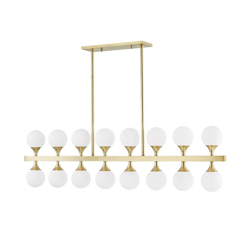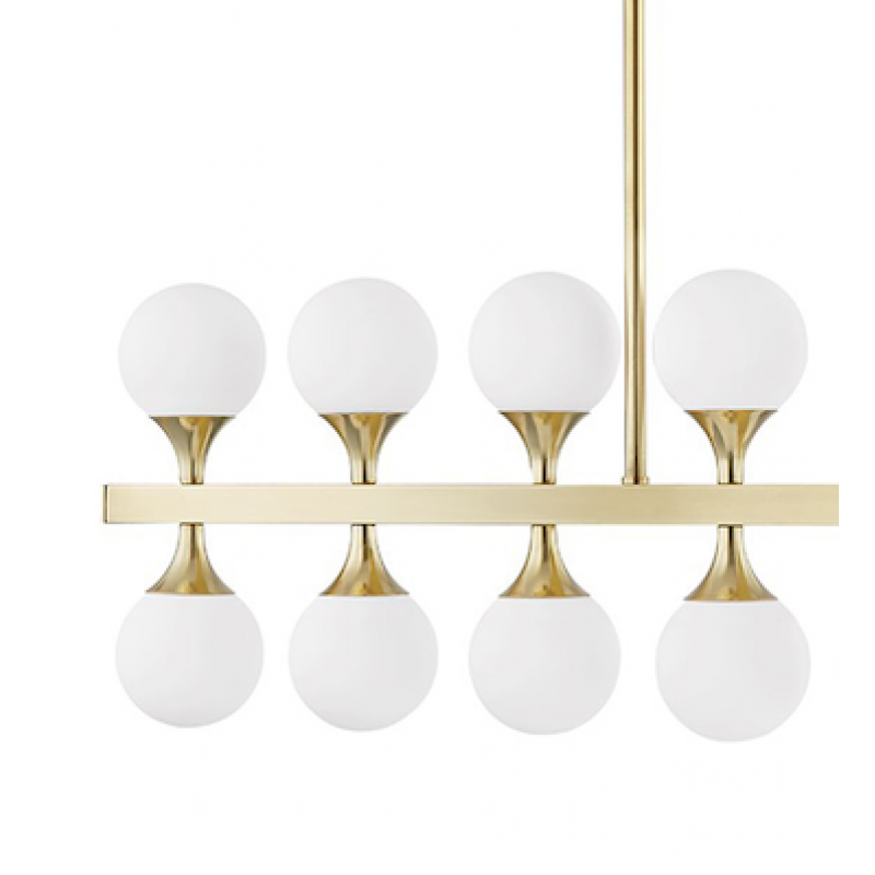 Delight in simplicity and symmetry in our Astoria family. Bubbles of light balance on and balloon forth from trumpets of cast metal. Opal-etched glass diffusers poise in balanced rows, above and below, along with a wheel of light, concealing warm, dimmable LED bulbs.