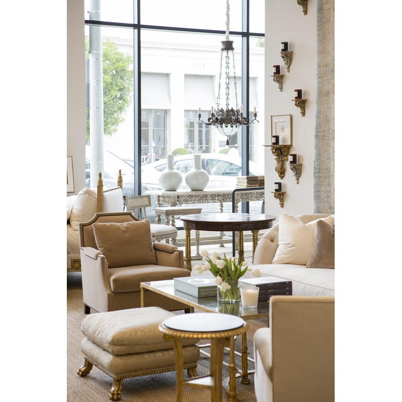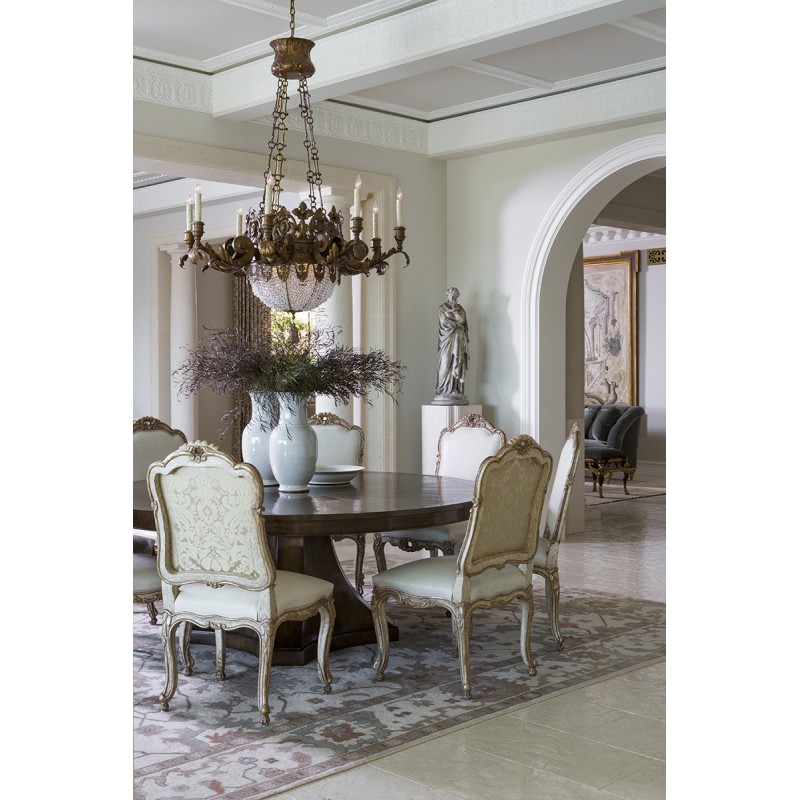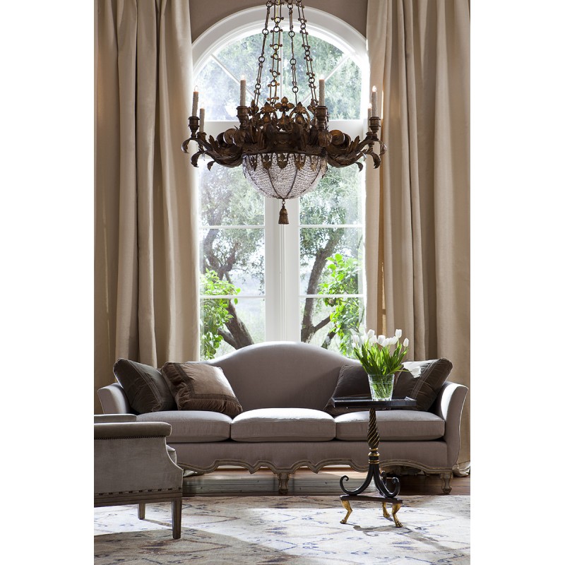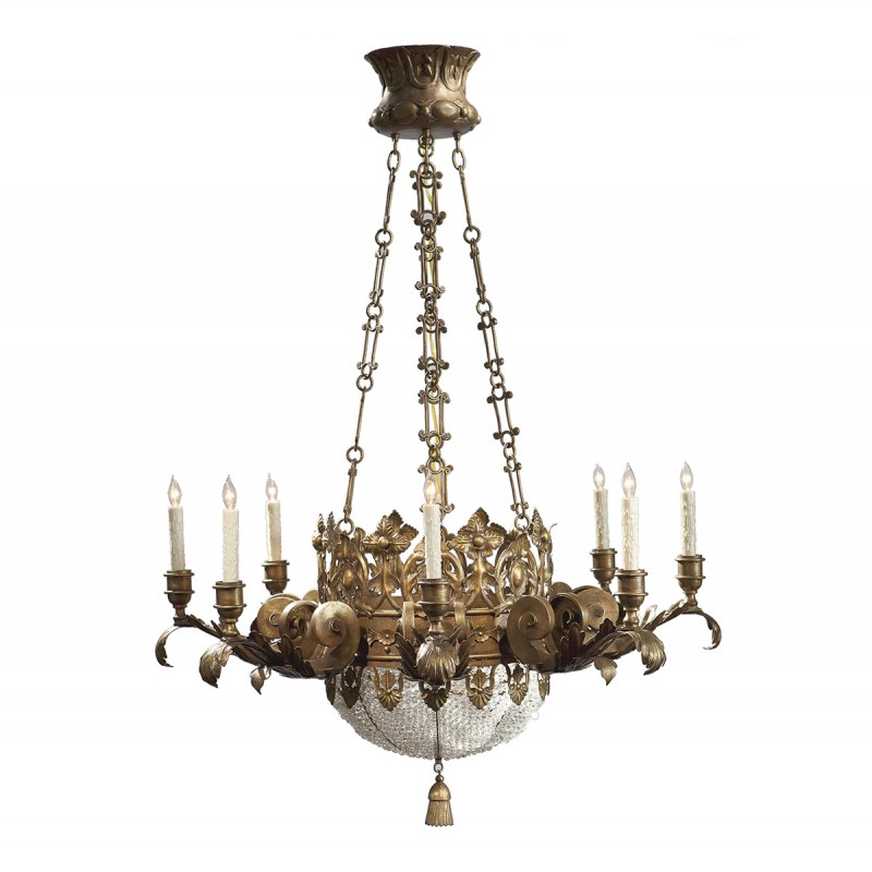 8-light chandelier (plus 4-lights inside crystal basket). Hand-forged wrought iron. Shown in Santini finish. Intricate iron filigree central band. Acanthus leaf scrolled arms. Crystal beading and carved gilded tassel. Standard with 3 foot chain and canopy. Please note the 38″ version features 6-lights (plus 3-lights inside crystal basket). The key to an elegant, opulent, bespoke design is understanding the aspirations of the client, the relevance of location and through maximizing the potential of existing elements of the space.