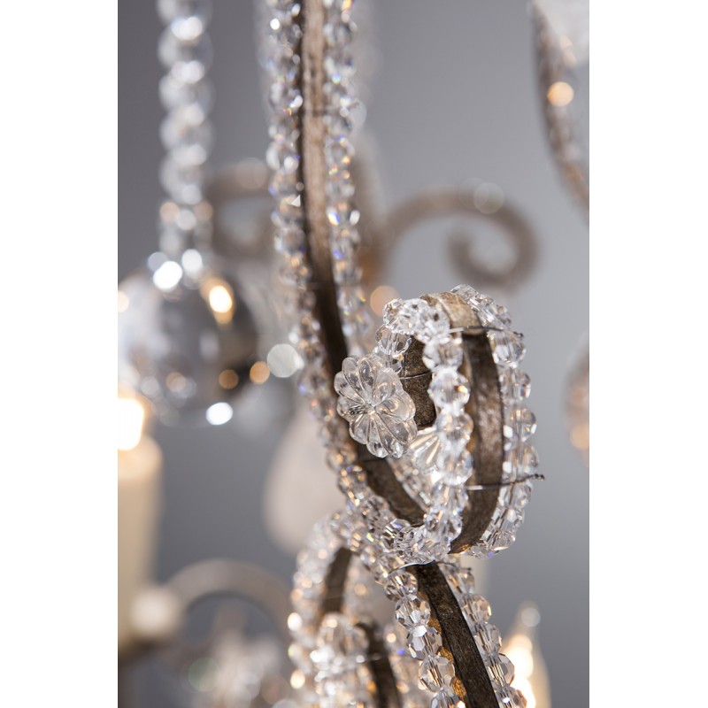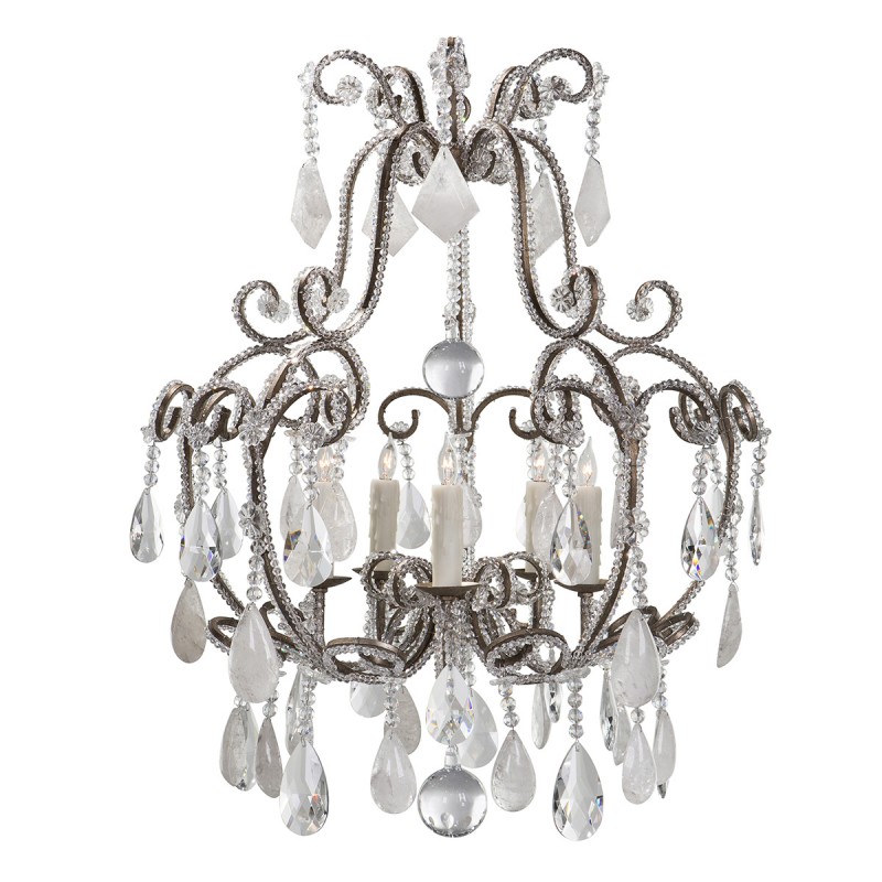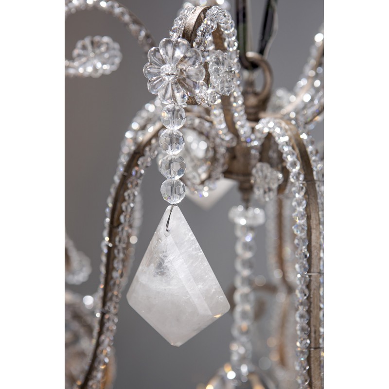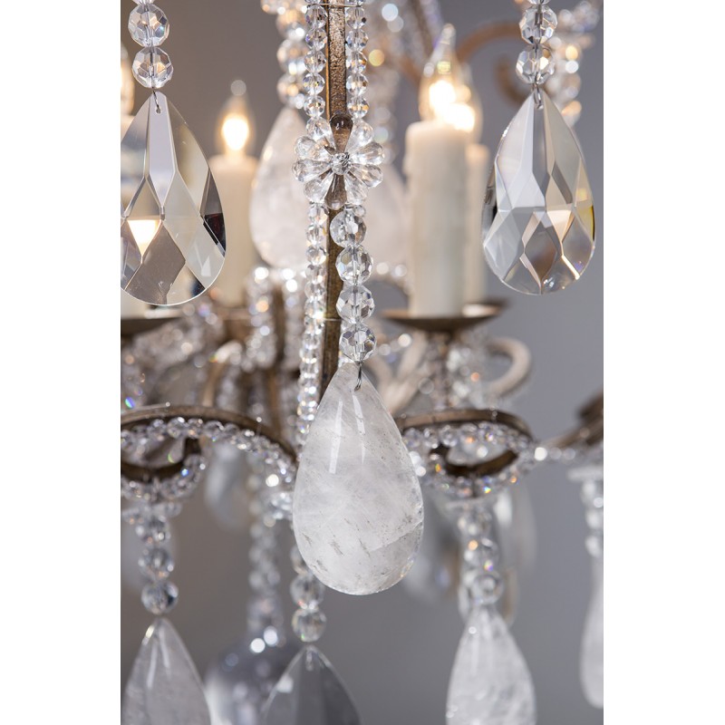5-light crystal chandelier. Shown with hand-carved and polished semi-precious rock crystal prisms and lead crystal prisms. Clear crystal beading. Hand-forged wrought iron frame. Standard with 3 foot chain and canopy. At Alan Mizrahi Lighting Design, we supply and manufacturer many highly sought after designer pieces. All Chandelier can be customized by number of lights, style, color and size to meet your specific needs. Every chandelier can also be combined with a matching table lamp and wall lamp to accomplish the best room design. Our company provide collections that can make all your project dreams come true. Lighting products play an important role in any room setting. Hence, you need to make sure that the items you choose should brighten the room while rendering it a relaxing and welcoming feel as well.