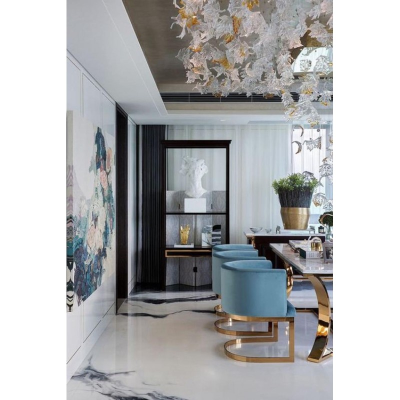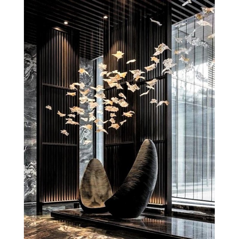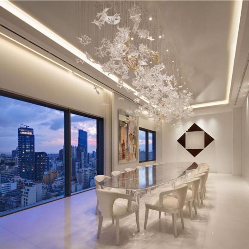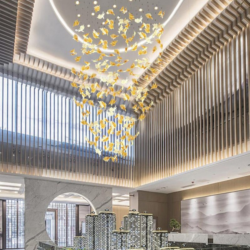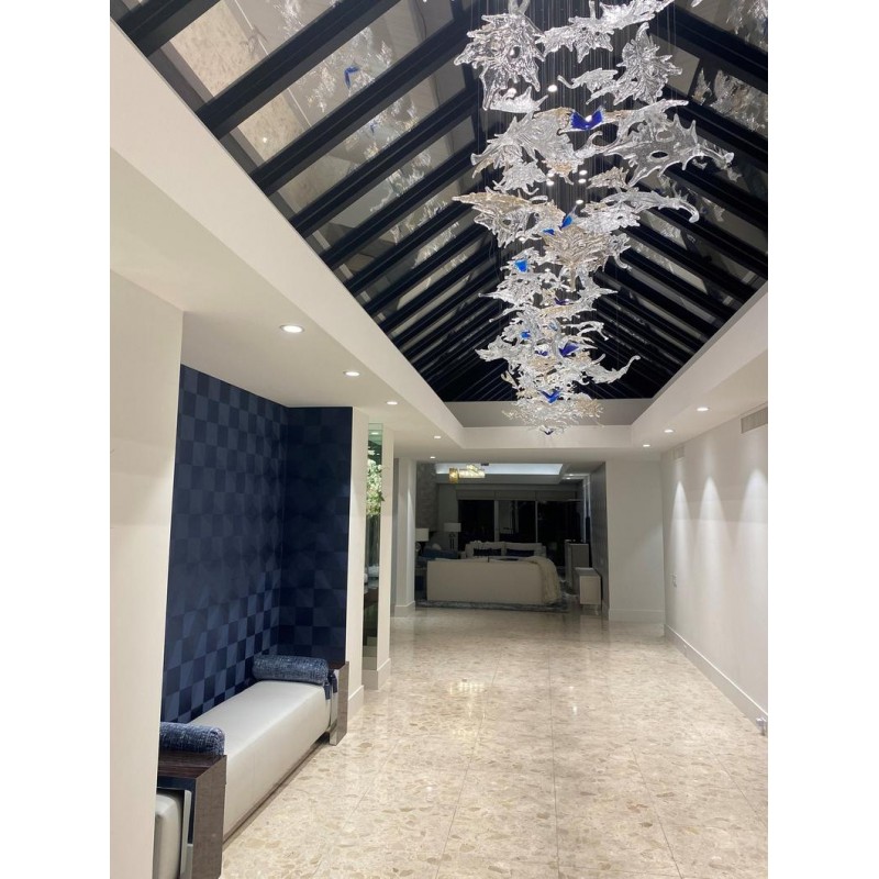 A classic and elegant hand-crafted Murano glass chandelier designed in Italian style. A beautifully detailed design of art glass leaves floating in the space in grace like the fall leaves carried by the autumn breeze inspired by the beauty of fall leaves in nature, the artisan chandelier is designed with a combination of different sizes of Murano glass leaves varying from 6"-8" / 10" /12" long this elegant breathtaking chandelier will make a statement in any space and will be the center of attention in your house! the light reveals the elegant curved glass designs and the glow of the unique glass texture and creates a fresh clean modern look that will complement any space. the Capri chandelier can be designed in any sizes and length to fit the needs of the space, as a central cluster for over a dining table, or in a long multi-level staggering for a multi-story staircase, a multi-level stairway, two-story foyer, large entry, a commercial lobby or any other space.