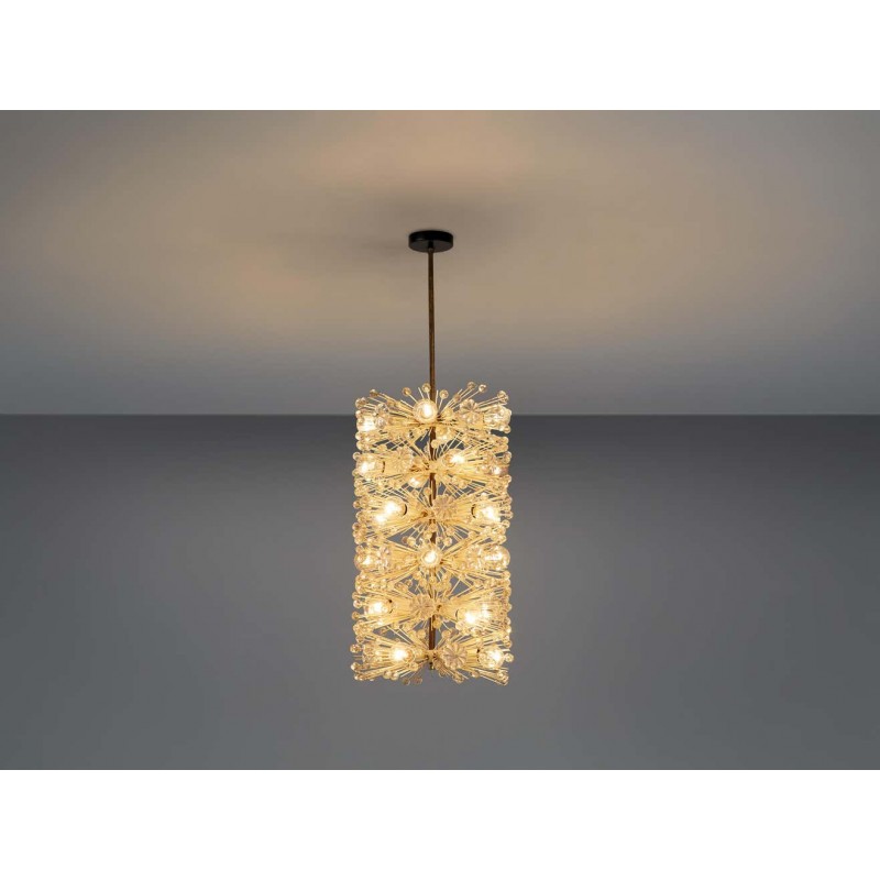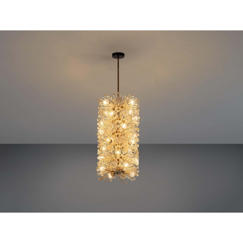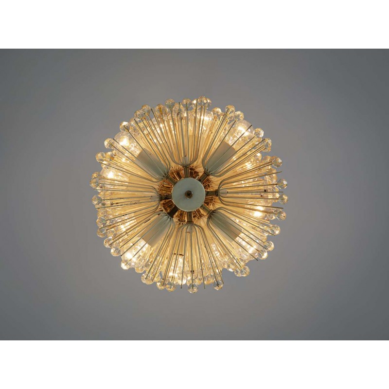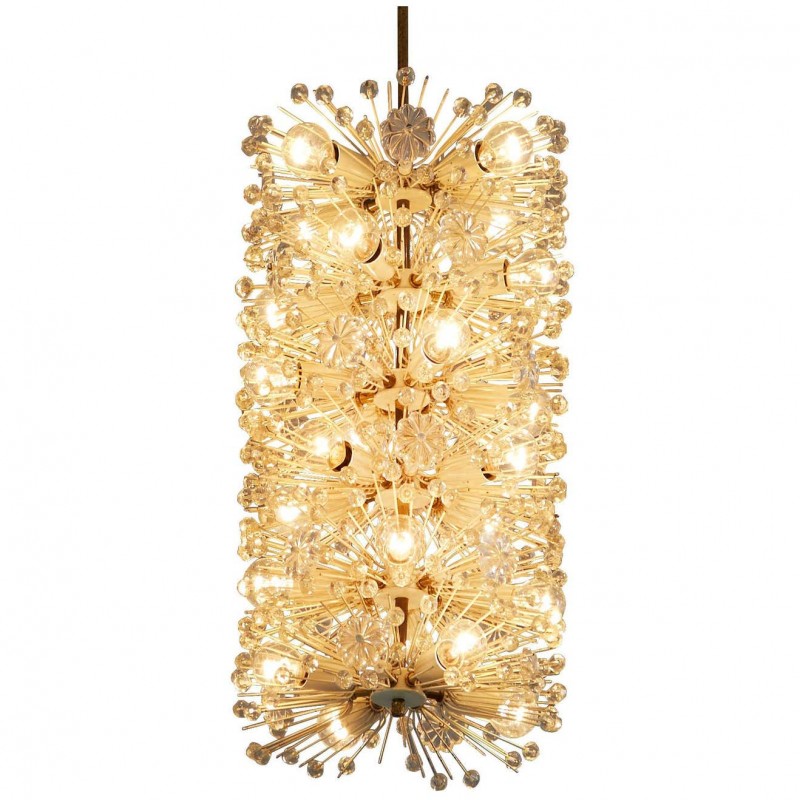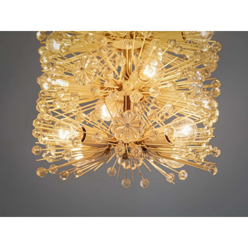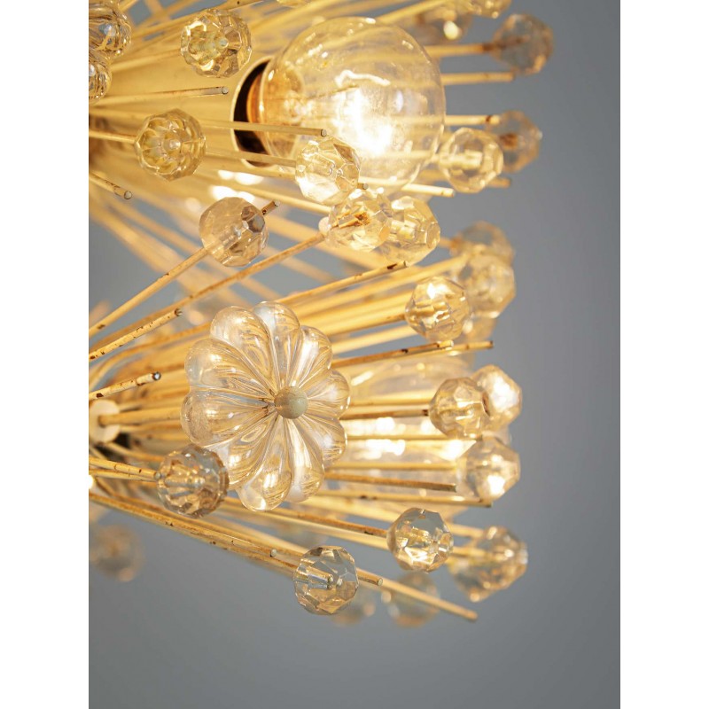 Wonderful chandelier by Emil Stjenar for Nikoll. This cylindric chandelier consists of multiple thin brass arms, holding glass flowers and spheres. Lightbulbs are adjusted in between this vivid composition. Due to the arrangement of many small elements connected to one large chandelier, this lamp has an overwhelming expression.
