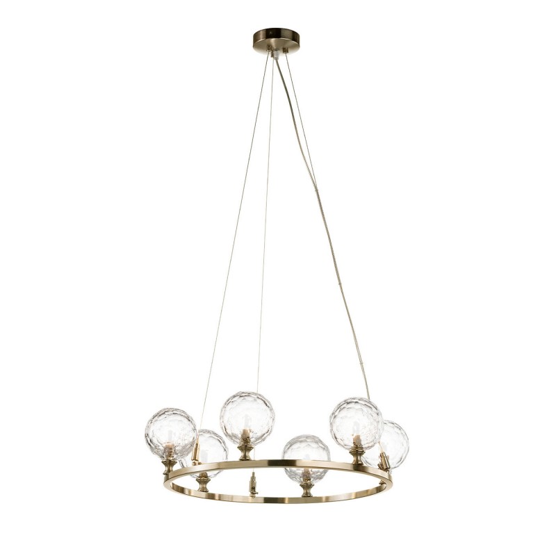 Sophisticated and stately, this chandelier flaunts a timeless design masterfully crafted by hand of fine materials. Fashioned of brushed gold-finished metal, it features a ring-shaped structure suspended on three thin metal threads hanging from a round ceiling rose, exquisitely adorned with six handmade and hand-etched crystal shades supporting g9 led bulbs. Please consult the concierge for finishing options.