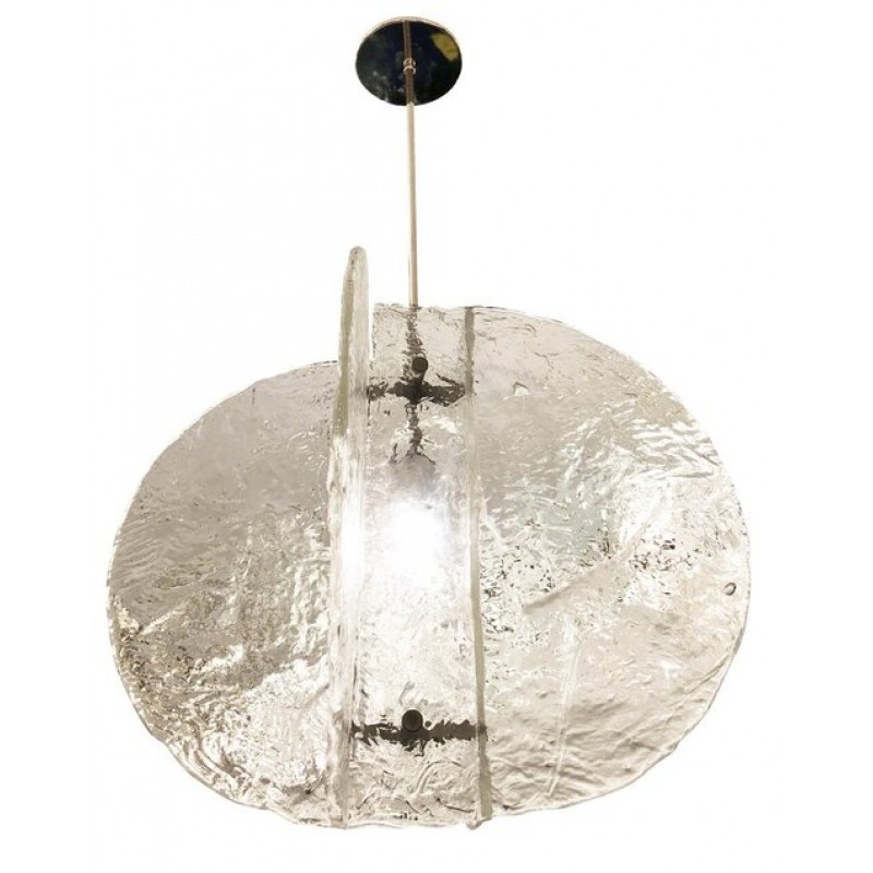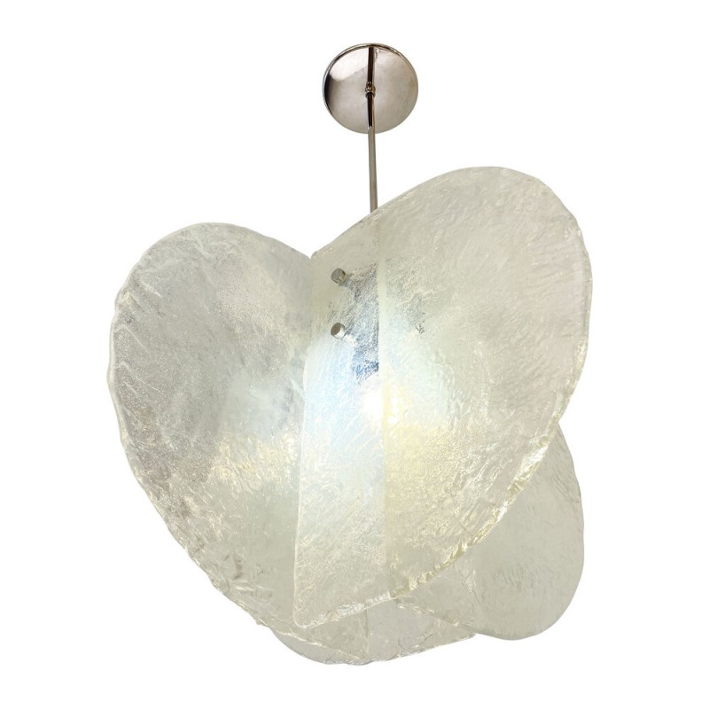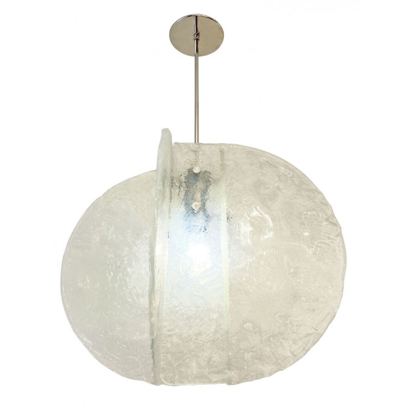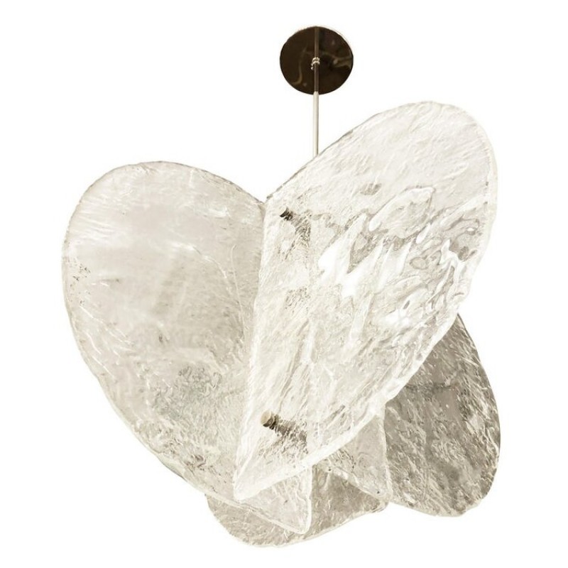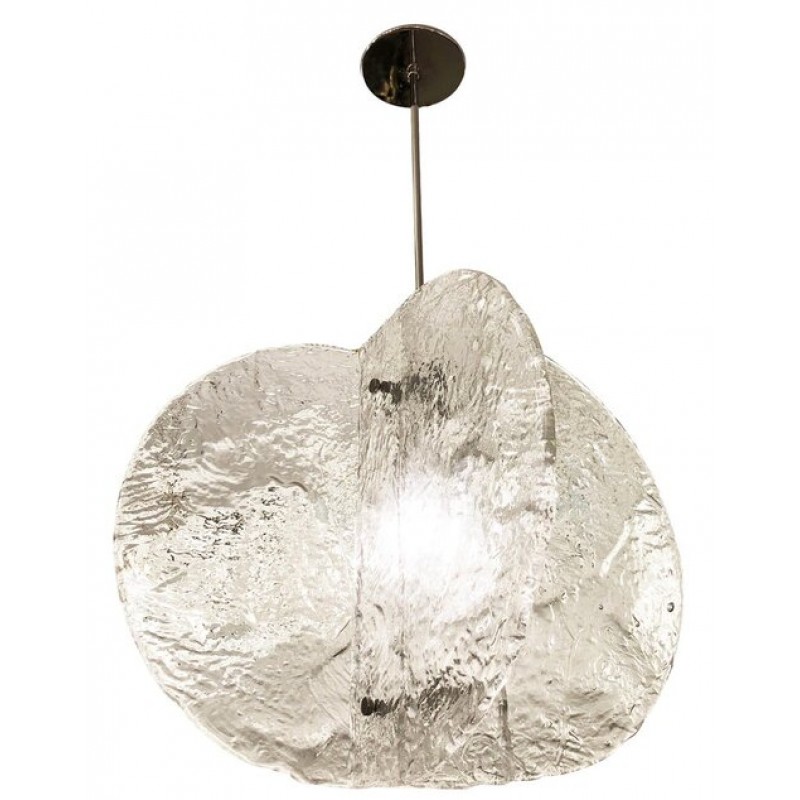 Stunning pendant composed of four textured, hand-blown glass slabs connected by nickel joints. The way the glass slabs connect creates a square space in the middle that holds one regular e26 socket. Length of stem can be adjusted as needed.