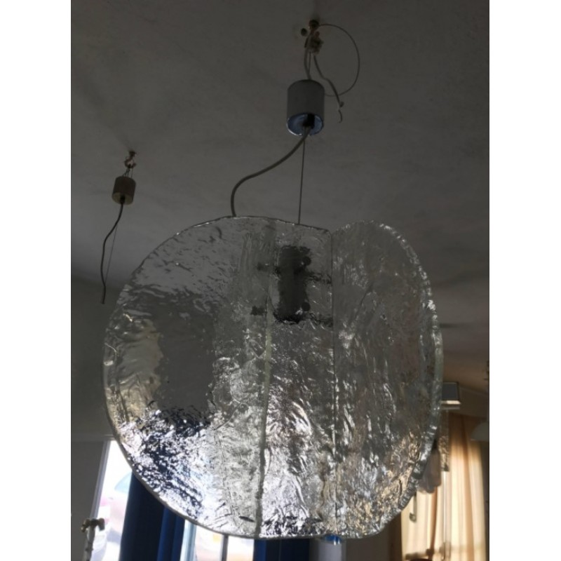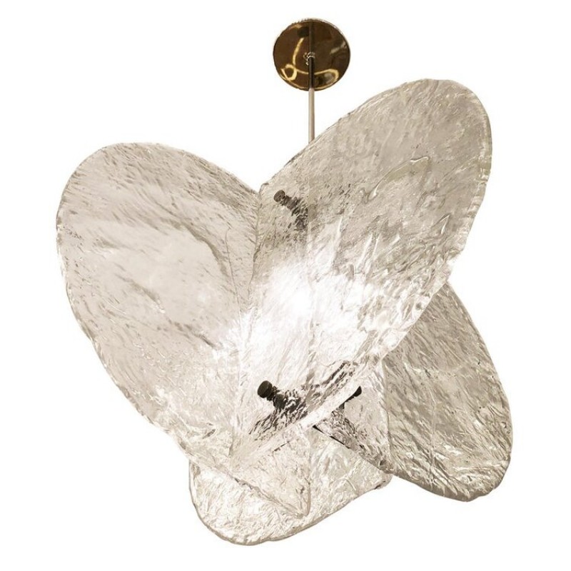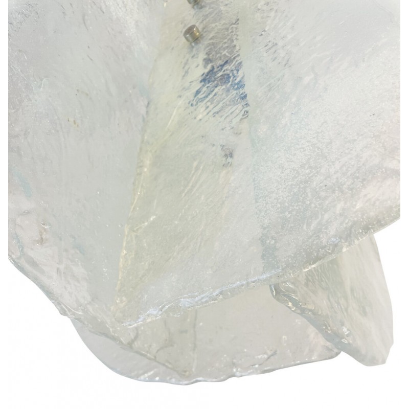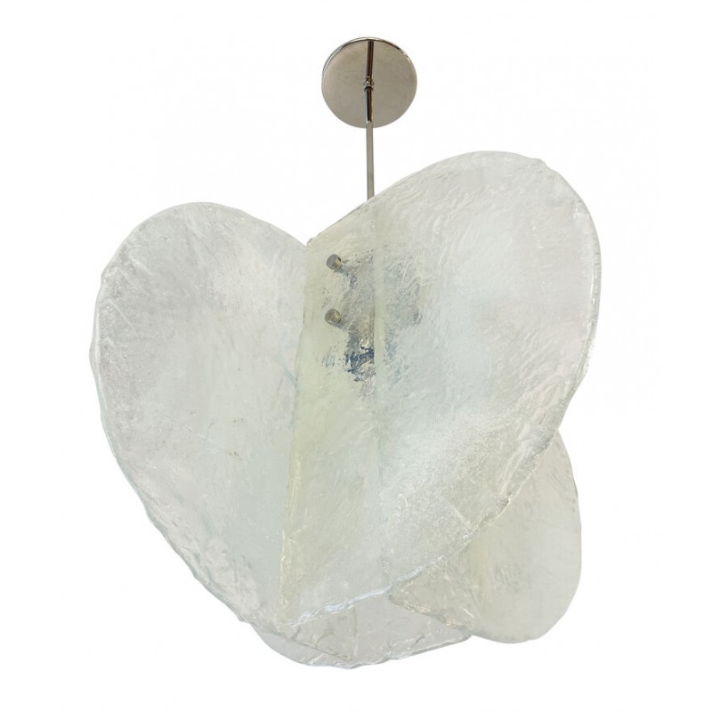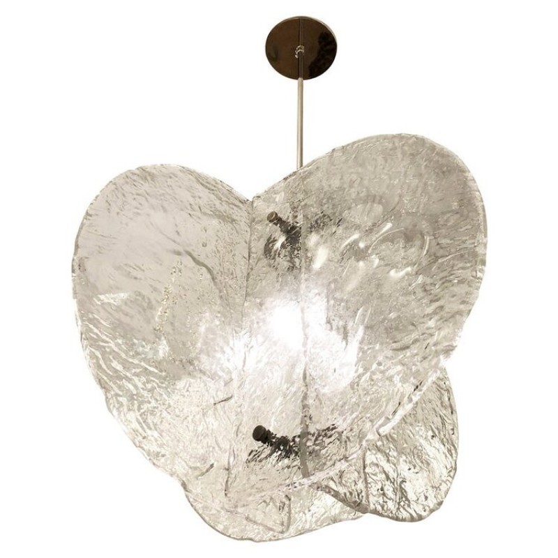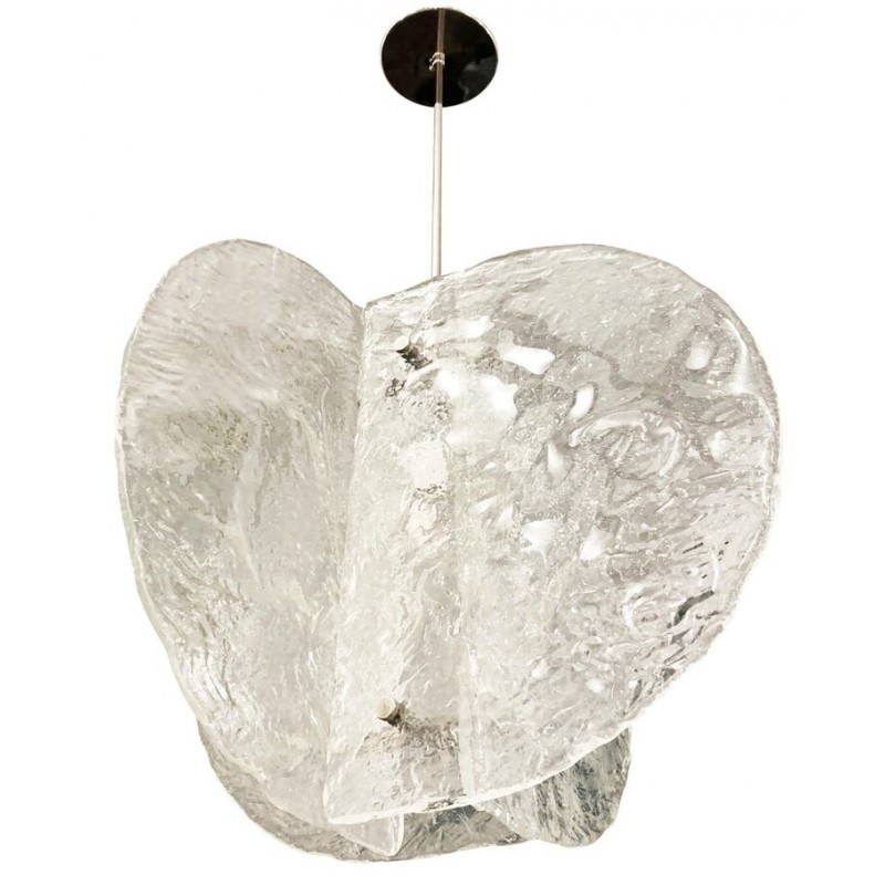 Stunning pendant composed of four textured, hand-blown glass slabs connected by nickel joints. The way the glass slabs connect creates a square space in the middle that holds one regular e26 socket. Length of stem can be adjusted as needed.