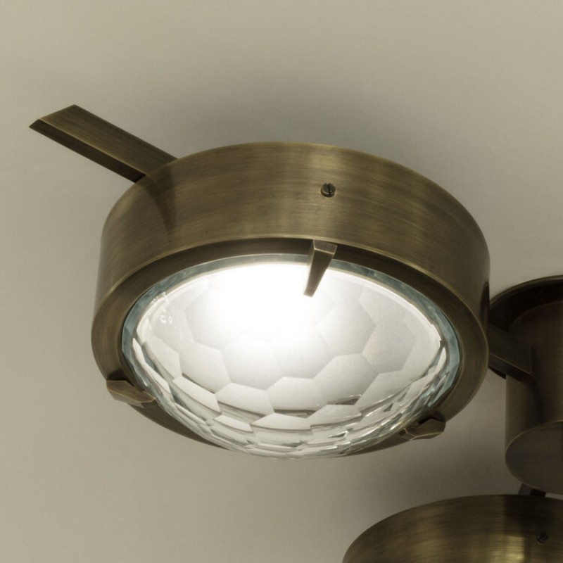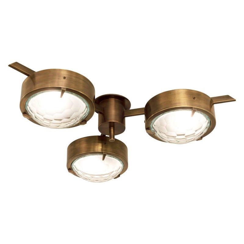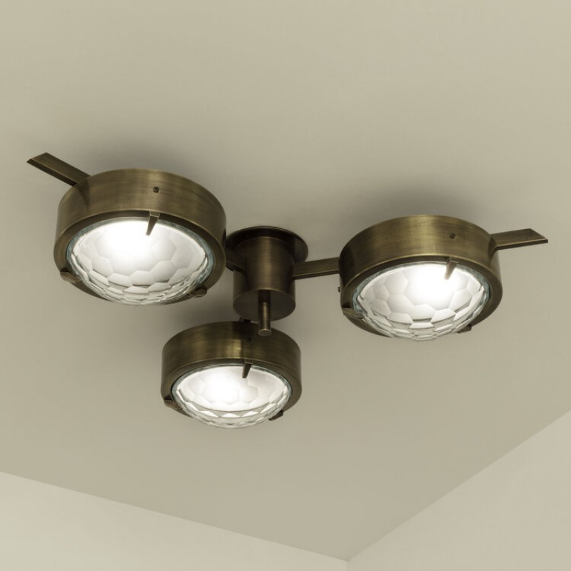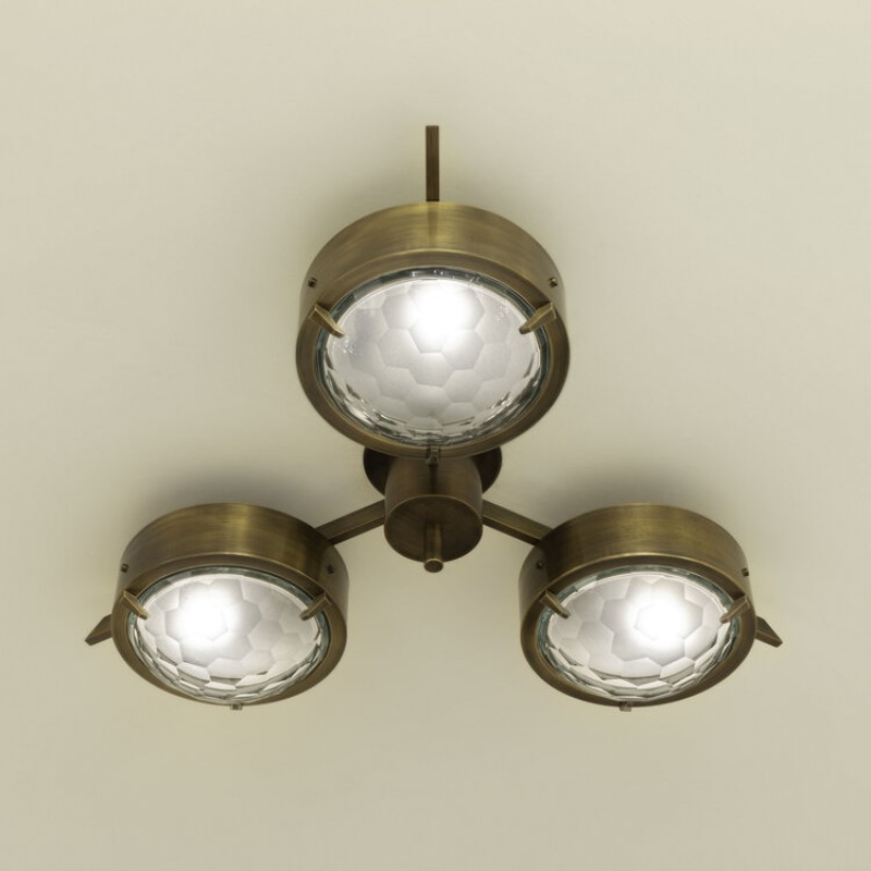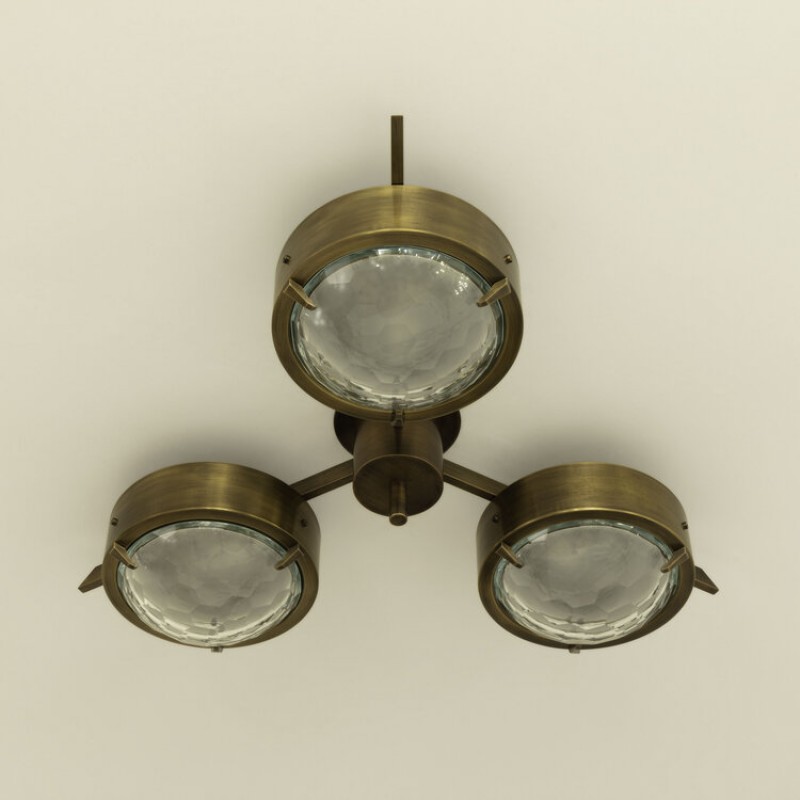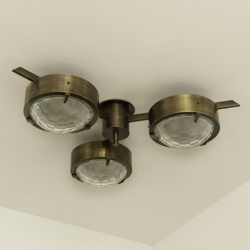 The smeraldo ceiling light features three shades hand-faceted from thick starphire glass, balanced on a brass machined frame. Shown as a flush mount in our bronzo ottone finish. The listed price is for the stock model in polished brass.