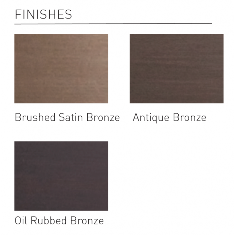 Metal Finished: Brushed Satin Bronze, Antique Bronze, Oil Rubbed Bronze (Different finish available at no additional cost)