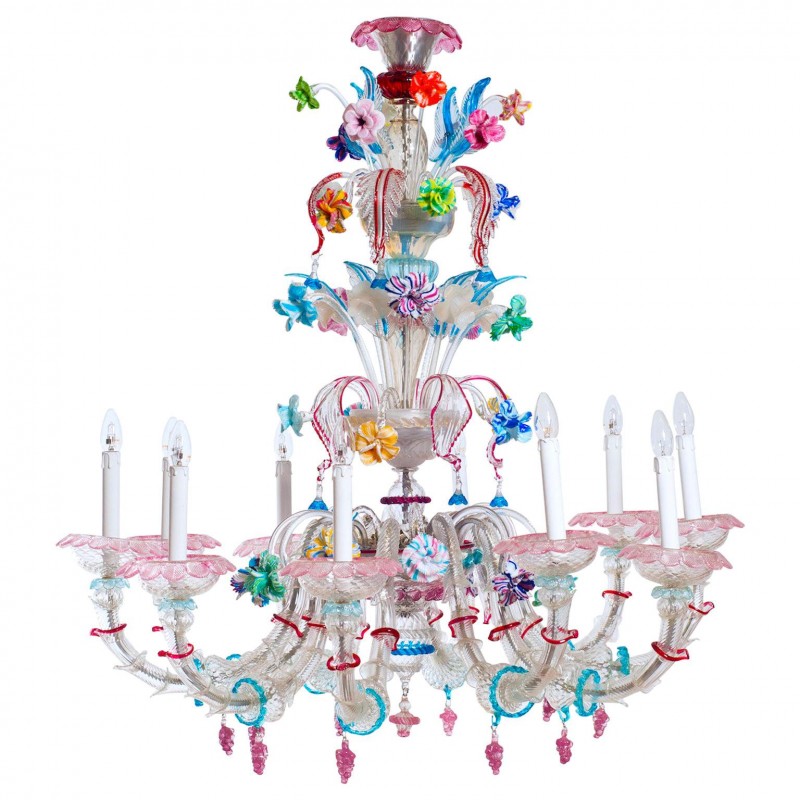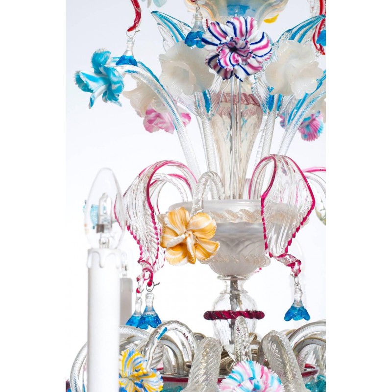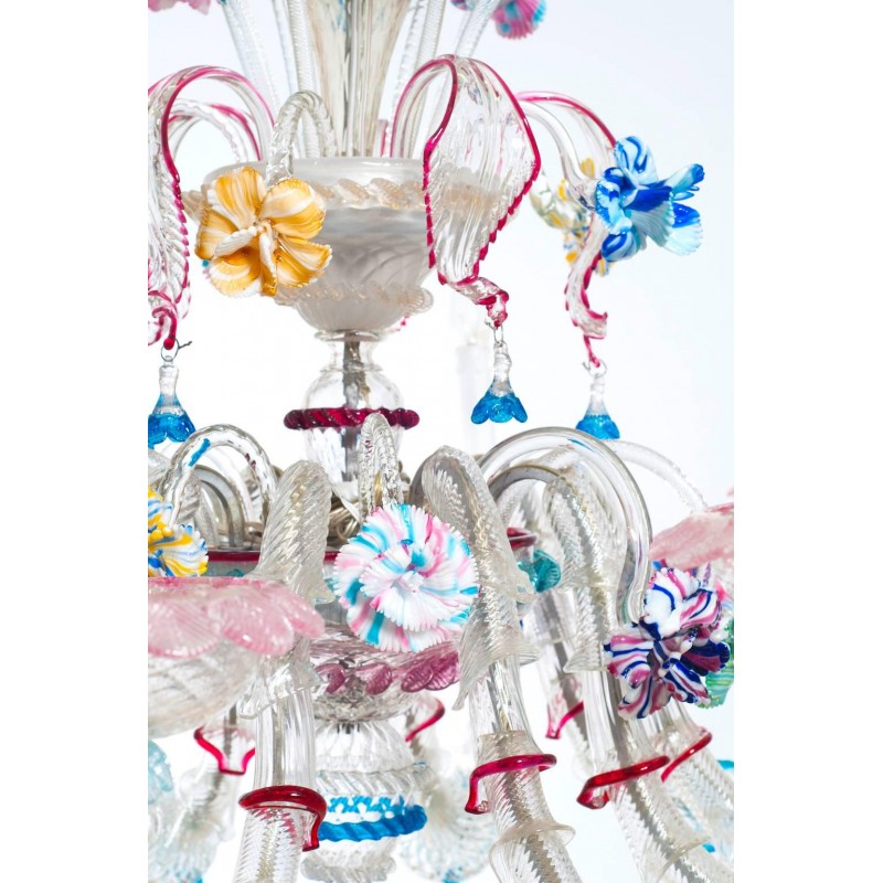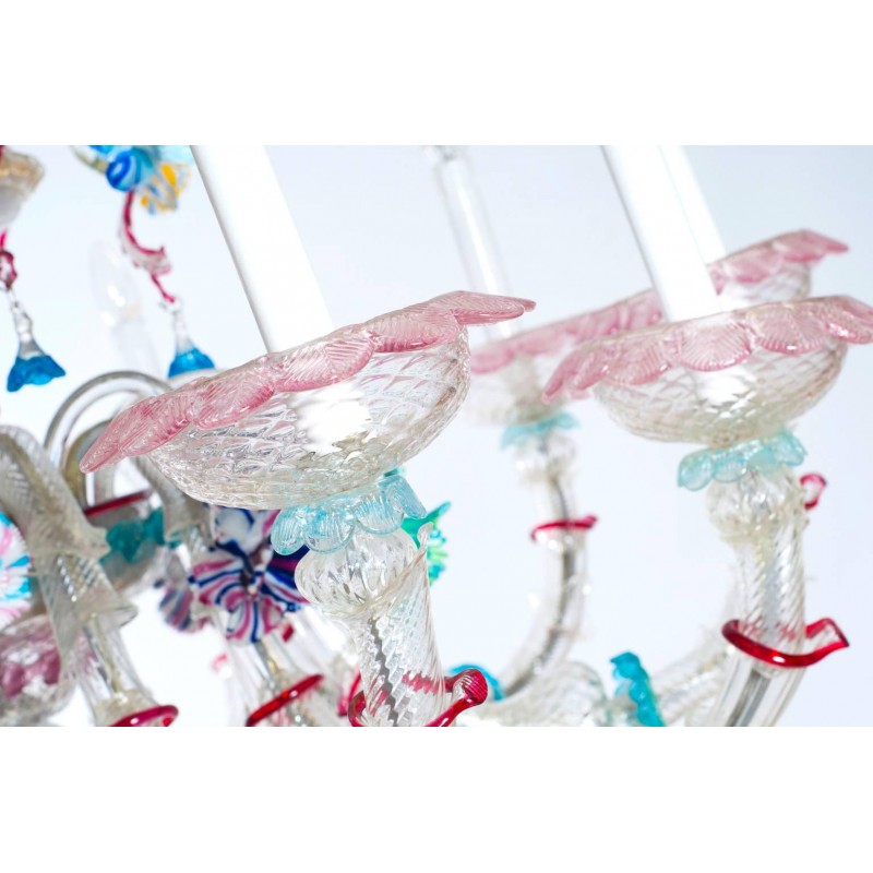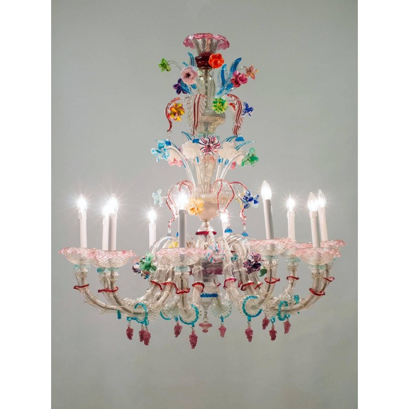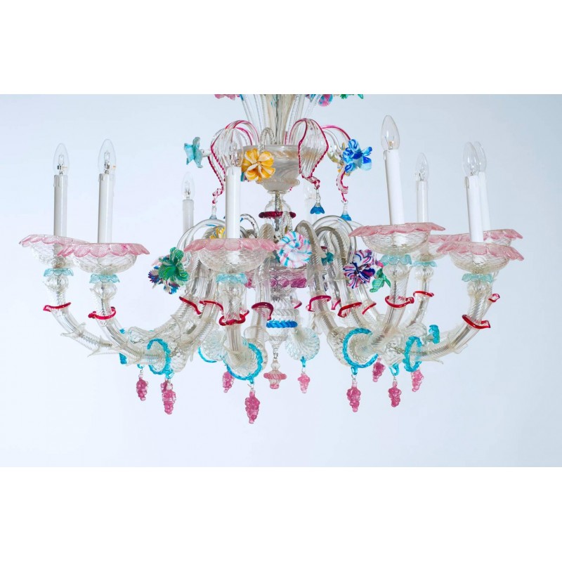 Pink grapes Ca'rezzonico chandelier in Murano glass Giovanni Dalla Fina, 1980s. Amazing Italian Venetian Ca'rezzonico chandelier in Murano glass clear color, with multi-color finishes in glass paste. All decorations such as flowers and leaves are colorful, while pink finishes are per each arm and all the grapes at the bottom of each arm. Overall there are ten bulbs. The chandelier is a work of art thanks to its delicate colors an the shape. This masterpiece is entirely handcrafted in the island of Murano in Venice, from the artist Giovanni Dalla Fina, during 1980s. The chandelier is in perfect conditions as documented in the attached pictures.