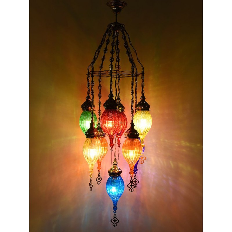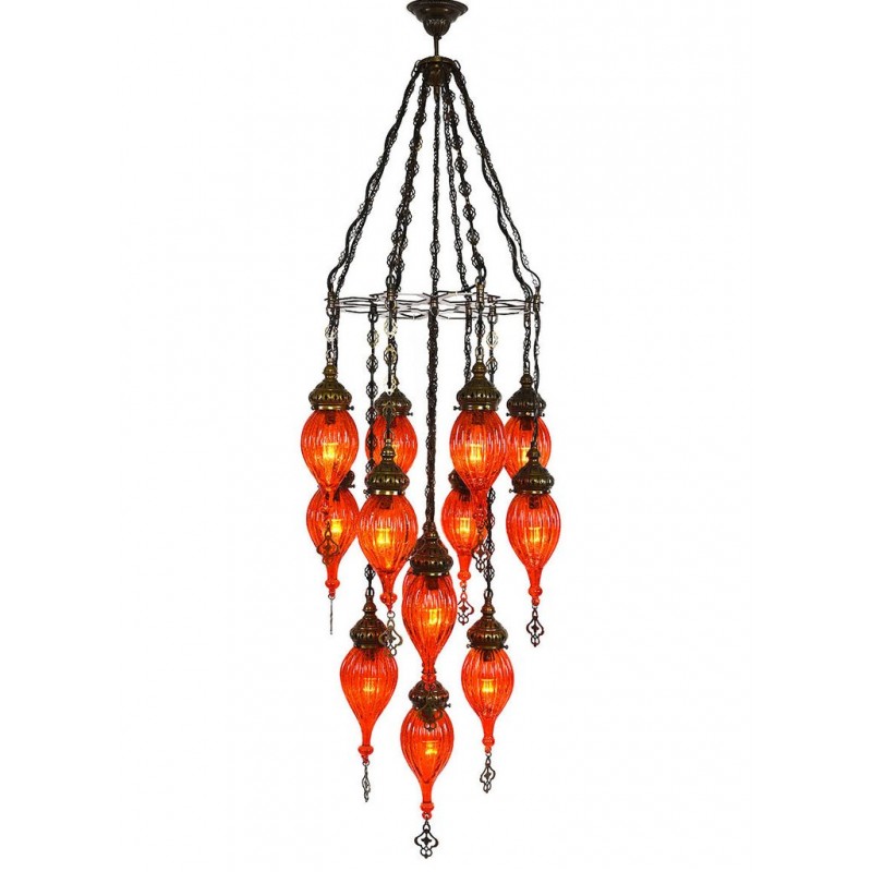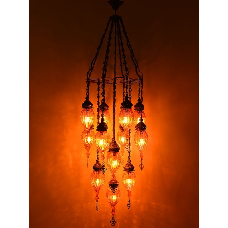 Handmade chandelier with 13 orange hand-blown cracked glass lamps. Oxidized antique brass finish or brushed nickel base available. Original One of a Kind Design Chandelier. No two alike, each chandelier in this design is a one of a kind. This hanging light looks interesting from any angle, and makes nice shadows. One of the technically most particular chandeliers created. We approach this sculptural object in a contemporary, unexpected and creative way. Light and shadow interplay and exist together, there is a subtlety of using both to manipulate space and thought.