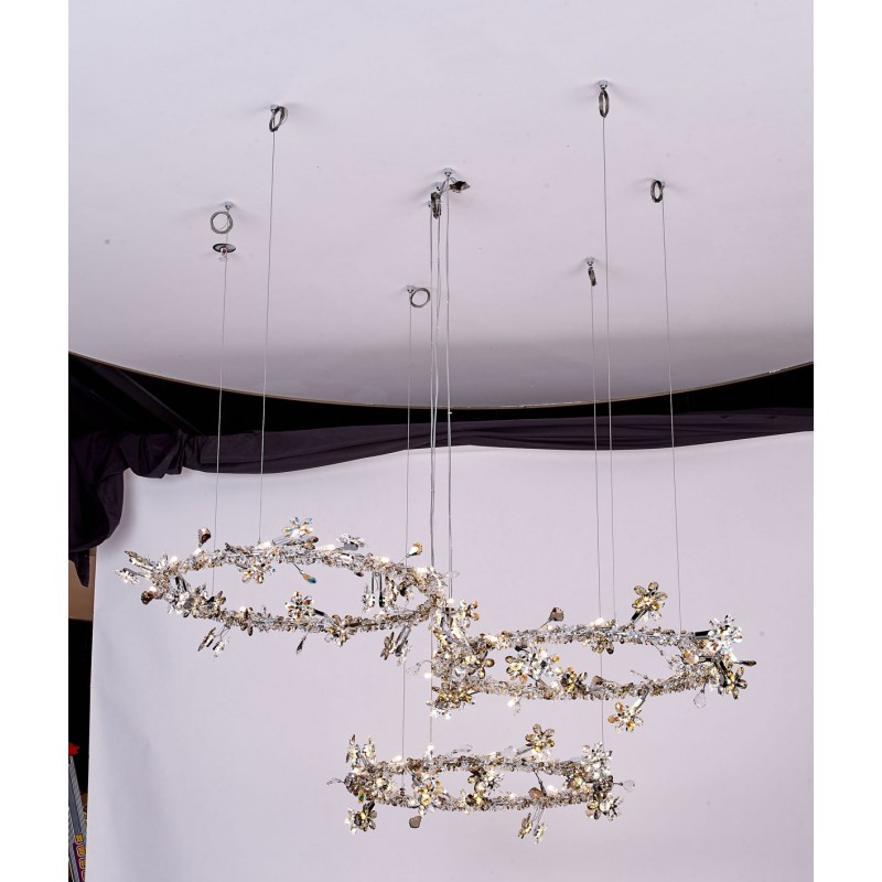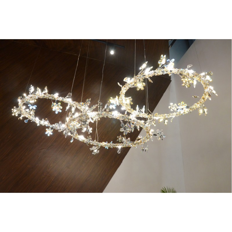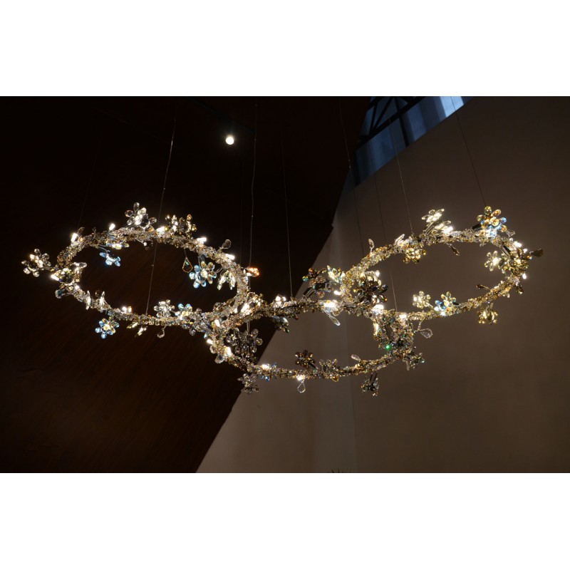Effervescent and organic, the Eden collection consists of nature inspired, sculptural lighting that reinvents the look and feel of a traditional chandelier. Crown of flowers and leaves, evoking a visual celebration of the arrival of spring, enhanced by the crystals captivating beauty. Consisting of an interweaving circular metal branches supporting flower-shaped crystals. Endless variations ate possible through the customization of metal finishes; with the creative myriad of possibilities, each chandelier becomes a one-of-kind work that is as exquisite as the space it adorns.