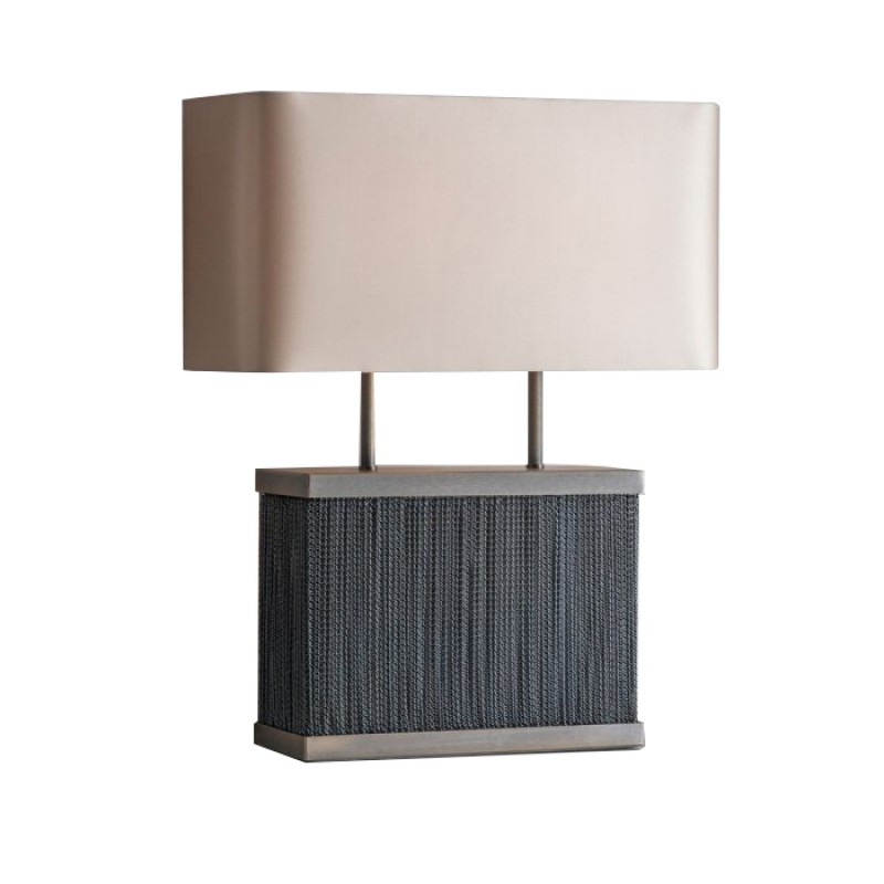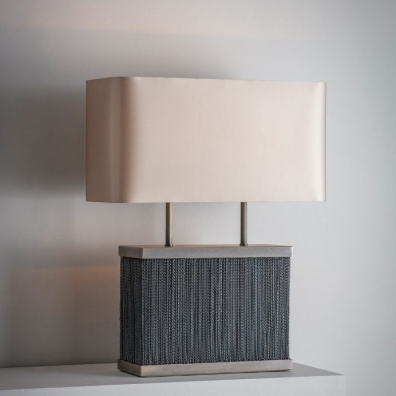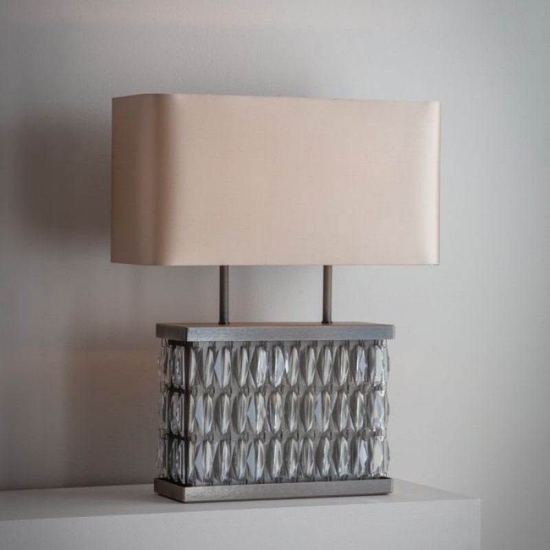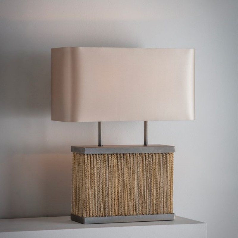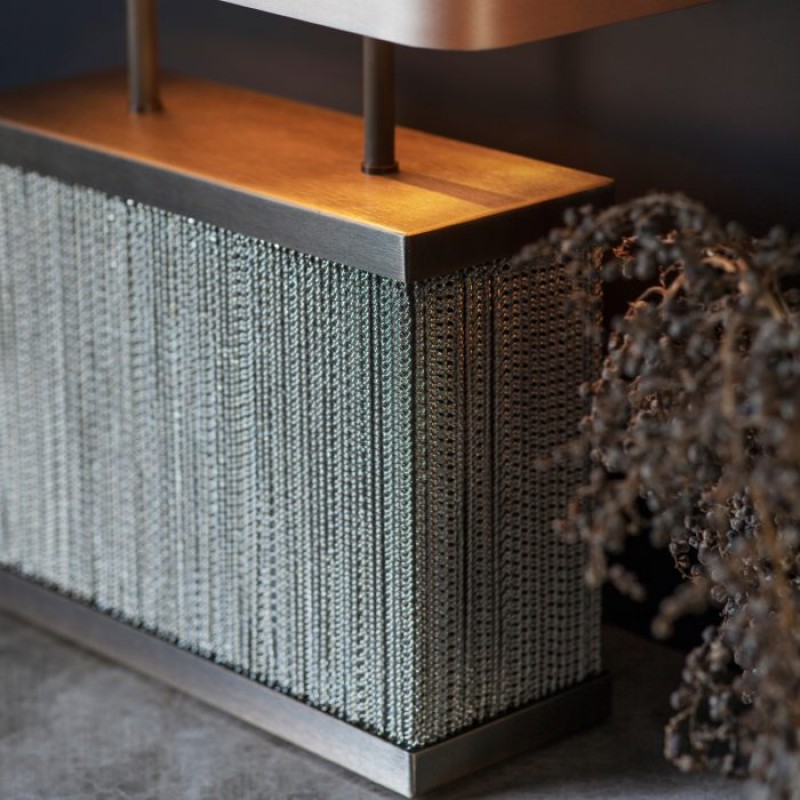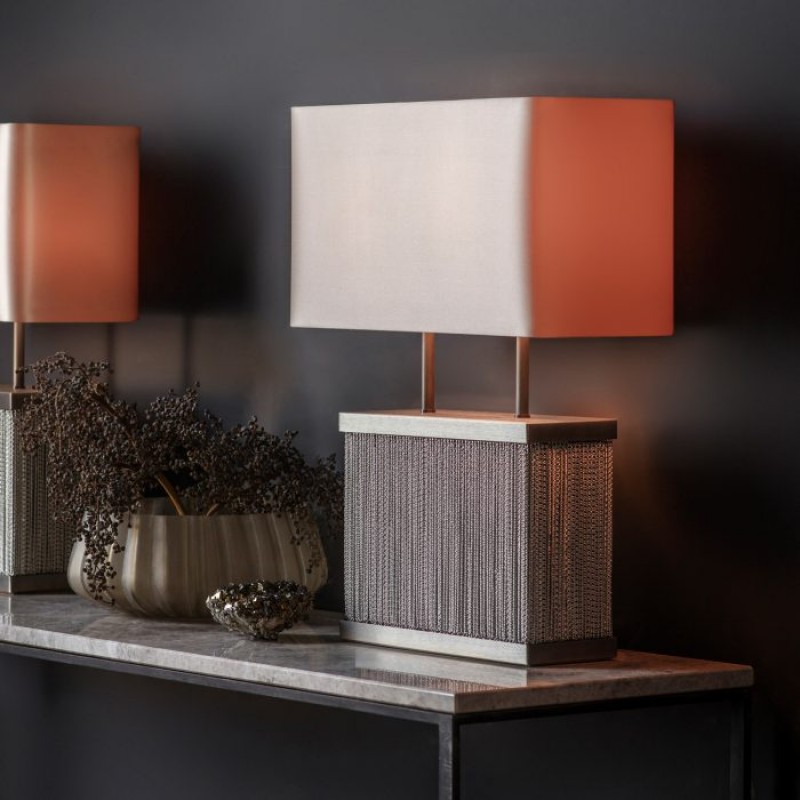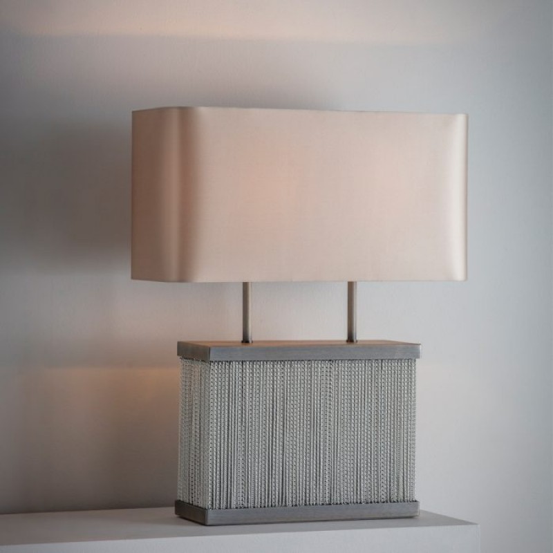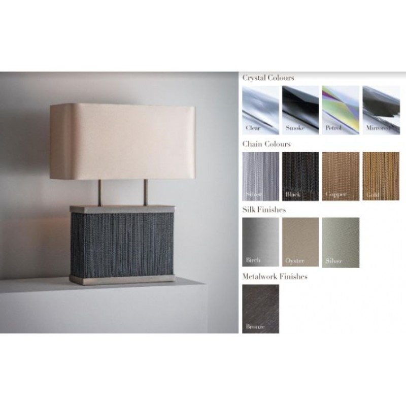 A beautiful Table Lamp featuring our delicate chain, each piece individually cut and attached to create a soft luxurious texture. Available in Silver, Copper, Black or Gold Chain with Bronze metalwork. Available in Clear, Petrol, Mirrored and Smoke Crystal with Bronze metalwork.Birch, Oyster and Silver double-lined silk shades as standard, custom silks upon request.