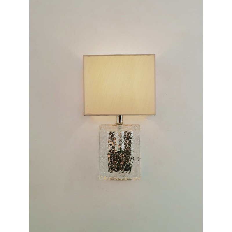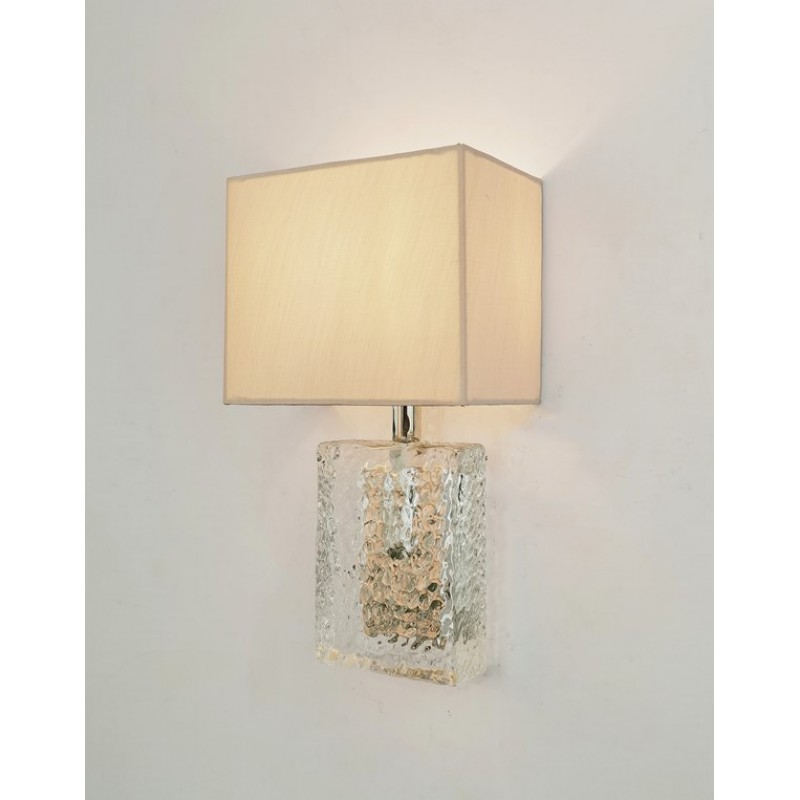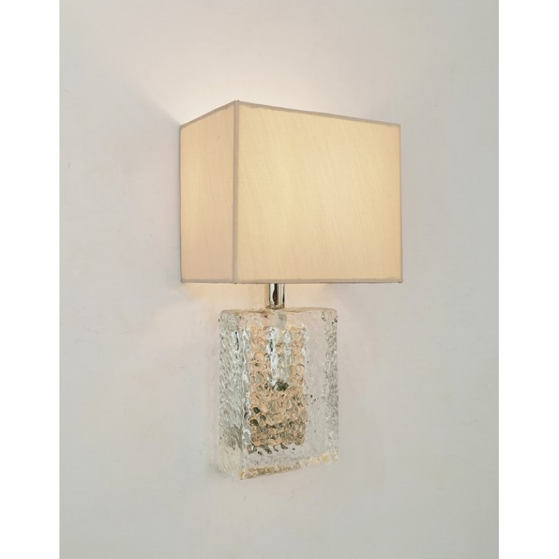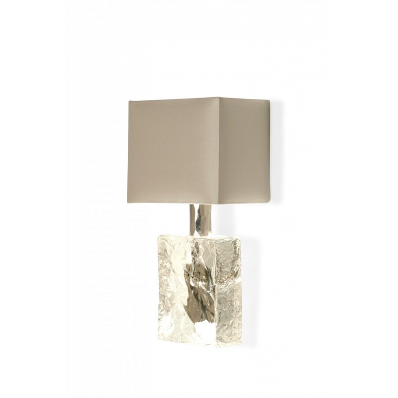 A simple glowing block of Perspex suspended from a chic nickel collar. The shade can be given a clear laminate lining if a higher degree of light is required.