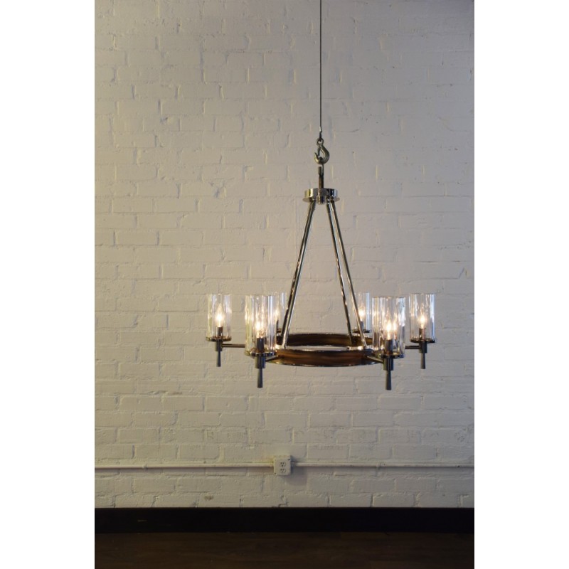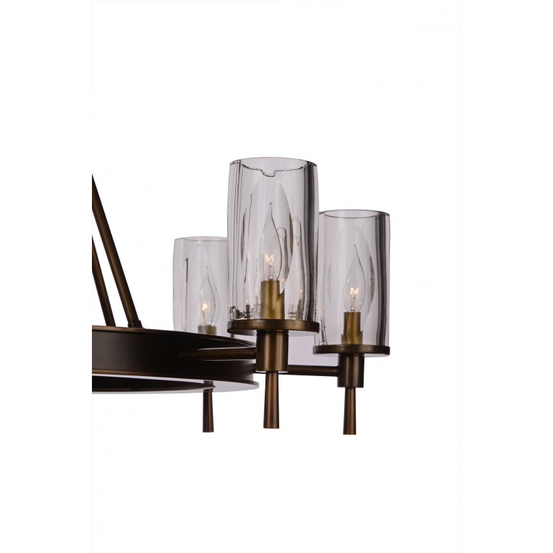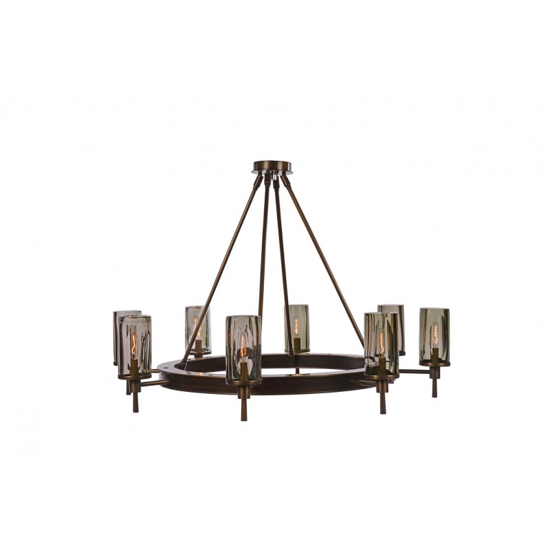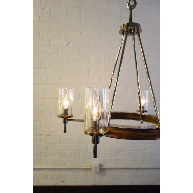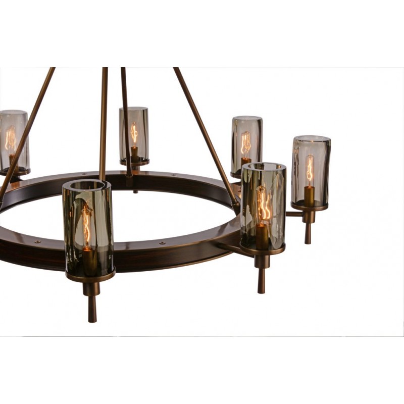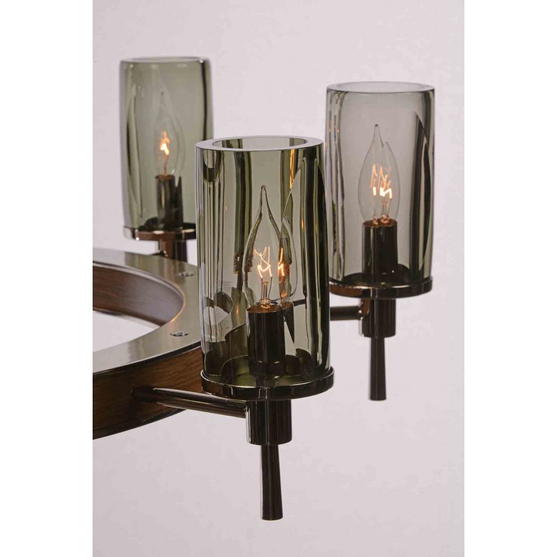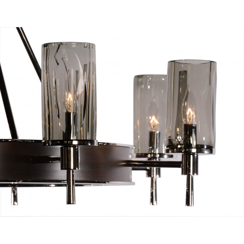 Individually hand blown glass shades with ‘flame’ facets cast graceful shadows as they float on an elegant frame of luxurious metals with a contrasting wood detail. Graceful and refined, Fiammi is a study in organic sophistication. Original one of a kind chandelier. No two alike, each chandelier created from this design is a one of a kind. This hanging light looks interesting from every angle, and creates enticing shadows. One of the most technical chandeliers created. We approach this sculptural object in a contemporary, unexpected and creative way. Light and shadow interplay while existing harmoniously, using both to manipulate space and thought.
