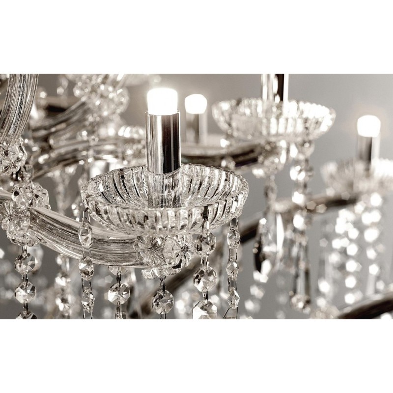 The chandelier is a truly dazzling decorative piece the luminous Clear crystal a revelation sculptural splendor. The composition of this chandelier may range immensely from 6 to 48 lights. Regardless of scale, the chandelier has a central column of cut crystal that resourcefully masks all functional cables. The wealth of ornamentation is enthralling, festooned with chiseled prisms, sparkling pendants. The key to an elegant, opulent, bespoke design is understanding the aspirations of the client, the relevance of location, and maximizing the potential of existing elements in the space.
