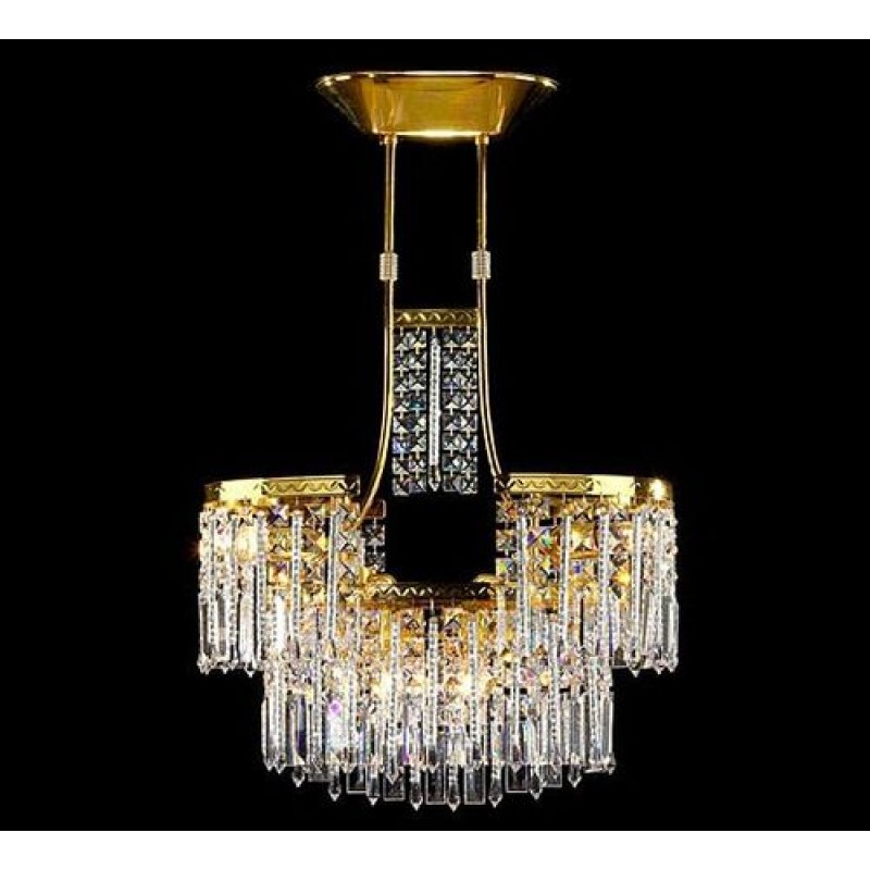 This eye-catching 24kt gold plated baguette style chandelier is stunning, and like our other pieces, is customizable as well. You may choose one of the following transparent outer-cover color options of: clear, black, red, or beige. It features 22 mm clear, flat baguette style high-quality crystal pieces and measures in at 24” long x 36” height (for the size featured) and would be lovely in almost any space that is looking for a luxurious and eye-catching piece. It's truly a show stopper with its shimmering gold plated finish and beautifully laid out crystals and is a piece to truly cherish wherever it's placed.