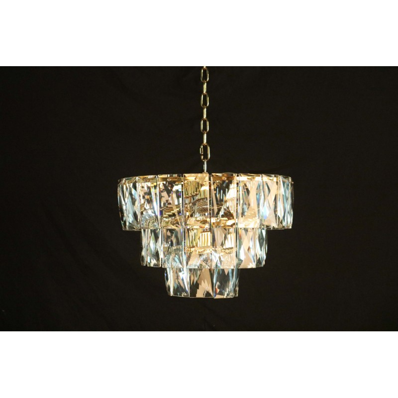 Inspired by a German chandelier from the 1970s, our fixture evokes the boldness and glamour of the era. A band of faceted crystal glass prisms reflects and refracts the light, capturing the essence of emerald-cut diamonds. Because our lightings are made by a workforce that still relies on traditional working methods, each product is unique and carries with it sensitivity of the artisan. Attract attention, provoke emotion whet the imagination with games of light and matter, such is the ambition and the creative spark of existing elements of the space. A wonderful tall Art-Deco glass prism chandelier, designed to be suspended in any space in your house, As the light hits the glass prisms it is refracted in all directions for a dazzling light display. If you would like to talk to us about different sizes and possible glass colors, please get in touch.