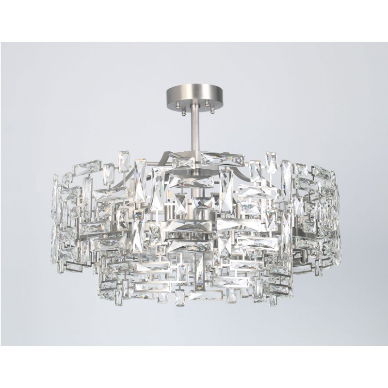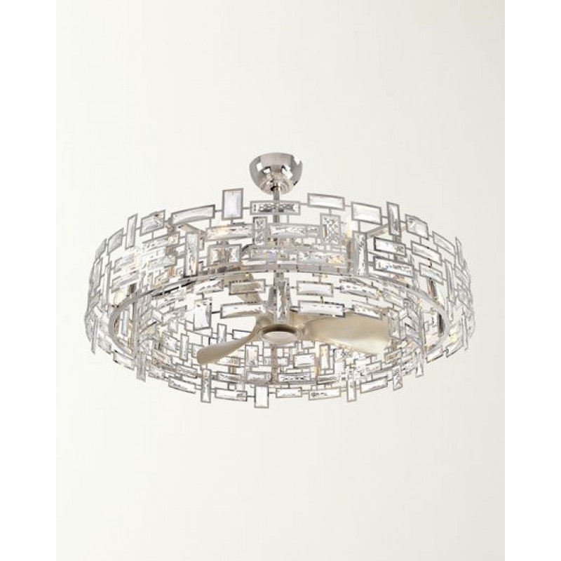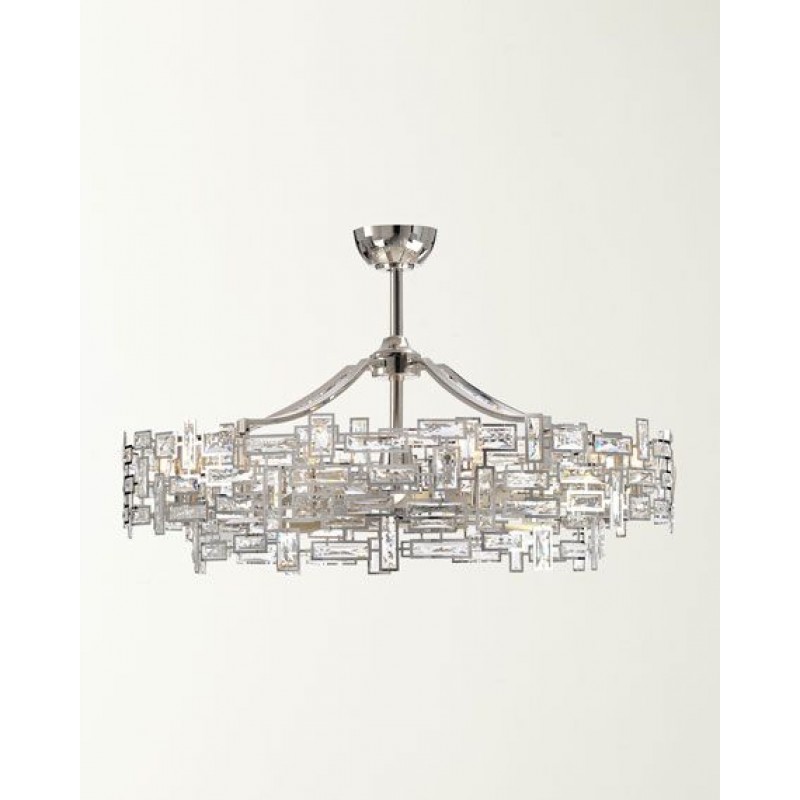 A contemporary Fandelier with two tiers of faceted crystals and ten lights. All fixtures can be customized by the number of lights, style, color, and size to meet your specific needs. Every light can also be combined with a matching table lamp and wall lamp to accomplish the best room design. At Alan Mizrahi Lighting Design, we supply and manufacture many highly sought after designer pieces.
