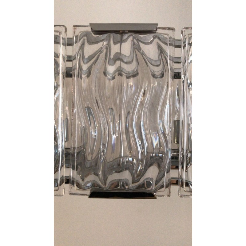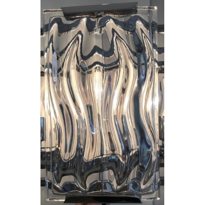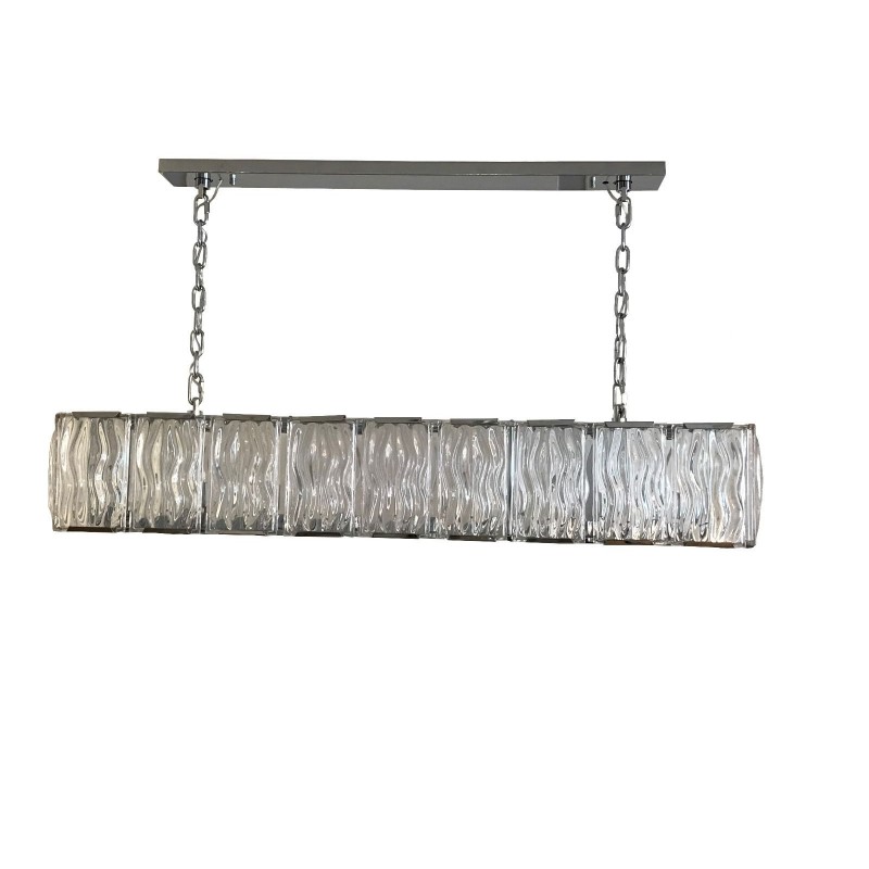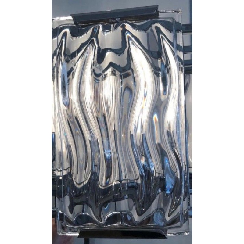 Inspired by a German chandelier from the 1970s, our fixture evokes the boldness and glamour of the era. A band of hand pressed wavy glass panels reflects and refracts the light, capturing the essence of the glass. Because our lighting is made by a workforce that still relies on traditional working methods, each product is unique and carries with it sensitivity of the artisan. Attract attention, provoke emotion whet the imagination with games of light and matter, such is the ambition and the creative spark of existing elements of the space.