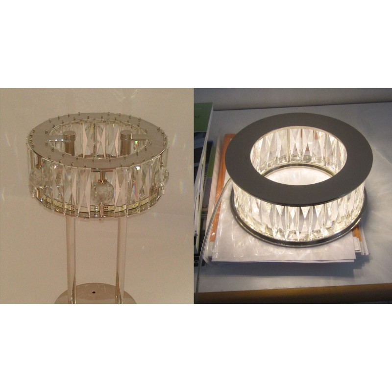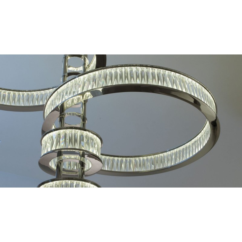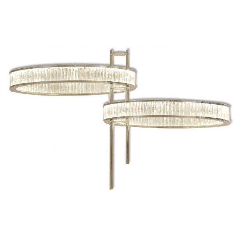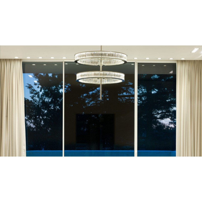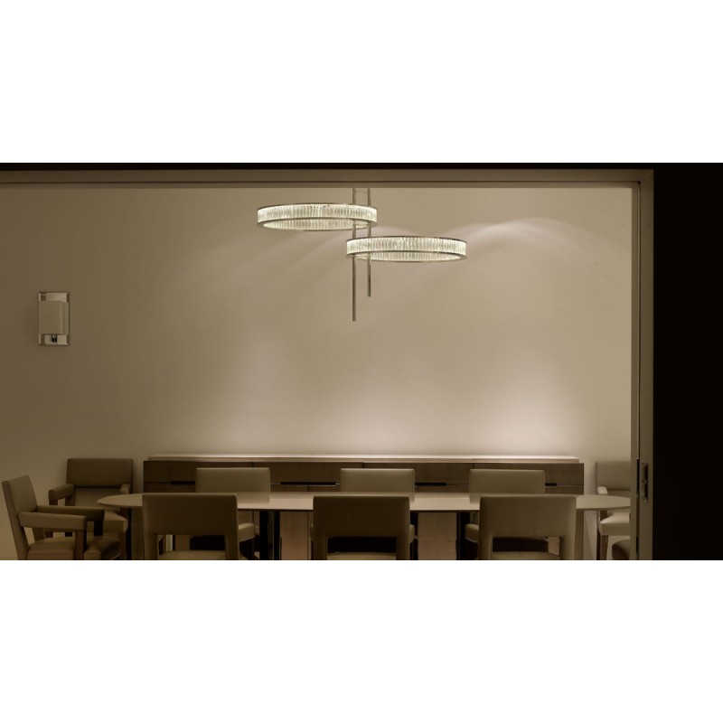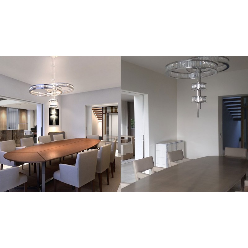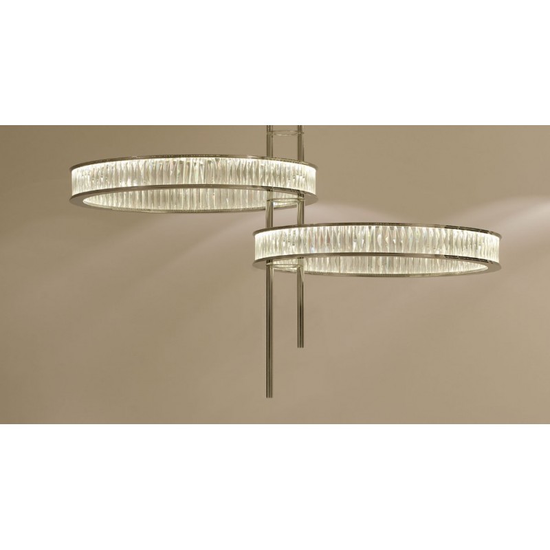 The chandelier created reflects the binding love of a family. Rings of crystal are a very common element in modern lighting, and nothing special for themselves. But what Elliott Barnes challenged us to try again proved our team as true experts. Supporting the two large rings, alone, was a very nice problem. By exactly pre-tensioning the 80 cm wide rings along the central column, they level gracefully under their own weight. The hand-cut crystals are encased between the rings in circumferential grooves, showing no visible connections.