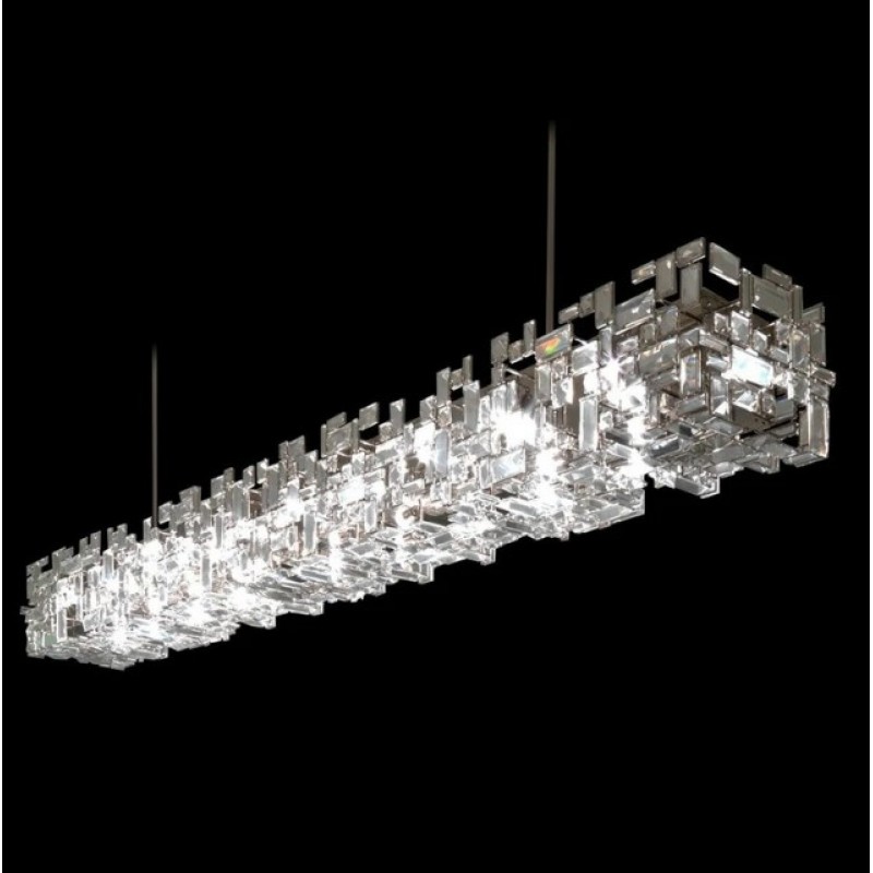 Ice and sparkle were the general motive of inspiration.  Extrapolating the original design of Hans Harald Rath from 1966 into the 3rd dimension created not only a simple yet stunning light fixture, but also opened the door to an incredibly versatile design template. The frame is constructed so thoughtful that it took only one person to install the whole 3,5 m fixture. A more this-worldly benefit of the design line is that the metal grids with crystals can be easily removed and processed in a dishwasher.