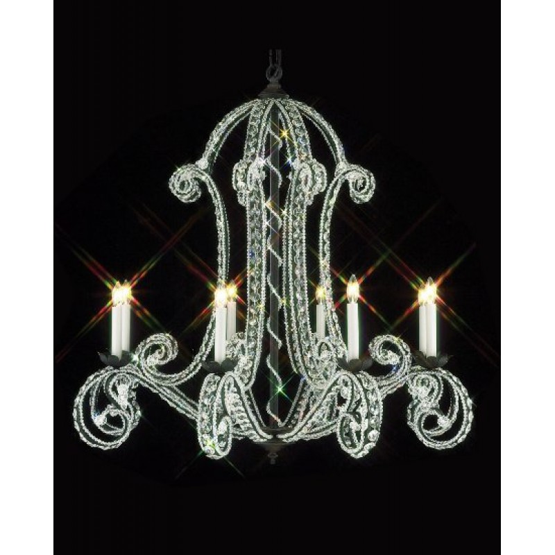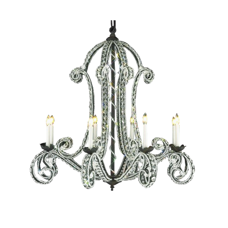 A dazzling cage replete with jeweled ribbons of light, the Aurora collection holds a glamour and mystery that lends itself to any interior environment. Its simple symmetry projects an incredible balance of majesty and magic. The intricate scrollwork of these rustic finished frames give these chandeliers a universal appeal that can just as easily be found in a contemporary SOHO loft as they can in a sprawling California ranch style mansion. Available in a variety of finishes these majestic chandeliers are exotic yet simple and will capture your heart just as the crystals capture the light. Ribbons of multifaceted crystal beads wrap and encompass the entire frame spinning and coiling around the arms and the center column creating a distinct, elegant, and decadent appearance.