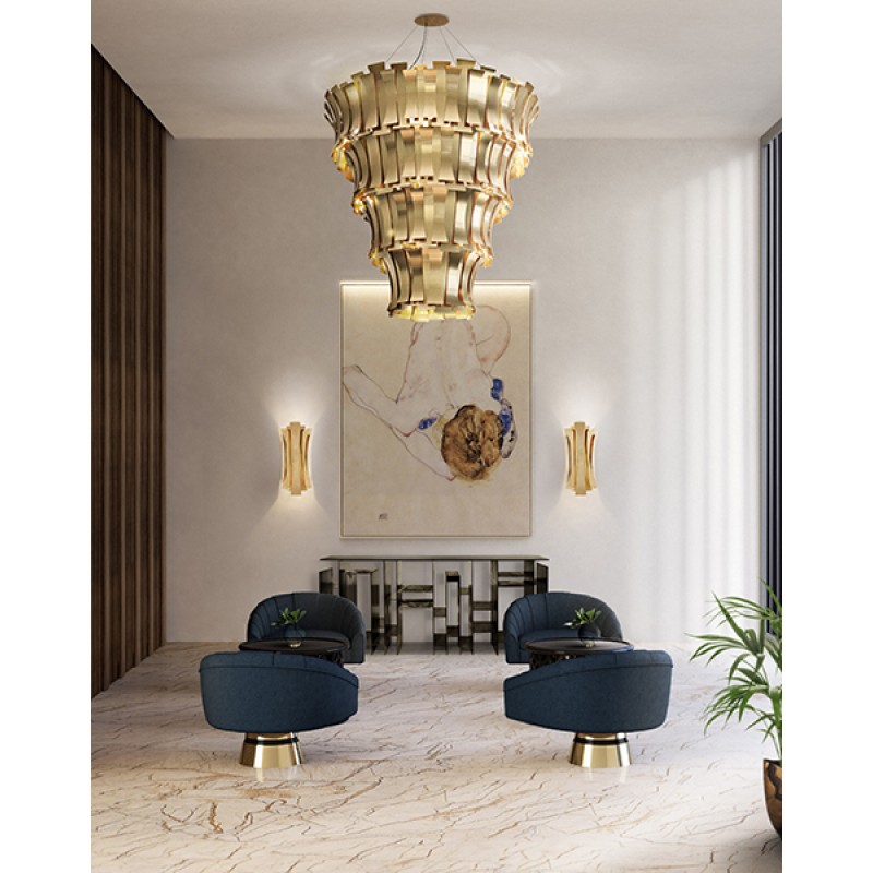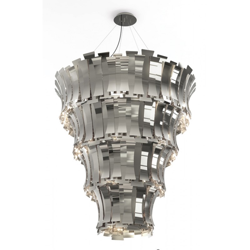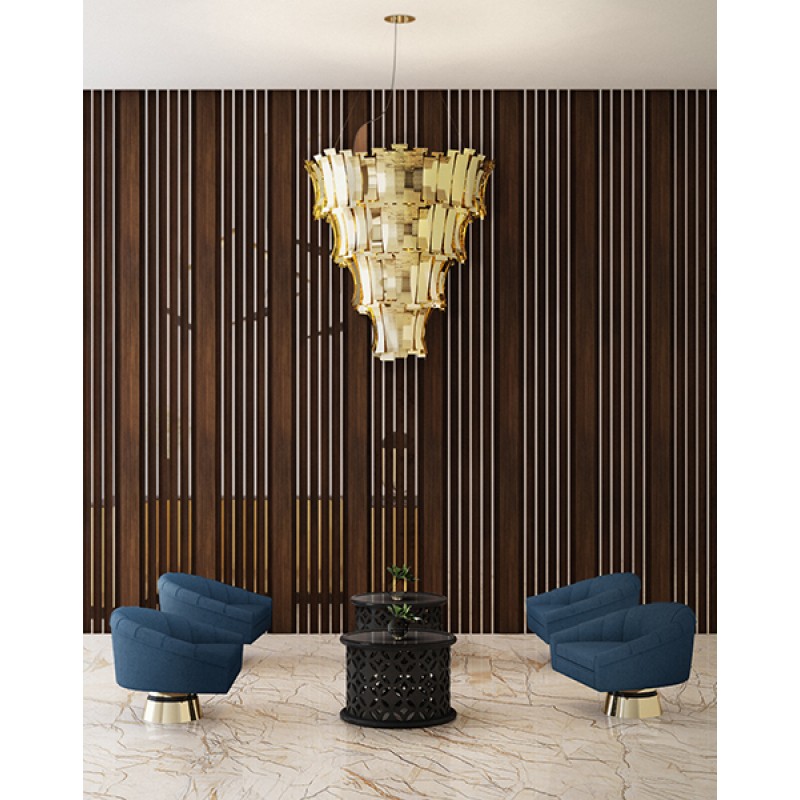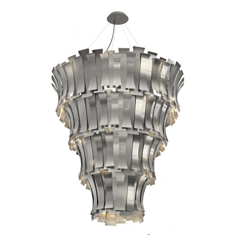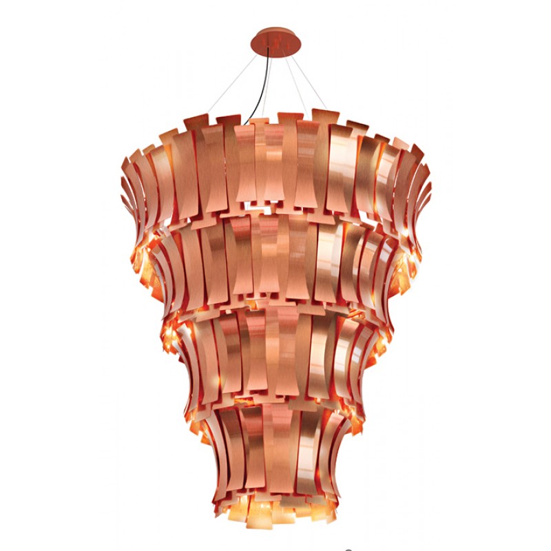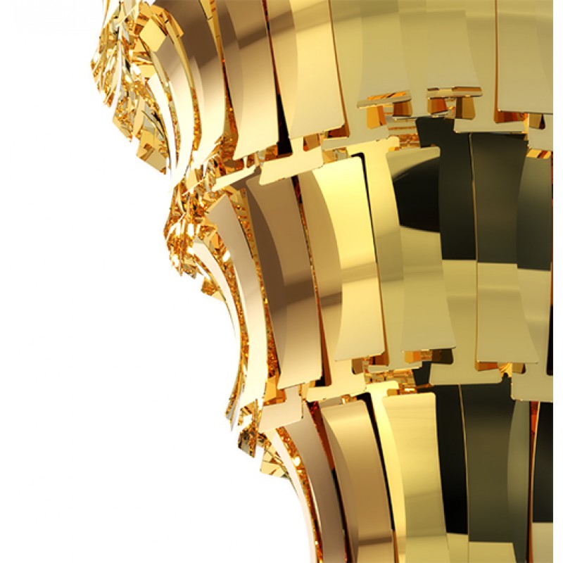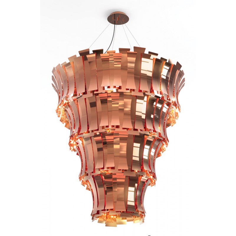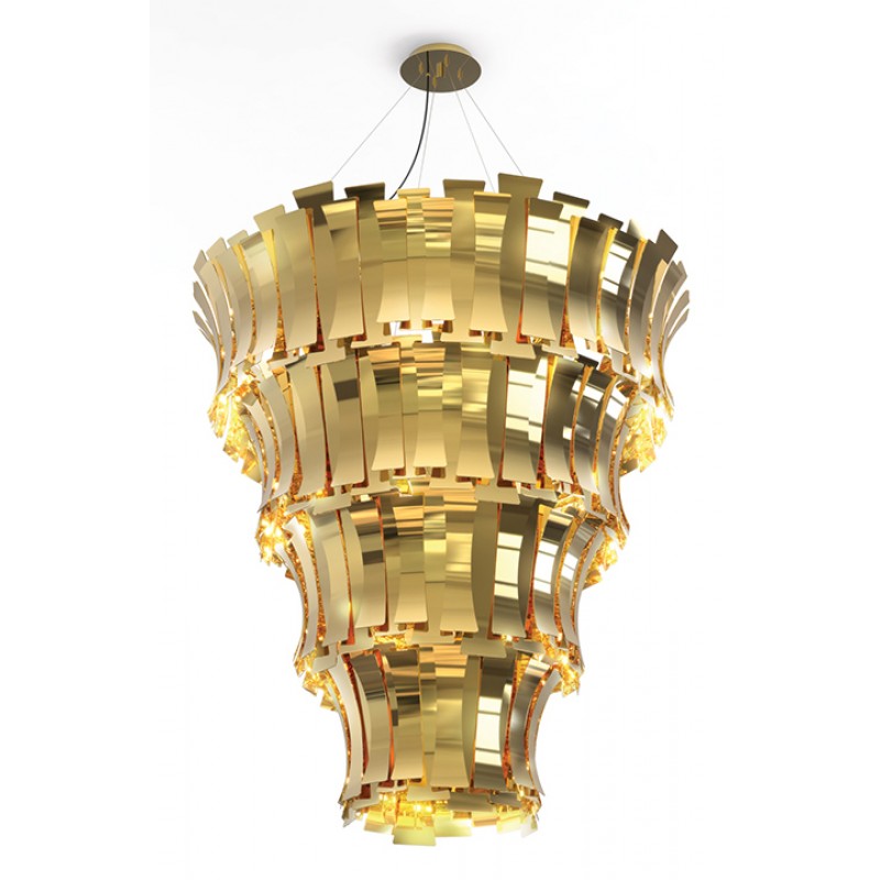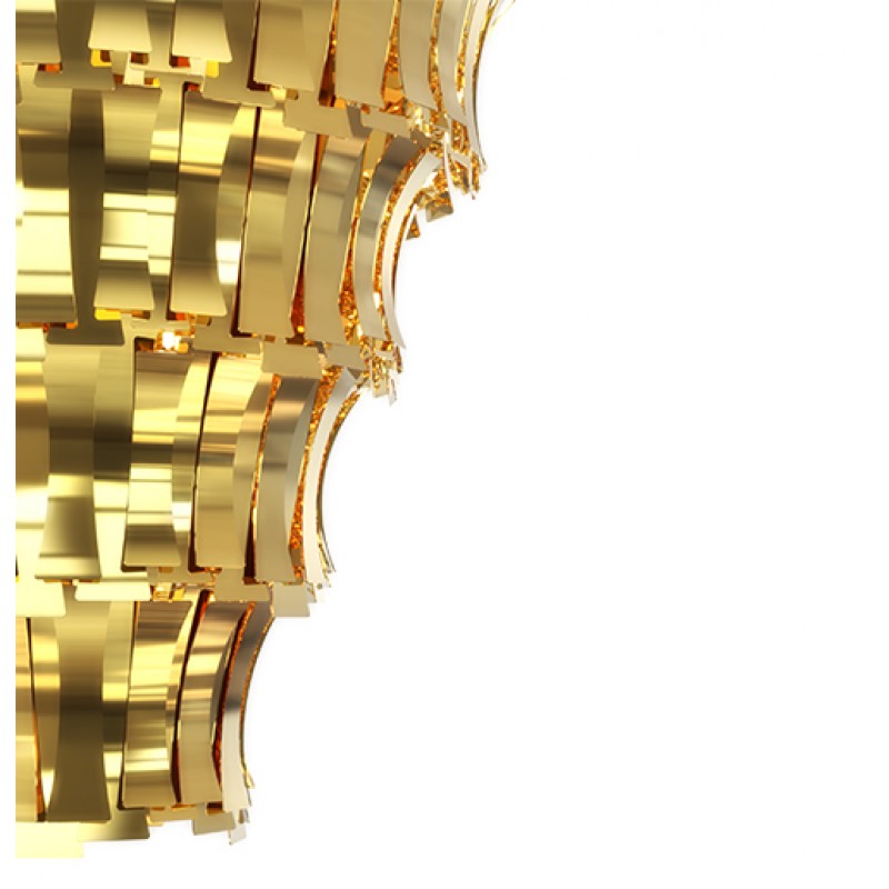 Etta suspension fixture has a nostalgic feminine retro glow. Courtesy of the jazz singer Etta Jones. A luxurious chandelier that provides a soft and warm light through its layers, giving a romantic ambiance to any setting. All brass leaves are shaped and assembled by hand. Custom made versions can be done upon request.