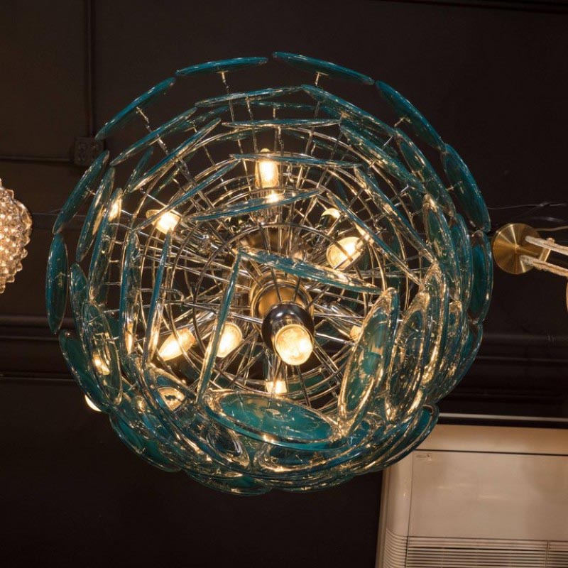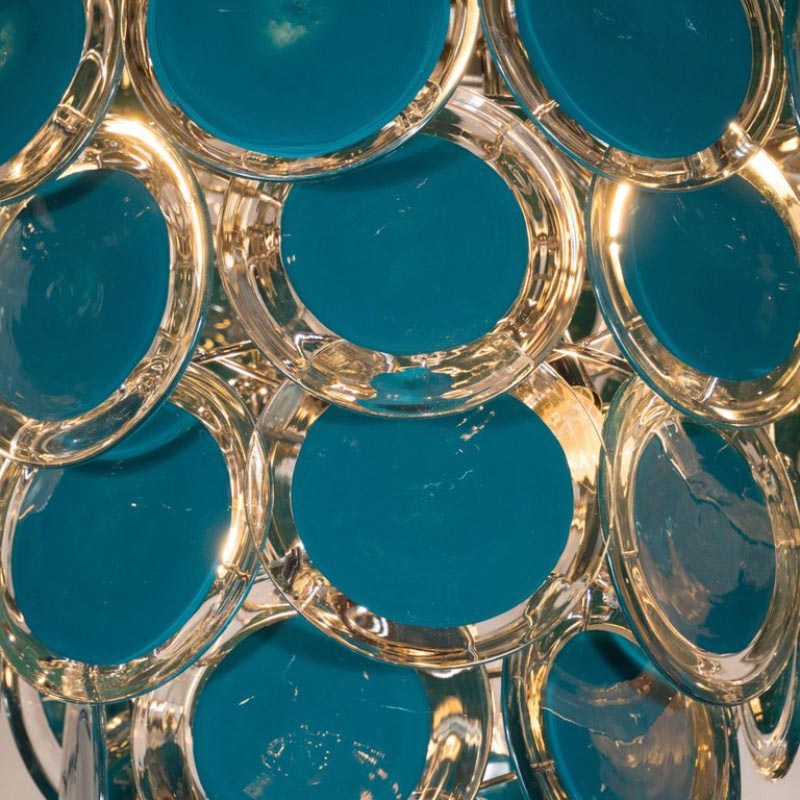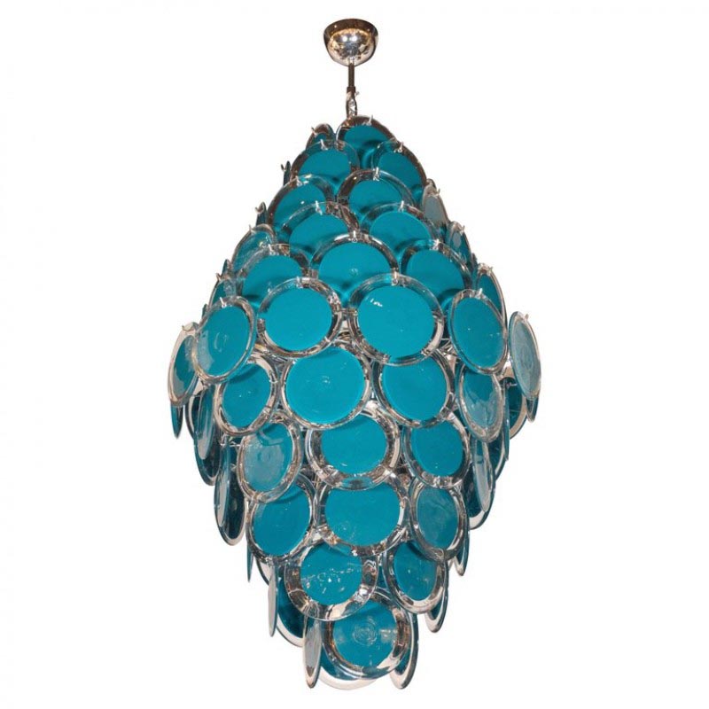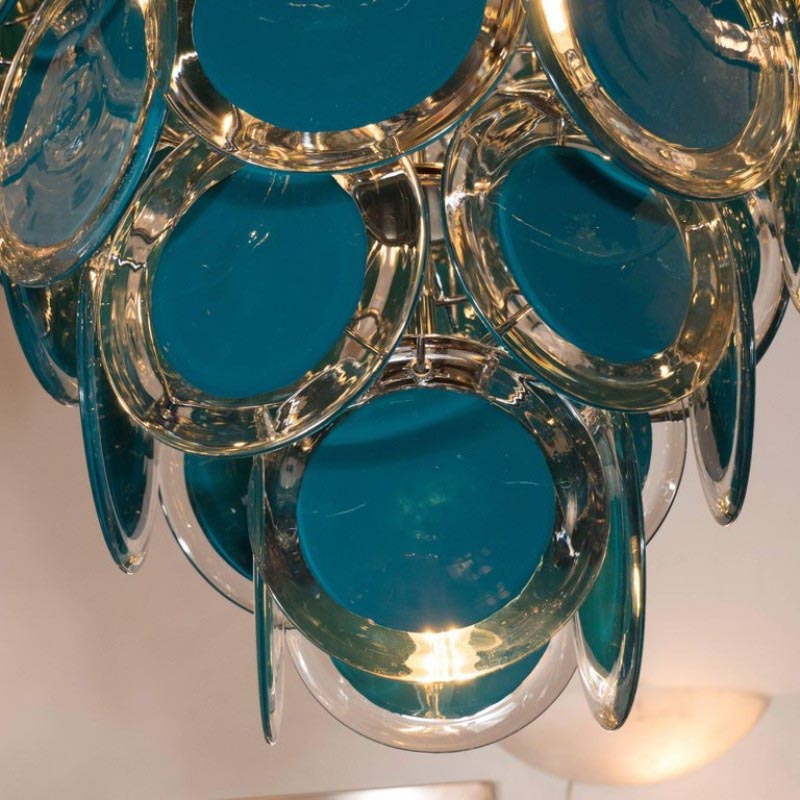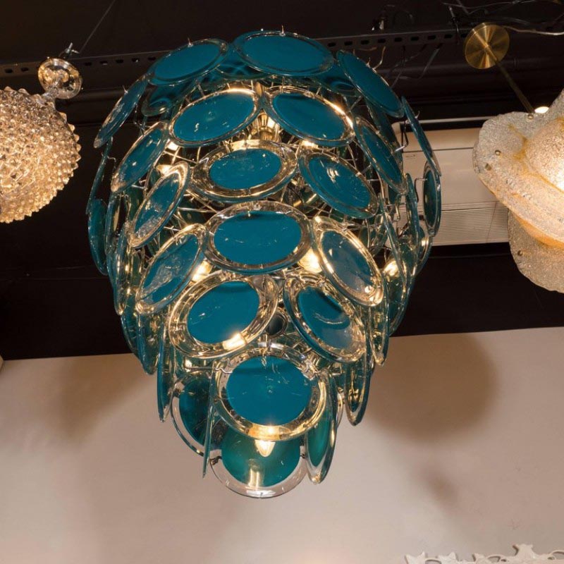 This stunning and bold chandelier was handblown in Murano, Italy. This island off the coast of Venice has been renowned for centuries for their superlative glass production. It features ten tiers of cerulean blue discs with clear perimeters that taper at its top and bottom, artfully concealing the bulbs within, supported by a lustrous chrome frame. This fixture, with its beautiful blue hue resembling the water color of the Amalfi coast, works equally well as an accent fixture and the main event, both illuminating (and visually holding court) in a large room with ease. While it provides a soft and diffuse radiance, it is also plenty luminous with eleven Edison based bulbs, providing up to 1100 watts of light.