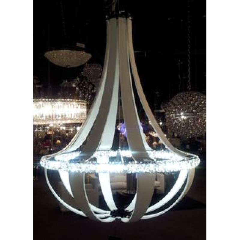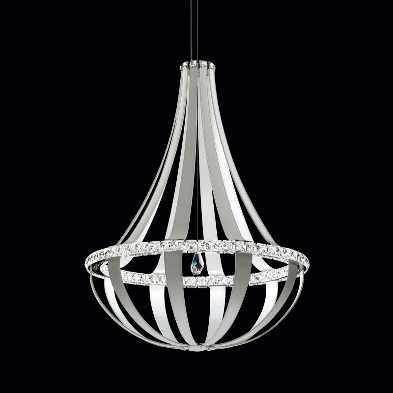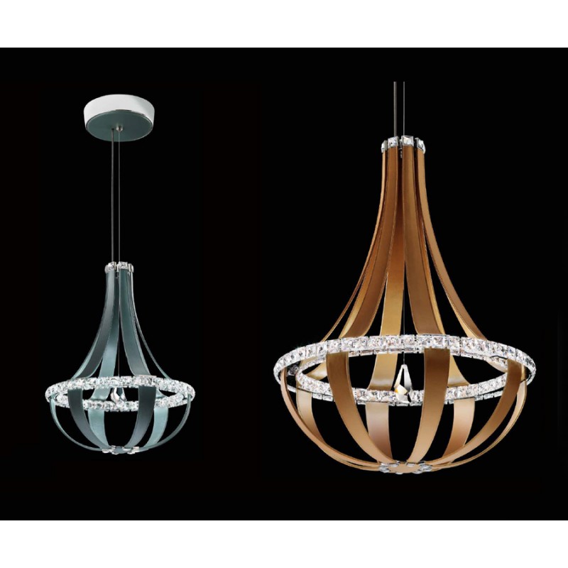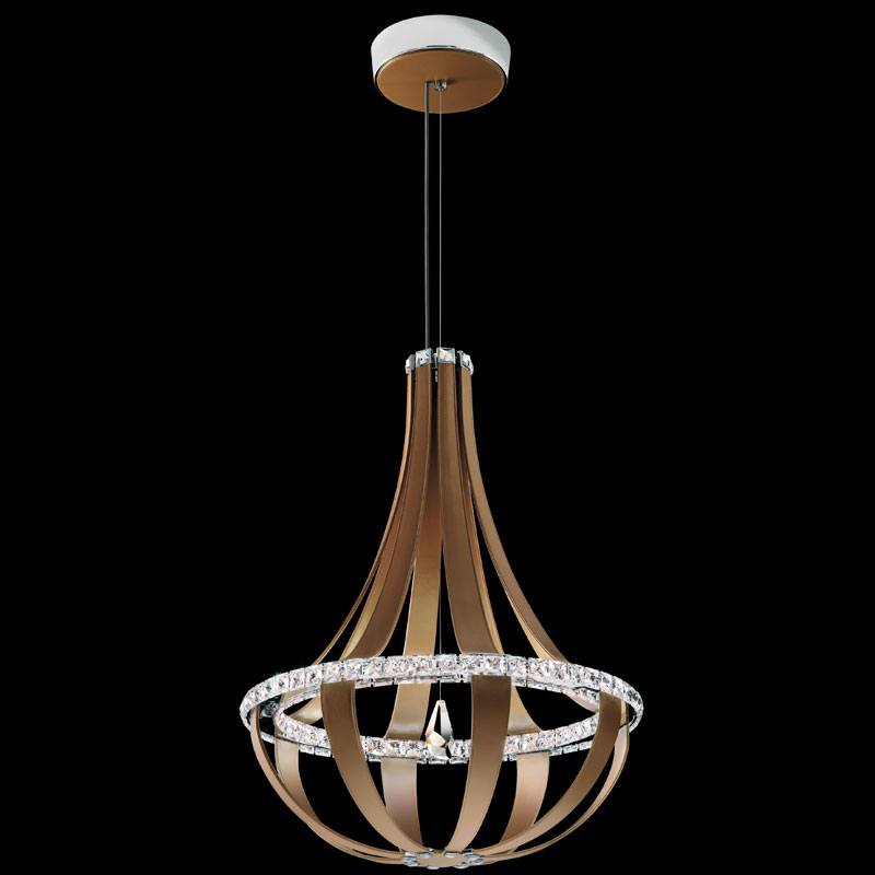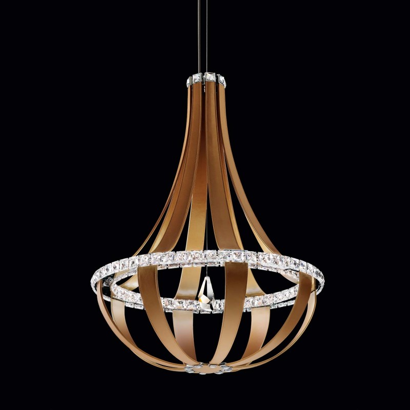 Crystal Empire Pendant takes the classic chandelier structure and uses its elements in new, eye-catching ways. Here, crystal is not merely an accent; it's the sparkling frame. Leather straps become the main decorative element, curving between the structural crystalline bands.