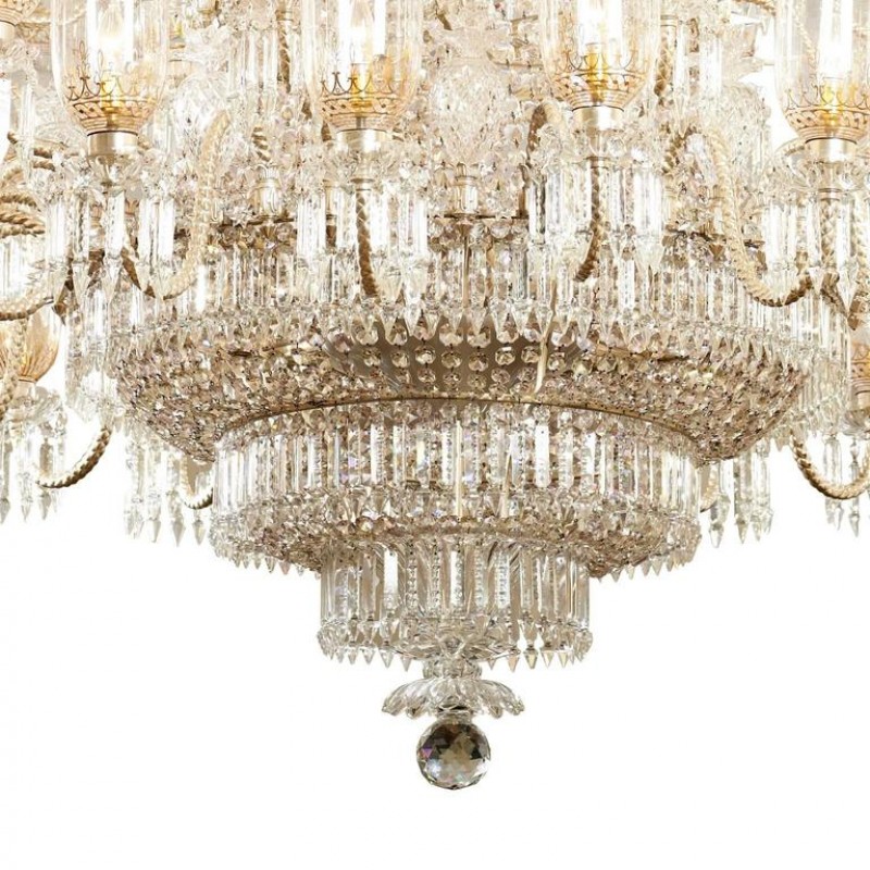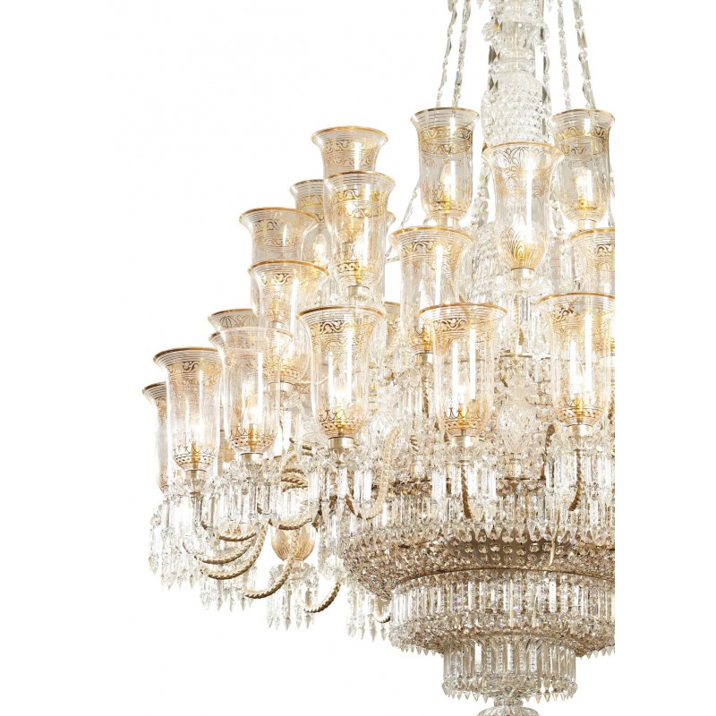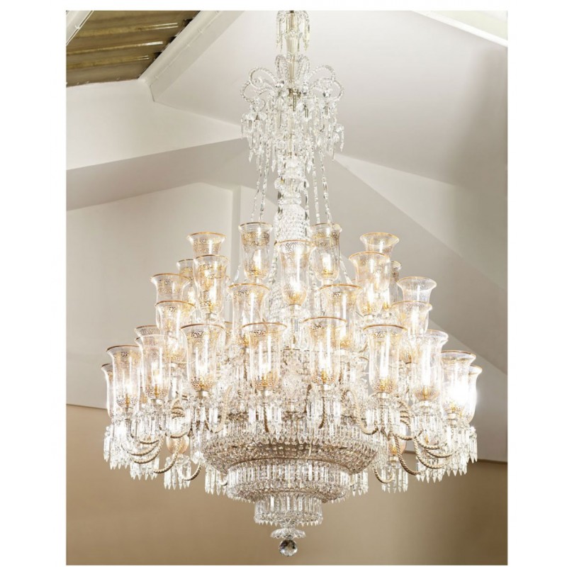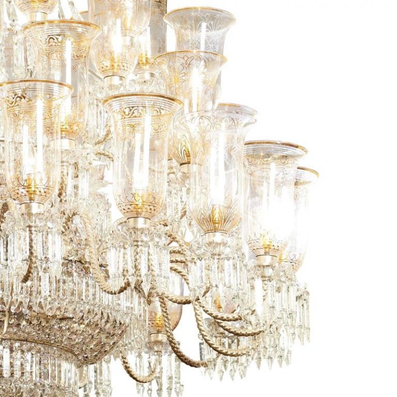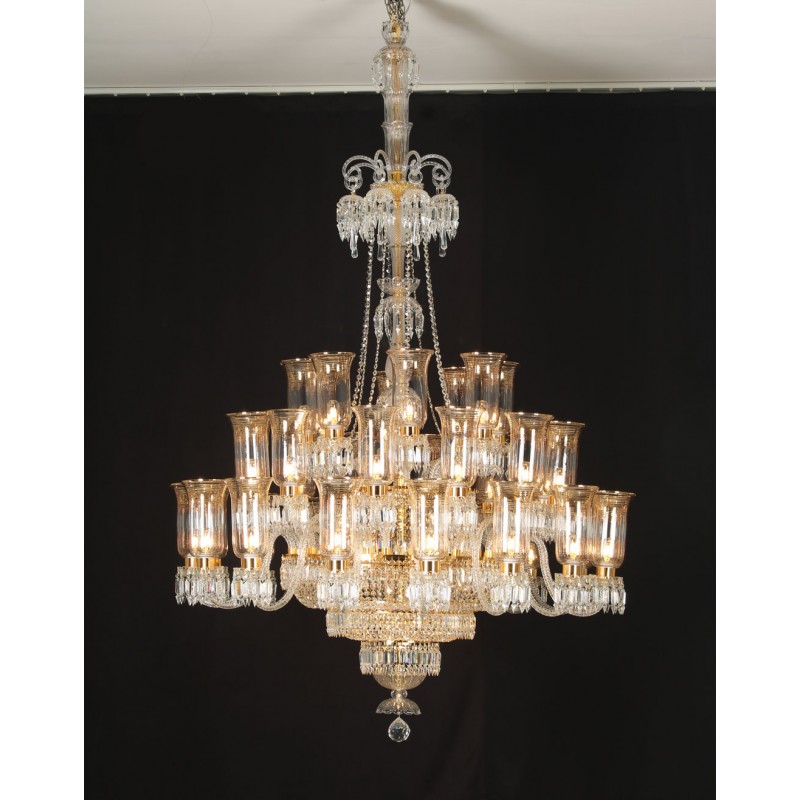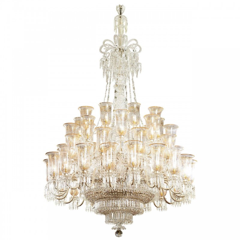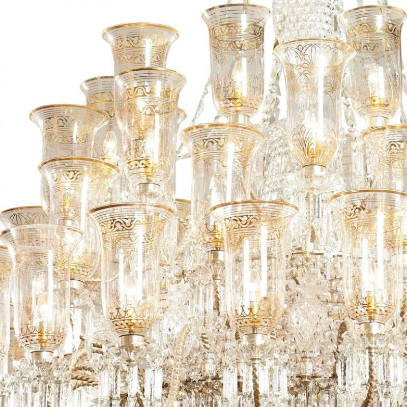 This exceptional, handcrafted antique chandelier is a truly magnificent work of art. Unusual for its large size and beautiful design. The chandelier's central basket is hung with faceted drops; from the center of the chandelier issue four tiers of sixty-four lights on scroll branches with gilt etched 'hurricane' shades. The chandelier hangs from a central baluster, and is breathtaking for its impressive beauty and scale.