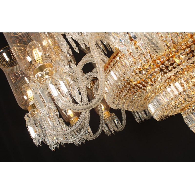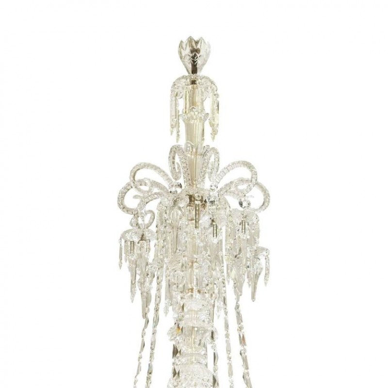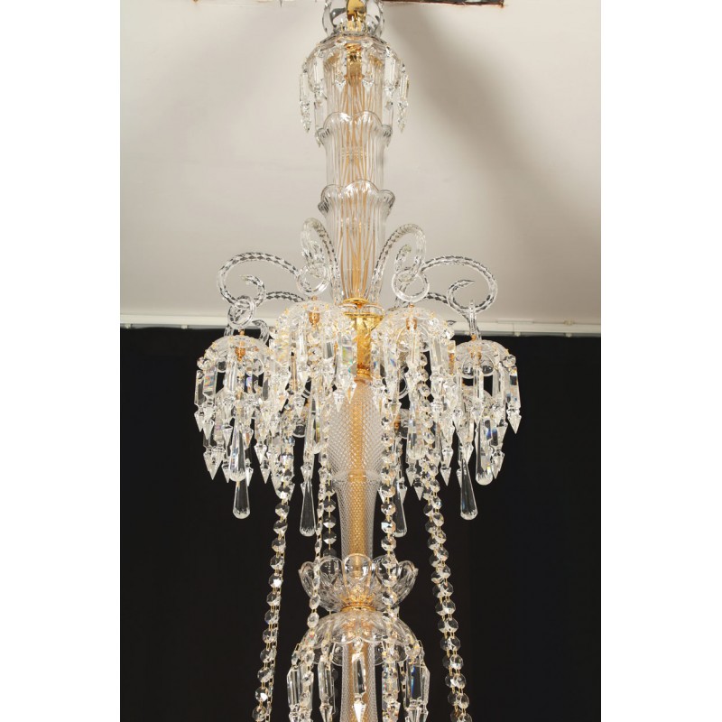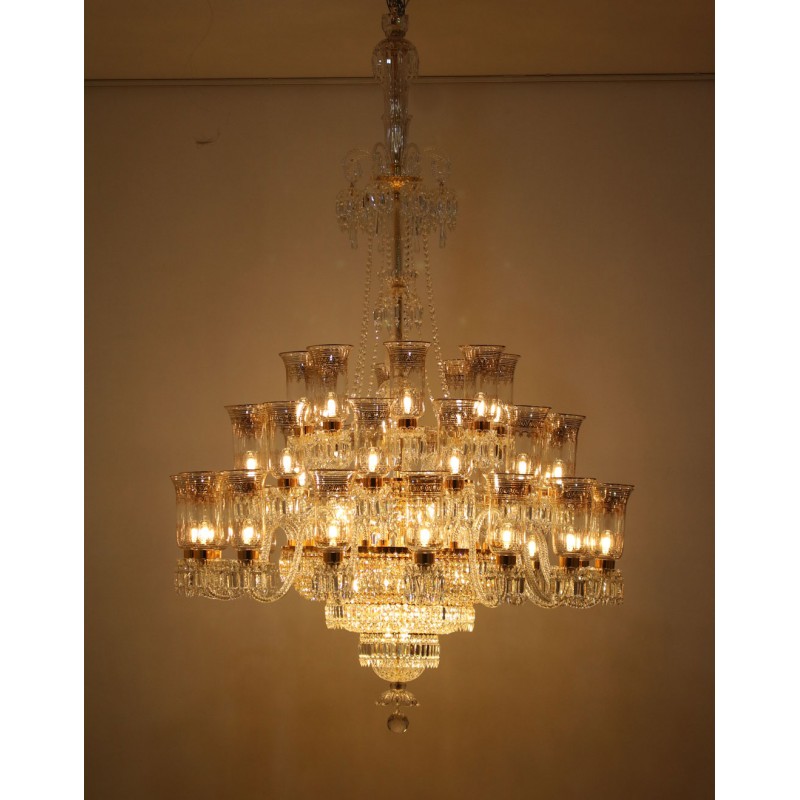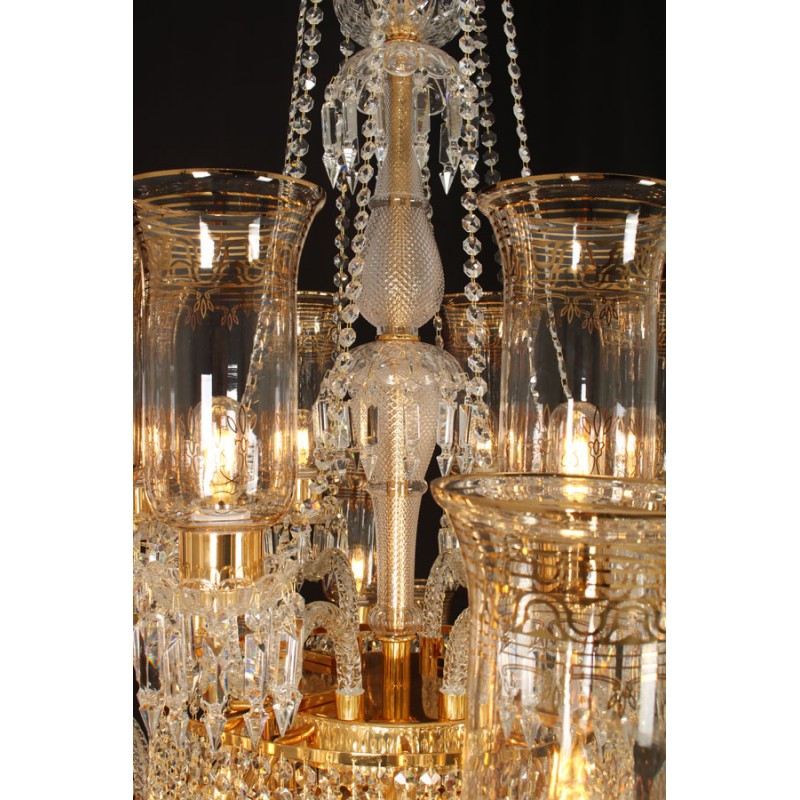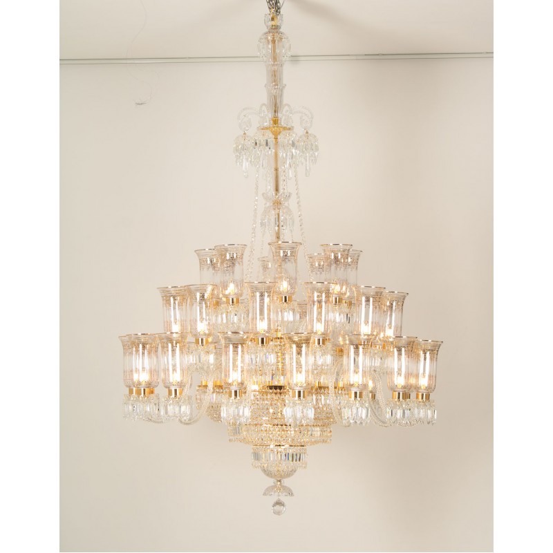 This exceptional, handcrafted antique chandelier is a truly magnificent work of art. Unusual for its large size and beautiful design. The chandelier's central basket is hung with faceted drops; from the center of the chandelier issue four tiers of sixty-four lights on scroll branches with gilt etched 'hurricane' shades. The chandelier hangs from a central baluster, and is breathtaking for its impressive beauty and scale.