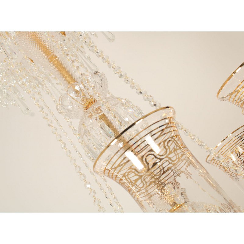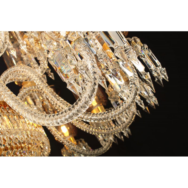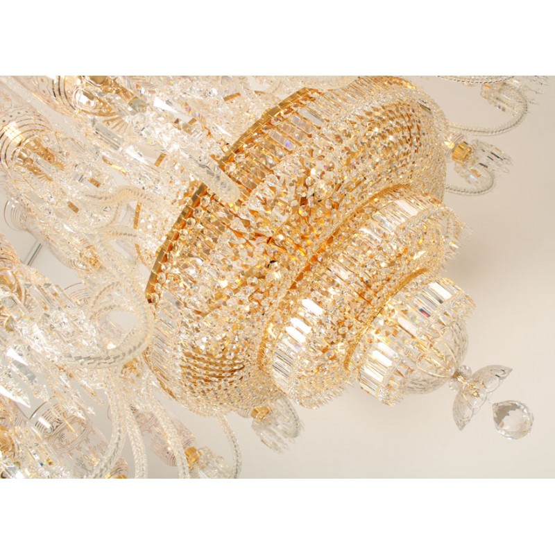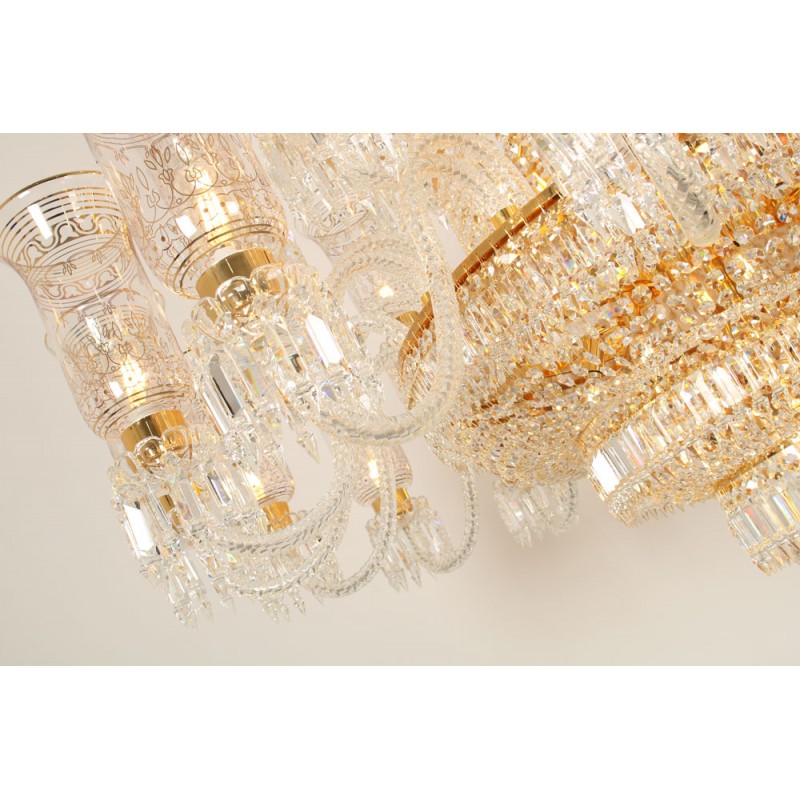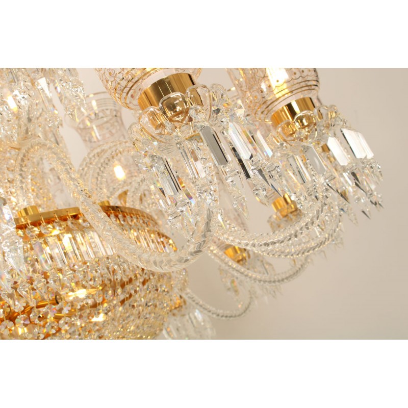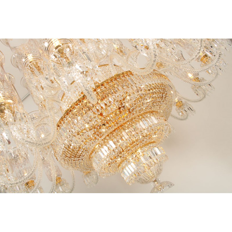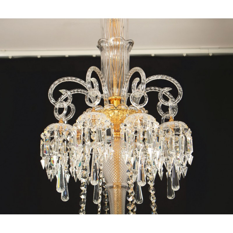 This exceptional, handcrafted antique chandelier is a truly magnificent work of art. Unusual for its large size and beautiful design. The chandelier's central basket is hung with faceted drops; from the center of the chandelier issue four tiers of sixty-four lights on scroll branches with gilt etched 'hurricane' shades. The chandelier hangs from a central baluster, and is breathtaking for its impressive beauty and scale.