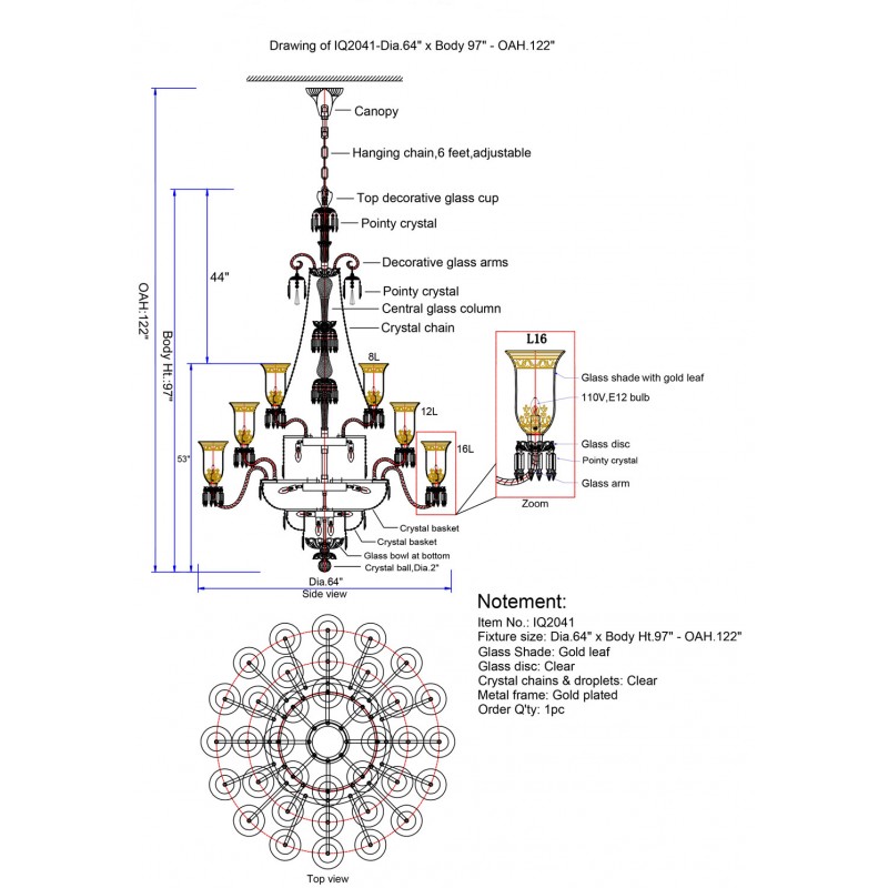Bulbs: 40 Watt 110 V USA/220 V Europe -candelabra bulbs (included)