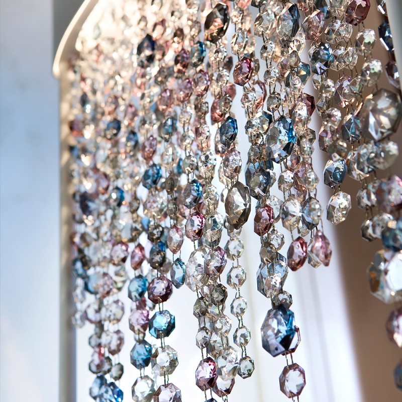 Modern White Chandelier Style Floor Lamp. Embracing modern design elements with classic chandelier style. This LED floor lamp combines a metal matt white powder- coated frame together with a profusion of Italian pastel coloured half cut glass pendants creating a stylish modern light.