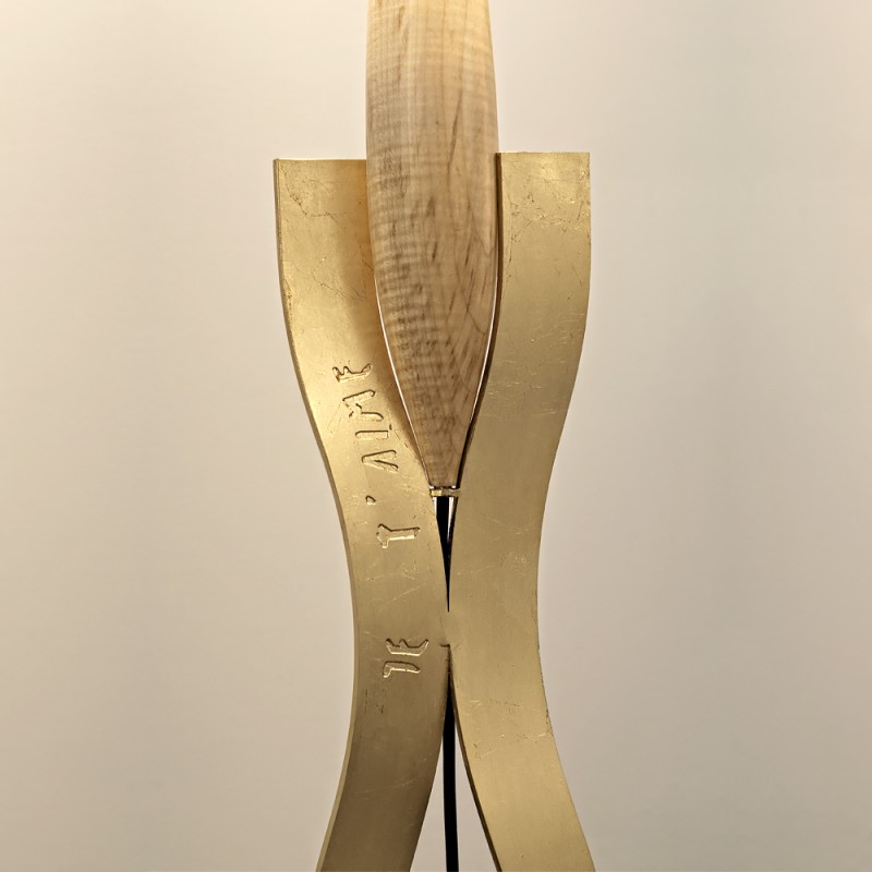 Gold Leaf Floor Lamp. This unique floor lamp expresses an understated personality. A beautifully hand-forged floor lamp finished with the sumptuous gold leaf is subtly inscribed with the words “I have a secret, I love you”.