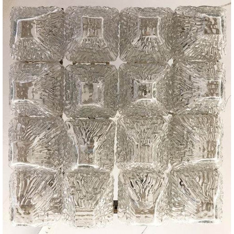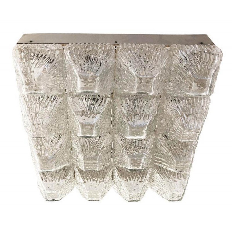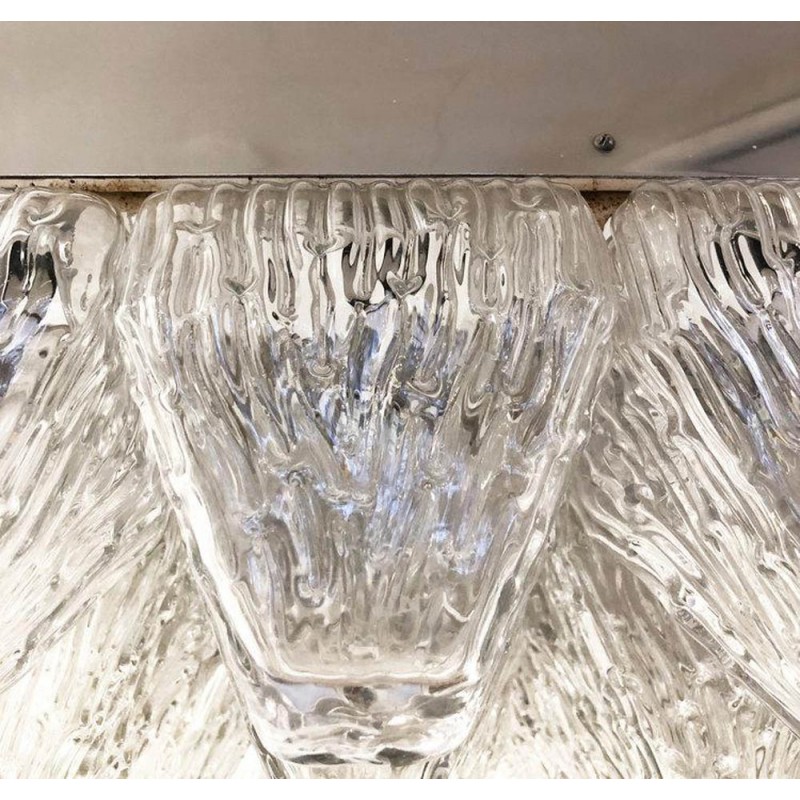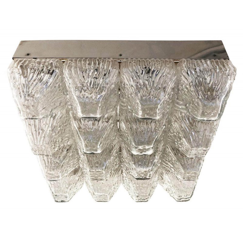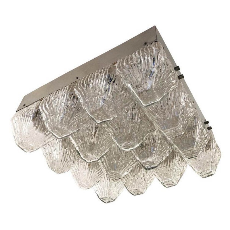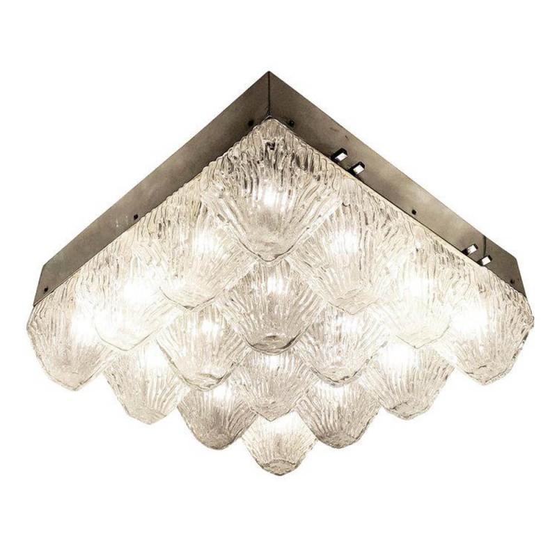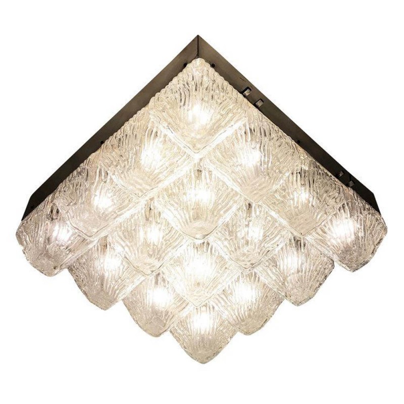 Large Mid-Century fixture with sixteen textured “pyramid” shaped glasses. Each glass hides one candelabra socket providing an abundant amount of light. Originally intended to be hung from two or four points, it can be modified to be used as a flush mount. In our continuing search for new discoveries, we often come in contact with original designers. That leads up to a continuing expansion of our stock. Still keeping the same goal in mind: to offer a vast choice, unique, decorative and stylish. All aspects can be customized- hardware finish, dimension (including dramatic overall heights), and the most current LED illumination options. Having created custom chandeliers for over three decades, we specialize in bringing lighting concepts into reality, whether your inspiration comes from a rough sketch, an existing chandelier, our original concepts, or even your own creative imagination. Large or small, our team can meet the challenge. Birthed from the distinct design wardrobe of Alan Mizrahi Lighting, this piece promises to deliver only the highest standard in design and materials.
