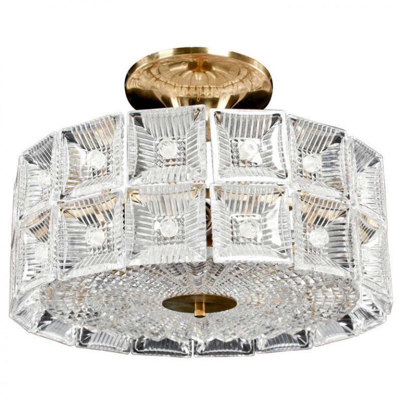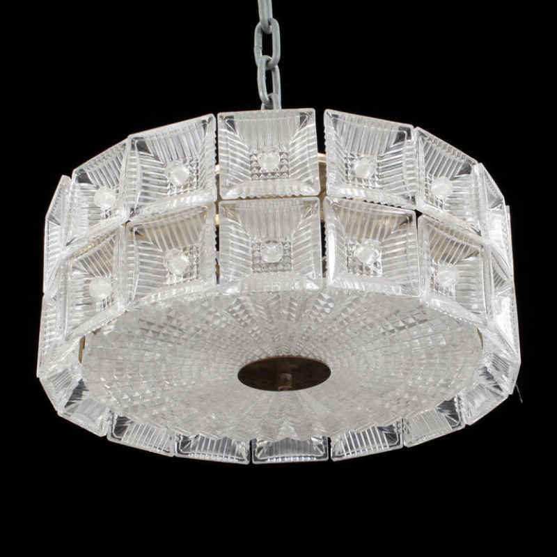 Here, we have an exquisitely designed Orrefors Vintage style model that is decadently made of clear, textured glass. This glass is arranged on all sides of the piece and is truly something you have to see in person to really see how much of an impact it will make. It's not only surrounded on the frame by these glass pieces, but its underside is made of glass as well. In addition, on its underside, it is embellished with a metallic finish that is very classy and balances out the other crystal beautifully, creating a piece that is truly one of a kind for your space.