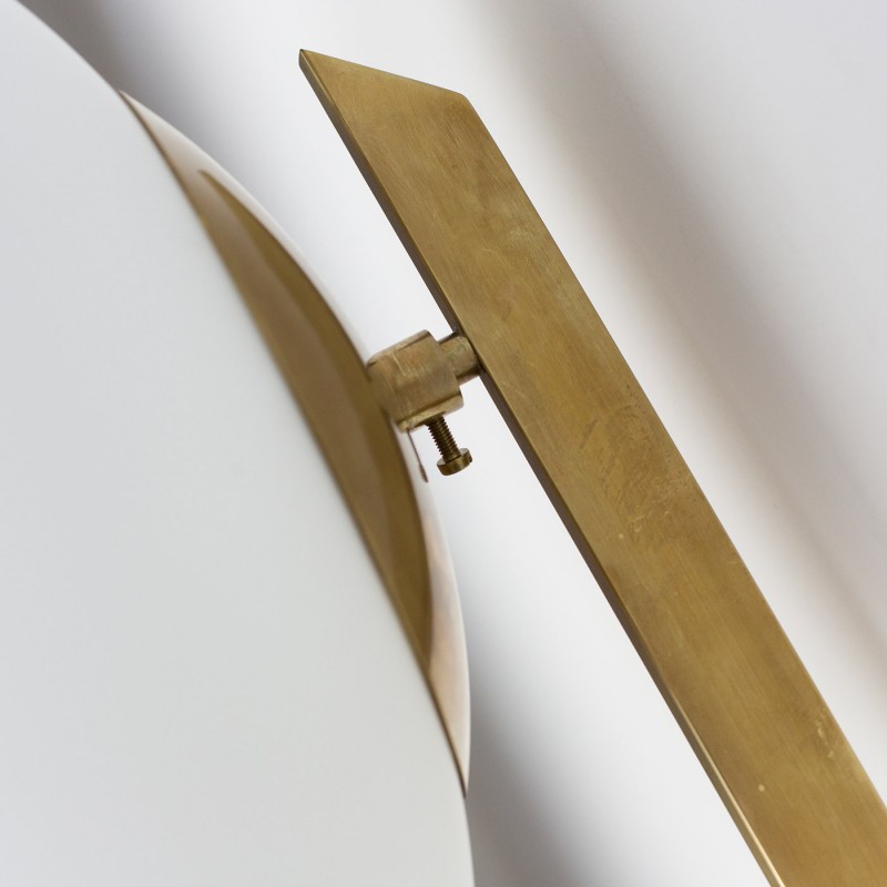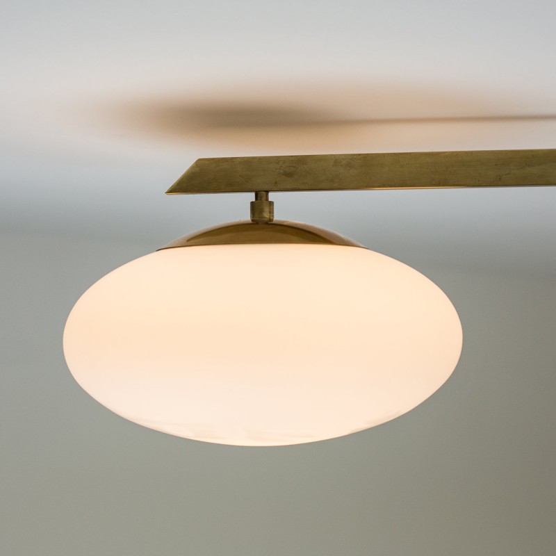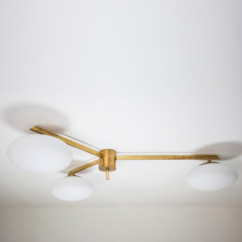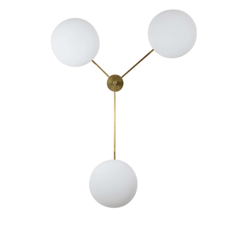 An original lamp characterized by a triangular shape in brass with 3 opaline globes at its ends. it's an elegant piece that doesn't have weird or bizarre colors and thus it can be placed anywhere. it can be wired both for Europe and North America and it can work with both led bulbs or incandescent ones (not included).