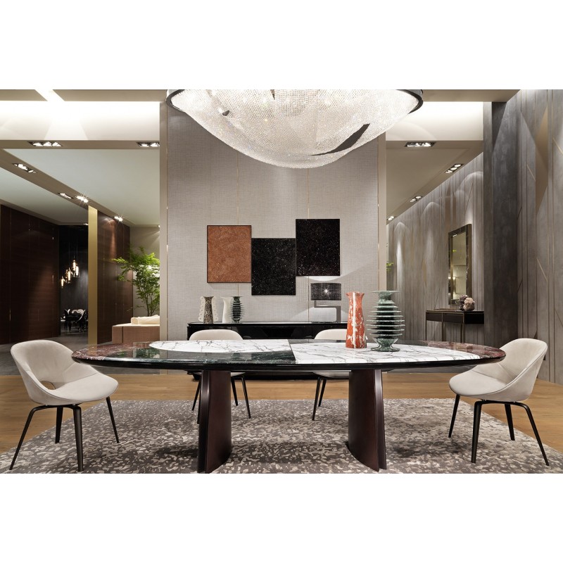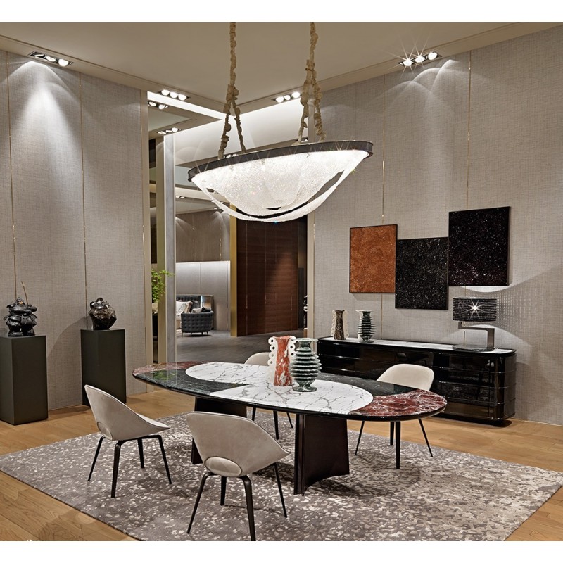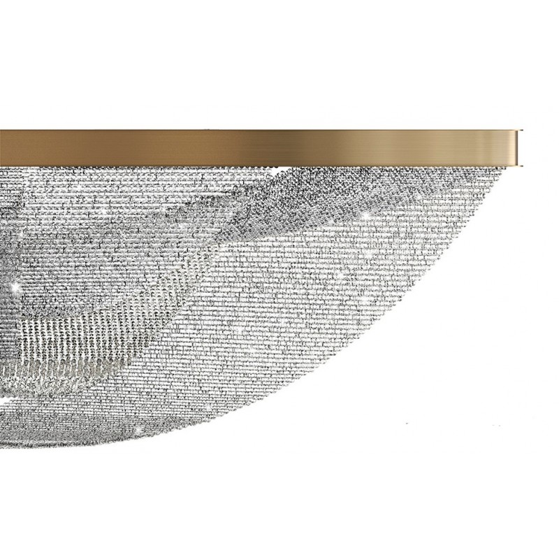 Luxury Italian Sylar ceiling or suspension lamp, with oval shape, made of five high-end crystal mesh hanging drapes, crossed at different heights. The support structure of this designer suspension lamp is in brushed stainless steel, 20 G9 light system. Extraordinary Italian Lighting with the option of having an exclusive audio system with two speakers integrated. Having created custom chandeliers for over three decades, we specialize in bringing lighting concepts into reality, whether your inspiration comes from a rough sketch, an existing chandelier, our original concepts, or even your own creative imagination. Large or small, our team can meet the challenge.